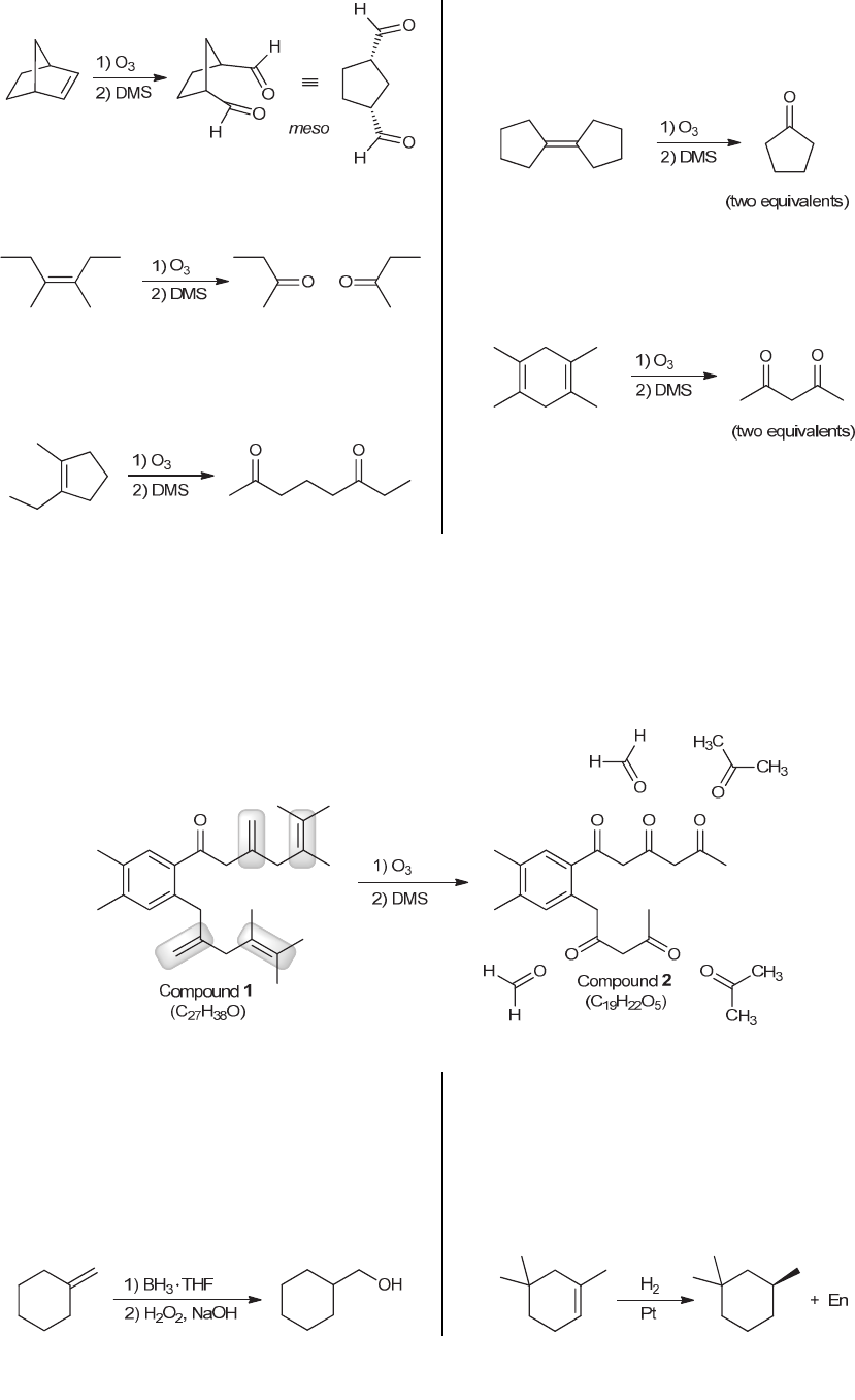 CHAPTER 8 251 (f) The C=C bond is split apart and redrawn as two C=O bonds, giving two equivalents of the same product: 8.29. (a) We can draw the starting alkene by removing the two oxygen atoms from the product, and connecting the sp2 hybridized carbon atoms as a C=C bond: (b) In this case, the starting alkene has ten carbon atoms while the product has only five carbon atoms. Therefore, one equivalent of the starting alkene must produce two equivalents of the product: (c) In this case, the starting alkene has ten carbon atoms while the product has only five carbon atoms. Therefore, one equivalent of the starting alkene must produce two equivalents of the product: 8.30. The starting material (C27H38O) has only one oxygen atom, while compound 2 (C19H22O5) has five oxygen atoms. The insertion of four oxygen atoms (and the production of four small molecules) indicates that four C=C bonds (highlighted below) undergo ozonolysis. The other three C=C bonds (in the ring) are part of the aromatic system, which is unreactive toward ozonolysis, as mentioned in the problem statement. To draw the products of ozonolysis, each C=C bond is split apart and redrawn as two C=O bonds. This gives compound 2, shown below, along with two molecules of formaldehyde (CH2O) and two molecules of acetone ((CH3)2CO). 8.31. (a) The reagents indicate a hydroboration-oxidation, so the net result will be the addition of H and OH across the alkene. For the regiochemical outcome, we expect an anti-Markovnikov addition, so the OH group is installed at the less-substituted position. The stereochemical outcome (syn addition) is not relevant in this case, because the product has no chiral centers: (b) The reagents indicate a hydrogenation reaction, so the net result will be the addition of H and H across the alkene. The regiochemical outcome is not relevant because the two groups added (H and H) are identical. We expect the reaction to proceed via a syn addition, but only one chiral center is formed. Therefore, both enantiomers are obtained because syn addition can occur from either face of the starting alkene: www.MyEbookNiche.eCrater.com