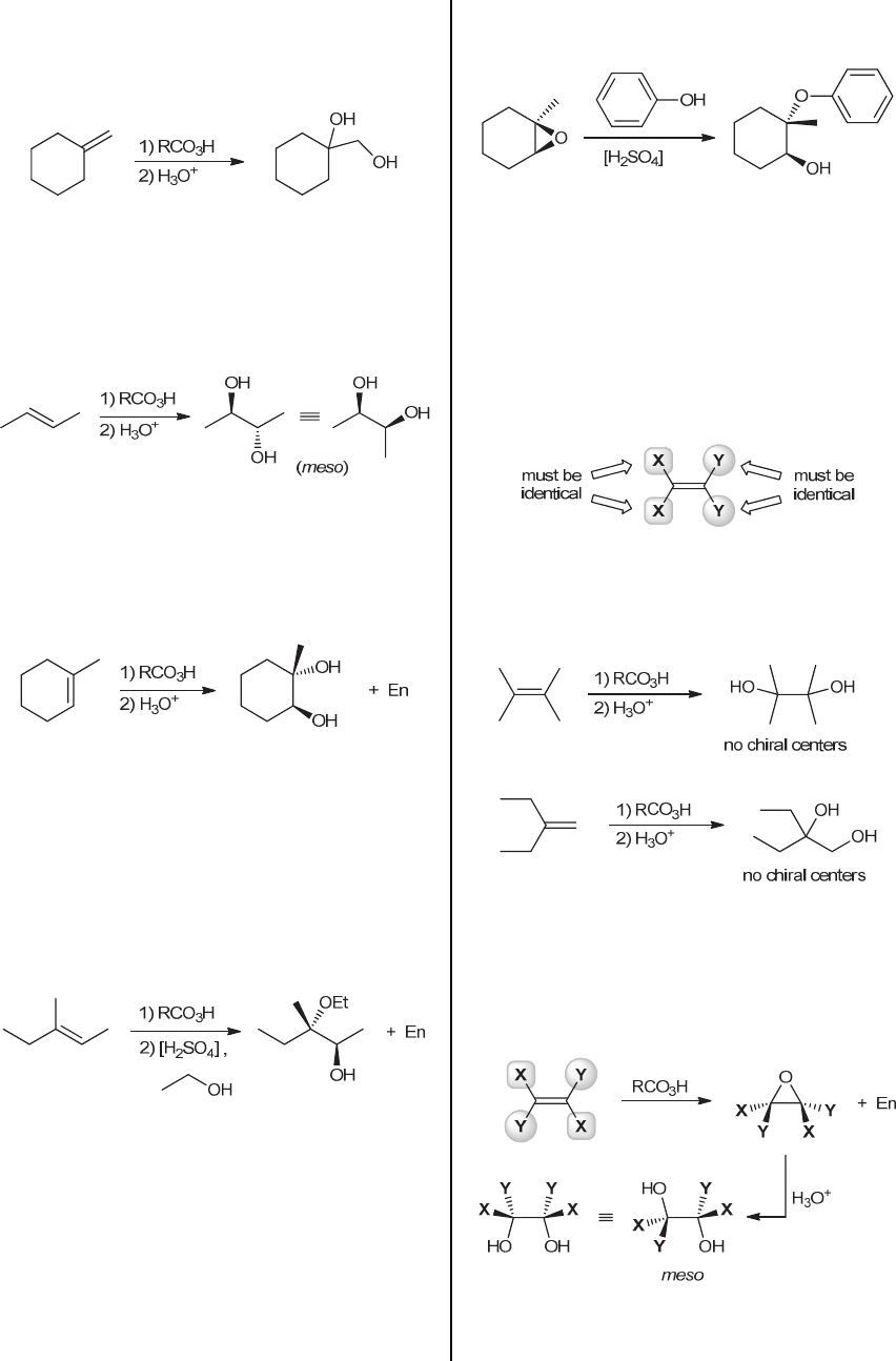 CHAPTER 8 249 (d) Treating an alkene with a peroxy acid followed by aqueous acid results in the addition of OH and OH across the alkene. In this case, the product has no chiral centers, so stereochemistry is not a relevant consideration. (e) Treating an alkene with a peroxy acid followed by aqueous acid results in the addition of OH and OH across the alkene. In this case, two new chiral centers are generated. However, the anti addition results in the formation of a meso compound: (f) Treating an alkene with a peroxy acid followed by aqueous acid results in the addition of OH and OH across the alkene. In this case, two new chiral centers are generated, so we expect only the pair of enantiomers that would result from anti addition: 8.25. (a) Treating an alkene with a peroxy acid results in an epoxide. Further treatment of the epoxide with ethanol under acid conditions results in a ring opening reaction in which ethanol serves as the nucleophile. Nucleophilic attack occurs at the more-substituted (tertiary) position, so the net result is the addition of OH and OEt across the alkene, with the latter being installed at the more- substituted position, as shown: (b) Treatment of the epoxide with phenol (C6H5OH) under acid conditions results in a ring opening reaction in which the oxygen atom of phenol serves as the nucleophilic center. Nucleophilic attack occurs at the more-substituted (tertiary) position, so the net result is the addition of OH and OR (where R is C6H5) across the alkene, with the latter being installed at the more- substituted position. Since the starting epoxide is enantiomerically pure (we are starting only with the enantiomer shown), we expect an enantiomerically pure product (not a mixture of enantiomers), as shown. 8.26. (a) Compound A is converted to an epoxide upon treatment with a peroxy acid, so compound A must be an alkene. There are many alkenes with the molecular formula C6H12, and it would be time-consuming to try to draw them all. Instead, we notice the following: in order for the product to have no chiral centers, each of the vinylic positions must already contain two identical groups, like this: There are only two alkenes with the molecular formula C6H12 that fit this criterion: (b) In order to be a meso compound, the resulting diol must contain two chiral centers, as well as reflectional symmetry (such as an internal plane of symmetry). In order to achieve this result, the starting alkene must have the following structural features: The identity of X and Y must be different, or the resulting diol would have no chiral centers. There is www.MyEbookNiche.eCrater.com