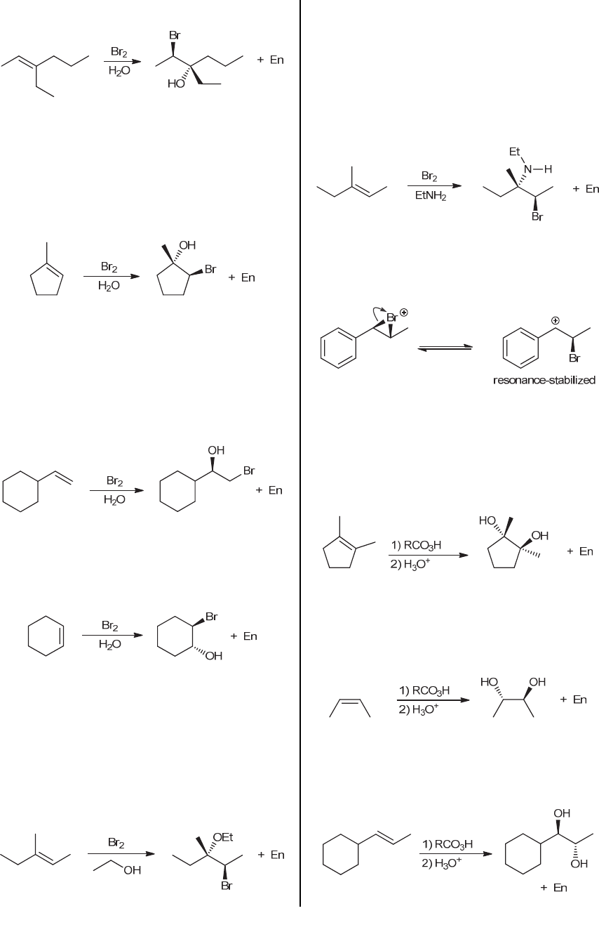 248 CHAPTER 8 expect only the pair of enantiomers that would result from anti addition. (b) Treating an alkene with molecular bromine (Br2) and water results in the addition of OH and Br across the alkene (halohydrin formation). The OH group is expected to be installed at the more-substituted position, while Br is installed at the less-substituted position. In this case, two new chiral centers are generated, so we expect only the pair of enantiomers that would result from anti addition. (c) Treating an alkene with molecular bromine (Br2) and water results in the addition of OH and Br across the alkene (halohydrin formation). The OH group is expected to be installed at the more-substituted position, while Br is installed at the less-substituted position. In this case, only one new chiral center is generated, so we expect both possible enantiomers (formation of the initial bromonium ion can occur on either face of the bond with equal likelihood). (d) Treating an alkene with molecular bromine (Br2) and water results in the addition of OH and Br across the alkene (halohydrin formation). In this case, two new chiral centers are generated, so we expect only the pair of enantiomers that would result from anti addition. 8.22. (a) The alkene reacts with molecular bromine to give a bromonium ion, which is then attacked by a molecule of solvent (EtOH, in this case, rather than H2O). The result is the addition of Br and OEt (rather than the addition of Br and OH). The OEt group is expected to be installed at the more-substituted position, while Br is installed at the less-substituted position. In this case, two new chiral centers are generated, so we expect only the pair of enantiomers that would result from anti addition: (b) The alkene reacts with molecular bromine to give a bromonium ion, which is then captured by a molecule of solvent (EtNH2, in this case, rather than H2O). The result is the addition of Br and NHEt (rather than the addition of Br and OH). The ethylamino group (NHEt) is expected to be installed at the more-substituted position, while Br is installed at the less-substituted position. In this case, two new chiral centers are generated, so we expect only the pair of enantiomers that would result from anti addition: 8.23. The bromonium ion can open (before a bromide ion attacks), forming a resonance-stabilized carbocation. This carbocation is trigonal planar and can be attacked from either side: 8.24. (a) Treating an alkene with a peroxy acid followed by aqueous acid results in the addition of OH and OH across the alkene. In this case, two new chiral centers are generated, so we expect only the pair of enantiomers that would result from anti addition: (b) Treating an alkene with a peroxy acid followed by aqueous acid results in the addition of OH and OH across the alkene. In this case, two new chiral centers are generated, so we expect only the pair of enantiomers that would result from anti addition: (c) Treating an alkene with a peroxy acid followed by aqueous acid results in the addition of OH and OH across the alkene. In this case, two new chiral centers are generated, so we expect only the pair of enantiomers that would result from anti addition: www.MyEbookNiche.eCrater.com