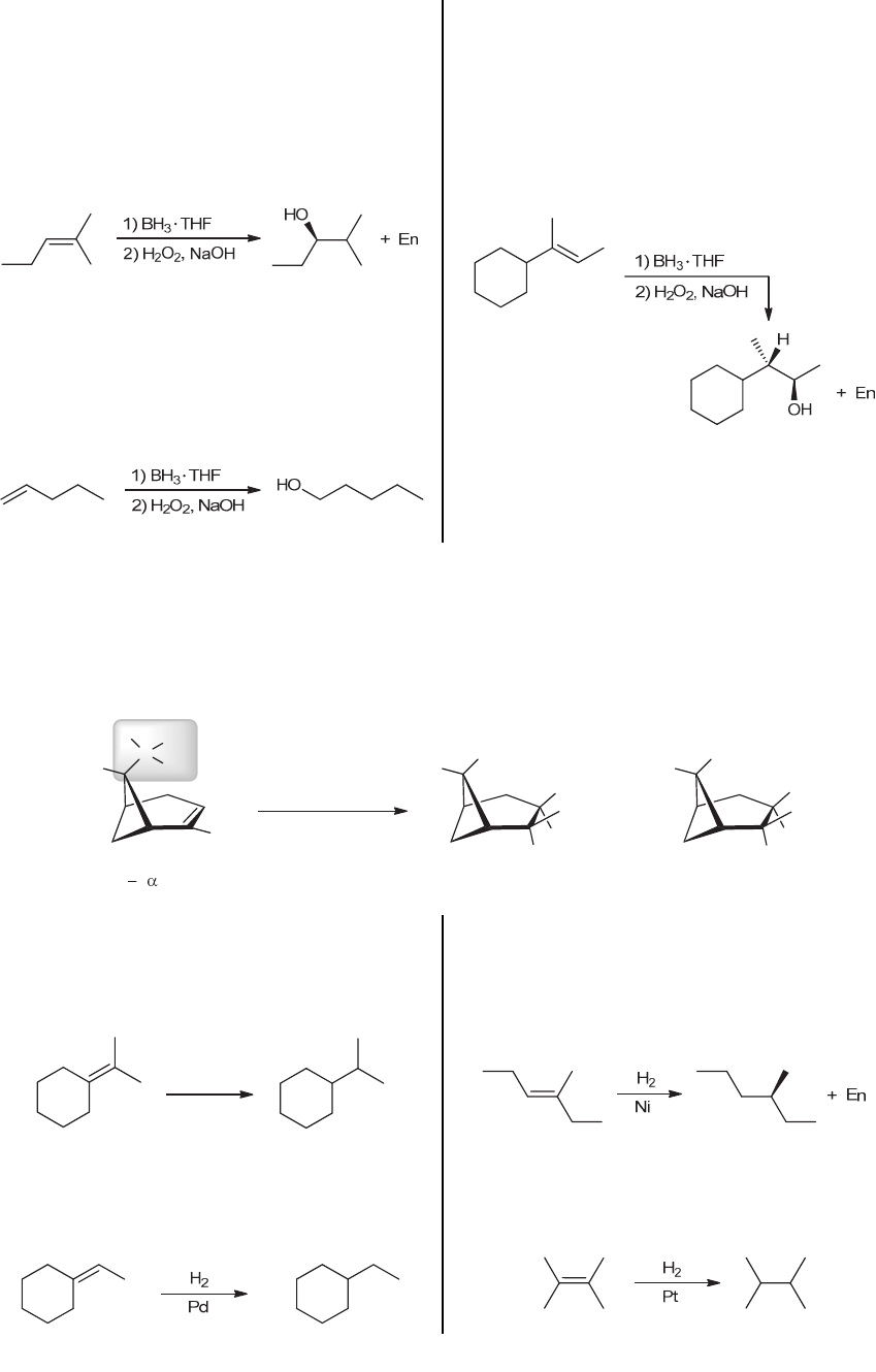 246 CHAPTER 8 (d) The reagents indicate a hydroboration-oxidation. The net result of this two-step process is the anti- Markovnikov addition of H and OH across the bond. That is, the OH group is installed at the less-substituted position, while the H is installed at the more substituted position. In this case, only one chiral center is created. Since syn addition can take place from either face of the alkene with equal likelihood, we expect a pair of enantiomers, as shown: (e) The reagents indicate a hydroboration-oxidation. The net result of this two-step process is the anti- Markovnikov addition of H and OH across the bond. That is, the OH group is installed at the less-substituted position, while the H is installed at the more substituted position. In this case, no chiral centers are created, so the requirement for syn addition is irrelevant. (f) The reagents indicate a hydroboration-oxidation. The net result of this two-step process is the anti- Markovnikov addition of H and OH across the bond. That is, the OH group is installed at the less-substituted position, while the H is installed at the more substituted position. In this case, two chiral centers are created. Therefore, the stereochemical requirement for syn addition determines that the H and OH are added on the same face of the alkene, giving the following products: 8.17. The problem statement indicates that this is a hydroboration-oxidation sequence, the net result of which is an anti- Markovnikov addition of H and OH across the bond. That is, the OH group is installed at the less-substituted position, while the H is installed at the more substituted position. In this case, two chiral centers are created. Therefore, the stereochemical requirement for syn addition determines that the H and OH are added on the same face of the alkene, giving the products shown. Note that the highlighted methyl group creates steric hindrance on the top face of the ring, so the major product arises from hydroboration from the bottom face: Major Minor( )- -Pinene C H3C CH3 H H H CH3 H3C H OH H CH3 CH3 H3C OH H CH3 H +1) B2H6 2) H2O2, NaOH 8.18. (a) The reagents indicate a catalytic hydrogenation process, so we expect the addition of H and H across the alkene. In this case, the product does not have a chiral center, so stereochemistry is not a relevant consideration. H2 Ni (b) The reagents indicate a catalytic hydrogenation process, so we expect the addition of H and H across the alkene. In this case, the product does not have a chiral center, so stereochemistry is not a relevant consideration. (c) The reagents indicate a catalytic hydrogenation process, so we expect the addition of H and H across the alkene. In this case, the product has one chiral center, so we expect both possible enantiomers (syn addition can occur from either face of the bond). (d) The reagents indicate a catalytic hydrogenation process, so we expect the addition of H and H across the alkene. In this case, the product does not have a chiral center, so stereochemistry is not a relevant consideration. www.MyEbookNiche.eCrater.com