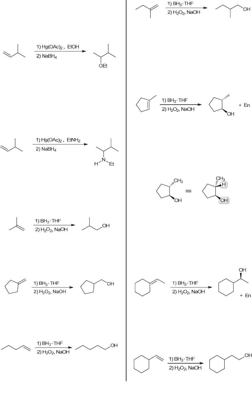 CHAPTER 8 245 water, H2O, is used as the reagent). If ethanol (EtOH) is used as the reagent instead of water, then Z = OEt, so we expect Markovnikov addition of ethanol (H and OEt) across the alkene, with the ethoxy (OEt) group being installed at the more substituted (secondary) position, rather than the less substituted (primary) position. (b) Oxymercuration-demercuration involves the addition of H-Z across the double bond (where Z = OH when water, H2O, is used as the reagent). If ethylamine (EtNH2) is used as the reagent instead of water, then Z = NHEt, so we expect Markvnikov addition of H and NHEt across the alkene, with the ethylamino group (NHEt) being installed at the more substituted (secondary) position, rather than the less substituted (primary) position. 8.14. (a) Hydroboration-oxidation results in the anti- Markovnikov addition of water (H and OH) across the bond. That is, the OH group is installed at the less- substituted (primary) position, rather than the more substituted (tertiary) position: (b) Hydroboration-oxidation results in the anti- Markovnikov addition of water (H and OH) across the bond. That is, the OH group is installed at the less- substituted (primary) position, rather than the more substituted (tertiary) position: (c) Hydroboration-oxidation results in the anti- Markovnikov addition of water (H and OH) across the bond. That is, the OH group is installed at the less- substituted (primary) position, rather than the more substituted (secondary) position: 8.15. There is only one alkene that will afford the desired product upon hydroboration-oxidation: 8.16. (a) The reagents indicate a hydroboration-oxidation. The net result of this two-step process is the anti- Markovnikov addition of H and OH across the bond. That is, the OH group is installed at the less-substituted position, while the H is installed at the more substituted position. In this case, two chiral centers are created. Therefore, the stereochemical requirement for syn addition determines that the H and OH are added on the same face of the alkene, giving the following products: In this case, it might seem as if there was an anti addition, rather than a syn addition, because we see that the product has one wedge and one dash. But this is an optical illusion. Recall, that most hydrogen atoms are not drawn in bond-line drawings, so the H that was added during the process has not been drawn. However, if we draw that hydrogen atom, we will see that the H and OH were indeed added in a syn fashion: (b) The reagents indicate a hydroboration-oxidation. The net result of this two-step process is the anti- Markovnikov addition of H and OH across the bond. That is, the OH group is installed at the less-substituted position, while the H is installed at the more substituted position. In this case, only one chiral center is created. Since syn addition can take place from either face of the alkene with equal likelihood, we expect a pair of enantiomers, as shown: (c) The reagents indicate a hydroboration-oxidation. The net result of this two-step process is the anti- Markovnikov addition of H and OH across the bond. That is, the OH group is installed at the less-substituted position, while the H is installed at the more substituted position. In this case, no chiral centers are created, so the requirement for syn addition is irrelevant. www.MyEbookNiche.eCrater.com