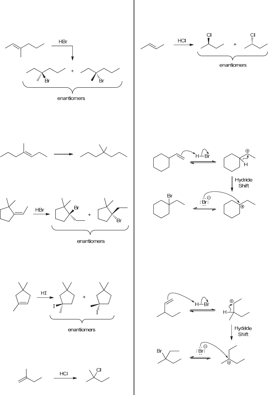 CHAPTER 8 241 8.5. (a) In this case, Markovnikov addition of HBr involves the formation of a new chiral center. As such, we expect both possible stereochemical outcomes. That is, we expect a pair of enantiomers, as shown: (b) In this case, Markovnikov addition of HCl does not involve the formation of a new chiral center (the carbon of the resulting alkyl halide bears two propyl groups): HCl Cl (c) In this case, Markovnikov addition of HBr involves the formation of a new chiral center. As such, we expect both possible stereochemical outcomes. That is, we expect a pair of enantiomers, as shown: (d) In this case, Markovnikov addition of HI involves the formation of a new chiral center. As such, we expect both possible stereochemical outcomes. That is, we expect a pair of enantiomers, as shown: (e) In this case, Markovnikov addition of HCl does not involve the formation of a new chiral center (the carbon of the resulting alkyl halide bears two methyl groups): (f) In this case, addition of HCl involves the formation of a new chiral center. As such, we expect both possible stereochemical outcomes. That is, we expect a pair of enantiomers, as shown: 8.6. (a) Protonation of the alkene requires two curved arrows, as shown, and leads to the more stable, secondary carbocation (rather than a primary carbocation). This secondary carbocation then undergoes a hydride shift, shown with one curved arrow, generating a more stable, tertiary carbocation. In the final step (nucleophilic attack), the carbocation is captured by a bromide ion. This step requires one curved arrow, going from the nucleophile (bromide) to the electrophile (the carbocation), as shown: (b) Protonation of the alkene requires two curved arrows, as shown, and leads to the more stable, secondary carbocation (rather than a primary carbocation). This secondary carbocation then undergoes a hydride shift, shown with one curved arrow, generating a more stable, tertiary carbocation. In the final step (nucleophilic attack), the carbocation is captured by a bromide ion. This step requires one curved arrow, going from the nucleophile (bromide) to the electrophile (the carbocation), as shown: (c) Protonation of the alkene requires two curved arrows, generating a secondary carbocation. This secondary carbocation then undergoes a methyl shift, shown with one curved arrow, generating a more stable, www.MyEbookNiche.eCrater.com