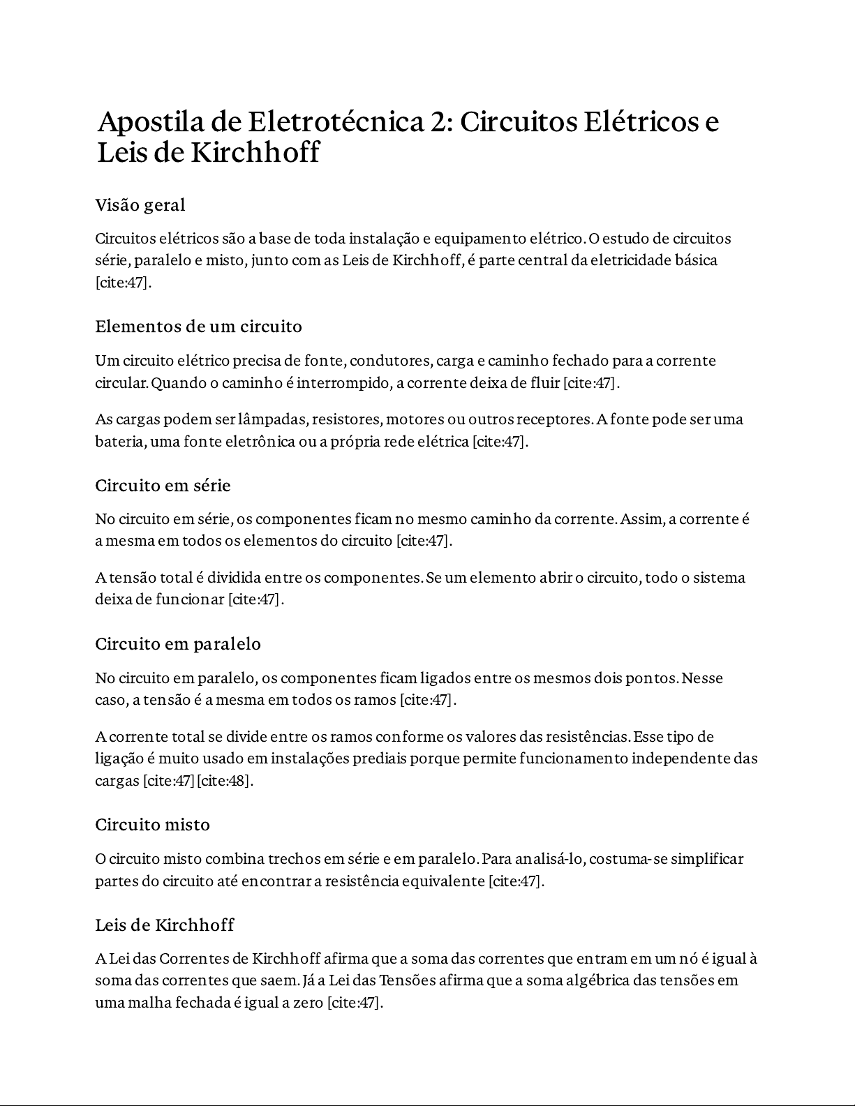 Circuitos elétricos são a base de toda instalação e equipamento elétrico. O estudo de circuitos série, paralelo e misto, junto com as Leis de Kirchhoff, é parte central da eletricidade básica [cite:47]. Um circuito elétrico precisa de fonte, condutores, carga e caminho fechado para a corrente circular. Quando o caminho é interrompido, a corrente deixa de fluir [cite:47]. As cargas podem ser lâmpadas, resistores, motores ou outros receptores. A fonte pode ser uma bateria, uma fonte eletrônica ou a própria rede elétrica [cite:47]. No circuito em série, os componentes ficam no mesmo caminho da corrente. Assim, a corrente é a mesma em todos os elementos do circuito [cite:47]. A tensão total é dividida entre os componentes. Se um elemento abrir o circuito, todo o sistema deixa de funcionar [cite:47]. No circuito em paralelo, os componentes ficam ligados entre os mesmos dois pontos. Nesse caso, a tensão é a mesma em todos os ramos [cite:47]. A corrente total se divide entre os ramos conforme os valores das resistências. Esse tipo de ligação é muito usado em instalações prediais porque permite funcionamento independente das cargas [cite:47][cite:48]. O circuito misto combina trechos em série e em paralelo. Para analisá-lo, costuma-se simplificar partes do circuito até encontrar a resistência equivalente [cite:47]. A Lei das Correntes de Kirchhoff afirma que a soma das correntes que entram em um nó é igual à soma das correntes que saem. Já a Lei das Tensões afirma que a soma algébrica das tensões em uma malha fechada é igual a zero [cite:47]. Apostila de Eletrotécnica 2: Circuitos Elétricos e Leis de Kirchhoff Visão geral Elementos de um circuito Circuito em série Circuito em paralelo Circuito misto Leis de Kirchhoff Essas leis são fundamentais para resolver circuitos mais complexos, especialmente quando a simples aplicação da Lei de Ohm não é suficiente [cite:47]. �. Quais são os elementos básicos de um circuito? �. O que caracteriza um circuito em série? �. O que caracteriza um circuito em paralelo? �. O que diz a Lei das Correntes de Kirchhoff? �. Por que o circuito em paralelo é comum em instalações prediais? �. Fonte, condutores, carga e caminho fechado. �. Mesma corrente em todos os componentes. �. Mesma tensão em todos os ramos. �. A soma das correntes que entram em um nó é igual à soma das que saem. �. Porque as cargas podem operar com relativa independência [cite:47][cite:48]. Exercícios Gabarito comentado