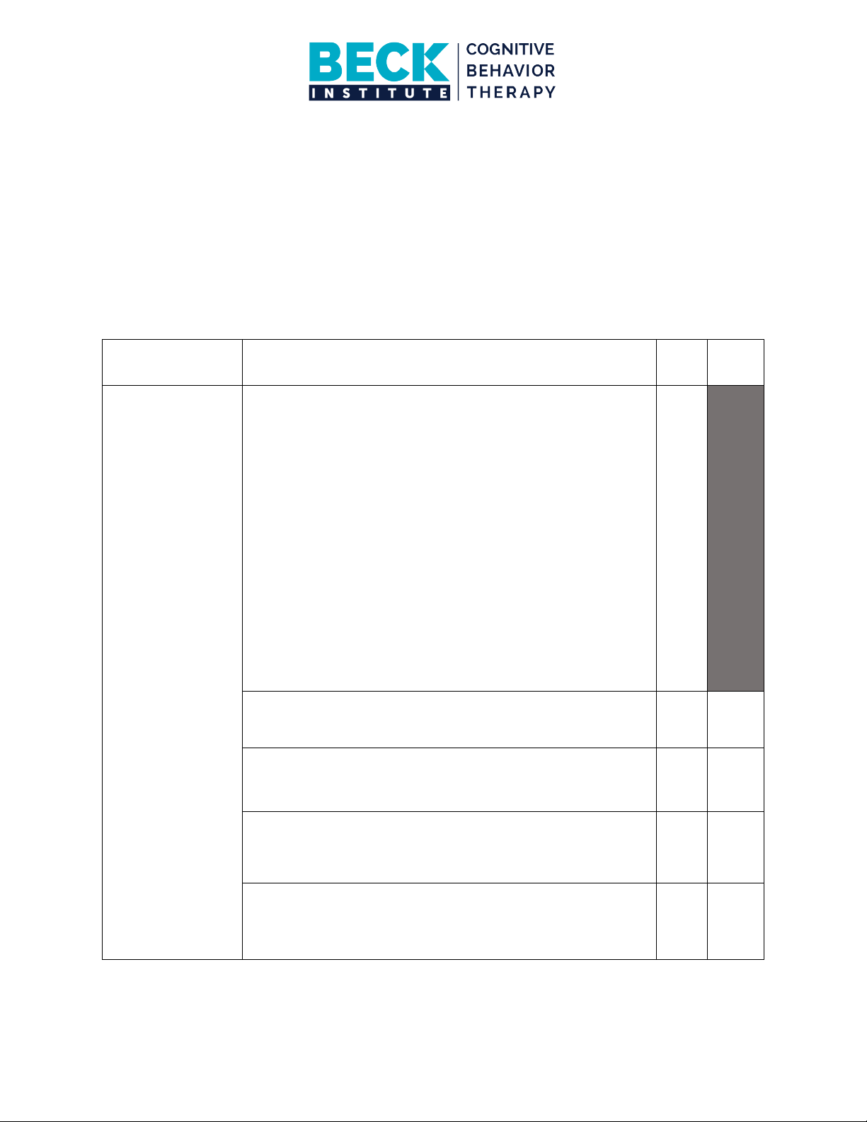 © 2022 A. Miller c/o Beck Institute for Cognitive Behavior Therapy Beck Institute for Cognitive Behavior Therapy One Belmont Avenue, Suite 503 | Bala Cynwyd, PA 19004 | 610-664-3020 beckinstitute.org Cognitive Therapy Rating Scale-Revised Scoring Rubric Scoring Key: 0 = Item was NOT PRESENT. 1 = Item was present but was UNSATISFACTORY. 2 = Item was present and performed with MODERATE SKILL. 3 = Item was present and performed VERY WELL. CTRS-R Item Criteria Questions Y/N Score 1. Agenda Did the therapist... • Provide transition to the previous session? ___ • Identify significant events [positive and/or negative] since previous session? ___ • Review Action Plan [complete review may be done as part of the agenda]? ___ • Conduct a mood check? ___ • Identify specific goals or problems to work on during the session? ___ If therapist completed none of the above items 0 If therapist completed one or more but not all of the above items 1 If therapist completed all five of the above items 2 If therapist completed all five of the above items PLUS… • Made certain that all items important to the client were addressed and prioritized; 3 © 2022 A. Miller c/o Beck Institute for Cognitive Behavior Therapy Beck Institute for Cognitive Behavior Therapy One Belmont Avenue, Suite 503 | Bala Cynwyd, PA 19004 | 610-664-3020 beckinstitute.org • Followed the agenda throughout the session unless there was an overt discussion about deviating from the agenda. CTRS-R Item Criteria Questions Y/N Score 2. Feedback Did the therapist... • Ascertain the client’s reaction to the session, the therapist, or the therapeutic process? ___ • Ensure that the client understood and agreed with the treatment plan? ___ • Respond appropriately to feedback? ___ If therapist completed none of the above items 0 If therapist completed one or more but not all of the above items 1 If therapist completed all three of the above items 2 If the therapist completed all three of the above items PLUS… The therapist fluidly requested feedback throughout the session [agenda, transitions, use of techniques, and/or developing an Action Plan]. 3 © 2022 A. Miller c/o Beck Institute for Cognitive Behavior Therapy Beck Institute for Cognitive Behavior Therapy One Belmont Avenue, Suite 503 | Bala Cynwyd, PA 19004 | 610-664-3020 beckinstitute.org CTRS-R Item Criteria Questions Y/N Score 3. Understanding Did the therapist... • Demonstrate they generally heard and understood the content of what the client expressed through repeating, summarizing, etc. what the client said during the session? ___ If therapist did not demonstrate the above item 0 If therapist inconsistently listened and reflected the client’s statements 1 If therapist listened and reflected the client’s statements throughout the session 2 If the therapist consistently listened and reflected throughout the session PLUS… • Therapist demonstrated recognition of understanding the client’s emotional state through acknowledgement, reflection, empathy; • Discussed the client’s emotional state within the context of the conceptualization; • Demonstration of emotional state is accomplished by a combination of words, expressions, gestures, tone, and body language throughout the session. 3 © 2022 A. Miller c/o Beck Institute for Cognitive Behavior Therapy Beck Institute for Cognitive Behavior Therapy One Belmont Avenue, Suite 503 | Bala Cynwyd, PA 19004 | 610-664-3020 beckinstitute.org CTRS-R Item Criteria Questions Y/N Score 4. Interpersonal Effectiveness Throughout the session, did the therapist… • Demonstrate concern for client and help the client reach their goals? ___ • Provide positive reinforcement for actions taken by the client (e.g. completing action plans)? ___ • Maintain professional and ethical behavior? ___ If therapist completed none of the above items 0 If therapist completed one or two, but not all three of the above items 1 If therapist completed all three of the above items 2 If the therapist completed all three of the above items PLUS… • Through words, gestures, and expressions, demonstrated warmth, genuineness, and unconditional acceptance (absence of judgment) by making positive statements about the client’s character or characteristics (e.g. strength, determination, caring, vision, values, integrity, etc.) 3 © 2022 A. Miller c/o Beck Institute for Cognitive Behavior Therapy Beck Institute for Cognitive Behavior Therapy One Belmont Avenue, Suite 503 | Bala Cynwyd, PA 19004 | 610-664-3020 beckinstitute.org CTRS-R Item Criteria Questions Y/N Score 5. Collaboration Did the therapist... • Ask the client for input/agreement when setting the agenda and respond appropriately to the input? ___ • Ask the client for input/agreement when selecting or using CBT techniques and respond appropriately to the input? ___ • Ask the client for input/agreement when determining the Action Plan to be followed between sessions and responded appropriately to the input? ___ If therapist completed none of the above items 0 If therapist completed one or more but not all three of the above items 1 If therapist completed all three of the above items 2 If the therapist completed all three of the above items PLUS… • Throughout the session, the therapist made a consistent effort to invite client’s participation/agreement on every major decision about the session and responded appropriately. The collaboration resulted in a mutually agreeable direction for the session. 3 © 2022 A. Miller c/o Beck Institute for Cognitive Behavior Therapy Beck Institute for Cognitive Behavior Therapy One Belmont Avenue, Suite 503 | Bala Cynwyd, PA 19004 | 610-664-3020 beckinstitute.org CTRS-R Item Criteria Questions Y/N Score 6. Pacing and efficient use of time Did the therapist... • Allocate appropriate time for o transition and agenda setting; o intervention(s); o feedback and action planning? ___ • Complete the session within 40 – 60 minutes? ___ If the