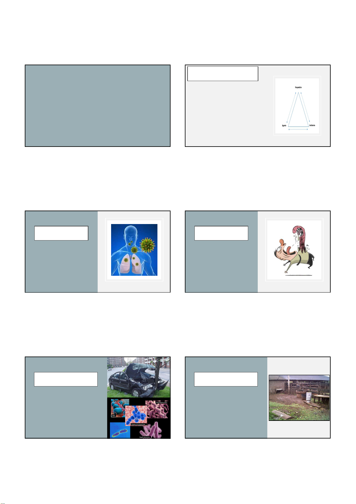 29/08/2023 FONTES DE INFECÇÃO E CADEIA DE TRANSMISSÃO Marcus Falcão mdfalcao@gmail.com EPIDEMIOLOGIA Ciência que estuda a ocorrência da doenças em populações, suas causas determinantes, medidas profiláticas para o seu controle e até sua erradicação. • História natural das doenças • Tríade epidemiológica • Cadeia epidemiológica • Conhecimento propagação doenças • Adoção de medidas profiláticas INFECÇÃO Processo caracterizado pela invasão do organismo do hospedeiro, por um agente biológico e sua subsequente multiplicação (Mitcherlich, 1972). HOSPEDEIRO Todo e qualquer ser vivo que albergue um agente em seu organismo ou ainda o organismo que propicie alimento ou abrigo a um organismo de outra espécie. AGENTE ETIOLÓGICO Qualquer substância, elemento, variável ou fator, animado ou inanimado, cuja presença mediante contato efetivo com hospedeiro, constitui-se em estímulo para iniciar ou perpetuar um processo doença AMBIENTE • Fatores físicos • Fatores biológicos • Fatores sócio-econômicos 1 2 3 4 5 6 29/08/2023 CADEIA EPIDEMIOLÓGICA DA DOENÇA • Quem hospeda e transmite o A. E.? • Como o A. E. abandona o hospedeiro? • Que recurso utiliza o A. E. para alcançar um novo hospedeiro? • Como se hospeda o A. E. em um novo hospedeiro? FONTE DE INFECÇÃO HOSPEDEIRO SUSCETÍVEL VIA DE TRANSMISSÃO VIA DE ELIMINAÇÃO PORTA DE ENTRADA FONTE DE INFECÇÃO • Qualquer hospedeiro vertebrado que alberga um determinado agente etiológico e pode eliminá-lo de seu organismo, isto é, transmiti-lo. CLASSIFICAÇÃO DAS FONTES DE INFECÇÃO • Quanto à característica do agravo –Doentes: –Hospedeiros que revelam sinais, ainda que indefinidos, de comprometimento do equilíbrio orgânico, atribuíveis a agentes existentes em seu organismo. CLASSIFICAÇÃO DAS FONTES DE INFECÇÃO • Quanto à característica do agravo –Doentes típicos: –Sinais clínicos BASTANTE característicos (Mixomatose coelhos; Peste Suína; Peste bovina; Cólera aviária) CLASSIFICAÇÃO DAS FONTES DE INFECÇÃO • Quanto à característica do agravo –Doentes atípicos: –Sinais clínicos POUCO característicos. Extrema malignidade ou benignidade 7 8 9 10 11 12 29/08/2023 CLASSIFICAÇÃO DAS FONTES DE INFECÇÃO • Quanto à característica do agravo –Doentes em Fase prodrômica: –Doença em fase inicial. Observa- se alterações estado de saúde. Sinais INDEFINIDOS para diagnóstico clínico. Quadro clínico característico não manifestado (raiva canina). CLASSIFICAÇÃO DAS FONTES DE INFECÇÃO • Quanto à característica do agravo –Portadores Hospedeiros que ALBERGAM e ELIMINAM o agente etiológico de uma doença, em ausência de qualquer manifestação que possa ser caracterizada como indicativo de alteração de saúde , atribuível à presença do agente infeccioso em seu organismo. CLASSIFICAÇÃO DAS FONTES DE INFECÇÃO • Quanto à característica do agravo –Portadores Portadores sadios: Não apresentam sinais clínicos da doença. Não estão em período de incubação. Eliminam o agente etiológico Ex. Trichomonas foetus CLASSIFICAÇÃO DAS FONTES DE INFECÇÃO • Quanto à característica do agravo –Portadores Portadores em incubação: Funcionam como F. I. antes do aparecimento dos sinais clínicos. Apresentarão sinais no espaço de tempo correspondente ao P. I. da doença. Ex. Peste bovina e Raiva CLASSIFICAÇÃO DAS FONTES DE INFECÇÃO • Quanto à característica do agravo –Portadores • Portadores convalescente: Eliminam o agente etiológico após a cura clínica. – Ex. Laringotraqueíte aves 13 14 15 16 17 18 29/08/2023 CLASSIFICAÇÃO DAS FONTES DE INFECÇÃO • Quanto à característica do agravo –Comunicantes Introdução ou propagação do A.E. em uma população “Contatos” Estiveram expostos ao risco de infecção, não se podendo assegurar, “a priore” se estão ou não infectados CLASSIFICAÇÃO DAS FONTES DE INFECÇÃO • Quanto à característica do agravo –Reservatórios Dependência espécie principal considerada Demais vertebrados que atuam na disseminação dos agentes das enfermidades Enquadrado em qualquer categoria de F. I. Portador ou doente TRANSMISSÃO DAS DOENÇAS Transmissão de agentes infecciosos é o processo pelo qual o agente infeccioso oriundo de um indivíduo infectado, pessoa ou animal, com passagem ou não por intermediários vivos ou objetos inanimados, tem acesso ao meio interno de um novo hospedeiro Denomina os modos de transferência dos agentes infecciosos de um hospedeiro infectado à um hospedeiro suscetível. (Rouquaryol e Almeida Filho, 2003) PORTA DE ENTRADA São consideradas como as vias, pelas quais o agente infeccioso, consegue penetrar no organismo animal. As principais portas de entrada, são: a via respiratória, digestiva, conjuntival, galactófora, onfaloflébica, cutânea e gênito- urinária. P O R T A D E E N T R A D A http://www.mcguido.vet.br/brucel8.gif 19 20 21 22 23 24 29/08/2023 VIAS DE TRANSMISSÃO DIRETA - CONTÁGIO • contato direto com o animal ou agente INDIRETA • ingestão: água e alimentos • inalação: partículas de aerossóis • contato: fômites, solo, veículos • vetores: biológicos http://elplop.com/img/60183-707.jpg http://4.bp.blogspot.com/-amKA2P8XoRE5ajqA/s1600/m3.jpg VEÍCULOS Qualquer elemento que transporte determinado agente infeccioso. • Animado: Ser vivo que possa transportar passivamente o agente infeccioso. • Inanimado: Elementos capazes de transportar o agente infeccioso (água, alimentos e objetos contaminados como as agulhas, seringas, panos, arreios, escovas, entre outros. FÔMITES Pode-se utilizar o próprio conceito de veículo inanimado, pois são os objetos inanimados, contaminados que podem transportar agentes infecciosos para os animais ou homem, como baldes, toalhas, seringas, entre outros. https://bioamerica6.jimdo.com/epls-lec-4-transmisi%C3%B3n/ VETORES Organismos vivos que propiciam proteção e
