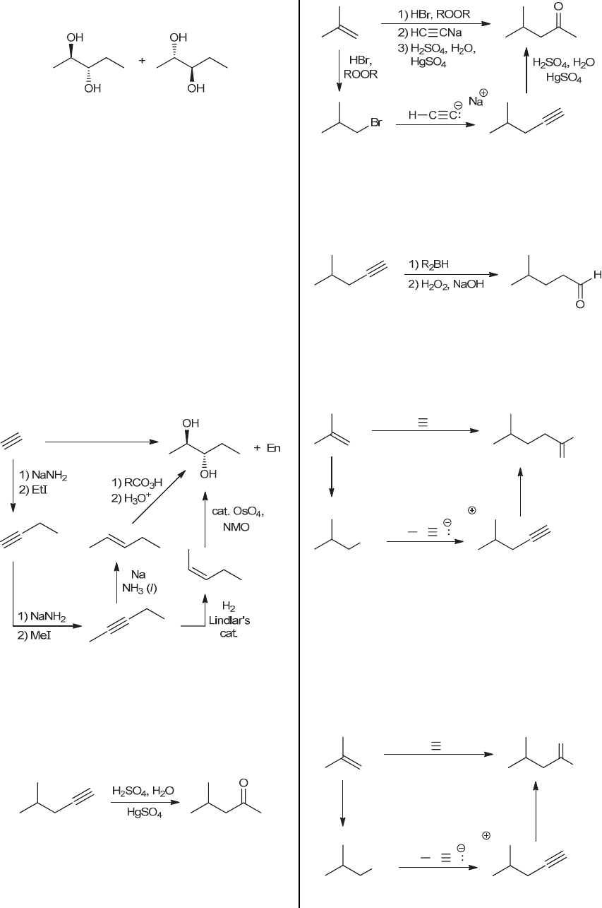 374 CHAPTER 11 11.20. We begin by drawing the desired products: These compounds have five carbon atoms, but our starting materials can contain no more than two carbon atoms. So our synthesis must involve the formation of carbon-carbon bonds. This can be accomplished via the alkylation of acetylene (a compound with two carbon atoms). The location of the functional groups (C2 and C3) indicates that we need two alkylation processes (one to install a methyl group and the other to install an ethyl group). This places the triple bond between C2 and C3, which enables the installation of the functional groups at those locations. Conversion of the internal alkyne into the desired product requires the addition of H and H to give an alkene, followed by the addition of OH and OH. In order to achieve the correct stereochemical outcome, both of these addition processes must be performed in an anti fashion, or both must be performed in a syn fashion. That is, we can perform an anti addition of H and H, followed by an anti addition of OH and OH, or we can perform a syn addition of H and H, followed by a syn addition of OH and OH, as shown: 11.21. (a) The starting material has four carbon atoms, and the product has six carbon atoms. So our synthesis must involve the installation of two carbon atoms. Also, the location of the functional group has been changed. The product is a methyl ketone, which can be made from a terminal alkyne (via acid catalyzed hydration): This alkyne can be made from the starting alkene via an anti-Markovnikov addition of HBr, followed by treatment with sodium acetylide, as shown here: (b) The starting material has four carbon atoms, and the product has six carbon atoms. So our synthesis must involve the installation of two carbon atoms. Also, the location of the functional group has been changed. The product is an aldehyde, which can be made from a terminal alkyne (via hydroboration-oxidation): As seen in the solution to part (a), this alkyne can be made from the starting alkene via an anti-Markovnikov addition of HBr, followed by treatment with sodium acetylide, as shown here: ROOR HBr, 1) HBr, ROOR 2) HC CNa C CH Na Br 1) R2BH 2) H2O2, NaOH 3) R2BH 4) H2O2, NaOH H O (c) The starting material has four carbon atoms, and the product has five carbon atoms. We have not learned a direct way of installing only one carbon atom. That is, two carbon atoms are installed (not one) if we convert the starting alkene into an alkyl halide (via an anti- Markovnikov addition), and then treat the alkyl halide with sodium acetylide. However, after installing two carbon atoms, we can remove one of them with ozonolysis, giving the product: ROOR HBr, 1) HBr, ROOR 2) HC CNa C CH Na OH Br 1) O3 2) H2O 3) O3 4) H2O O www.MyEbookNiche.eCrater.com