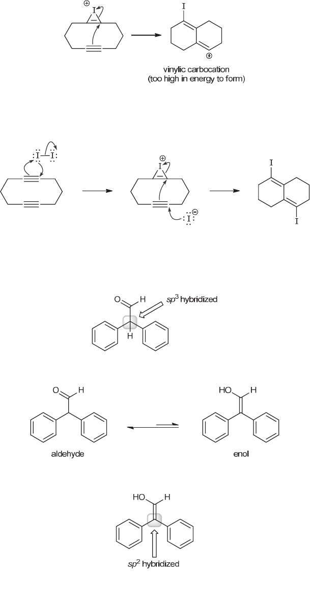 312 CHAPTER 9 (b) As shown, the resulting carbocation would be vinylic, and we have seen that vinylic carbocations are generally too high in energy to form: (c) The problem statement describes the following two-step mechanism, which avoids the formation of a vinylic carbocation intermediate. After the initial formation of the iodonium ion, the iodide anion can attack the second alkyne group, causing the -electrons to attack the iodonium ion, giving the final product. 9.71. (a) The highlighted carbon atom has four bonds, and is therefore sp3 hybridized. As a result, the geometry around this carbon atom is expected to be tetrahedral, with approximate bond angles of 109.5°. (a) Compound 1 is an aldehyde, and its enol is shown here: If we explore the same carbon atom that we analyzed in part (a), we find that this carbon atom (highlighted below) is sp2 hybridized, with approximate bond angles of 120°. (c) As we noted in the solutions to parts (a) and (b), we expect the bond angles to change when compound 1 is converted into its enol form. Specifically, there is an increase in the bond angles from 109.5° to 120°, as shown: www.MyEbookNiche.eCrater.com