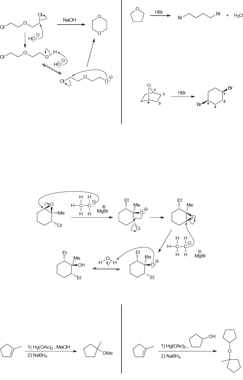 468 CHAPTER 13 ejected as a leaving group, giving the cyclic product shown: 13.39. The starting material is a cyclic ether, in which the oxygen atom is connected to two carbon atoms, each of which is sp3 hybridized. As such, treatment with HBr is expected to cleave each of the CO bonds and replace them with CBr bonds, giving the following dibromide: 13.40. The starting material has six carbon atoms, and the product has six carbon atoms. So, the starting material must be some sort of cyclic ether, which opens to give a dibromide. By inspecting the dibromide product, we can determine which two carbon atoms must have been connected to the oxygen atom in the starting cyclic ether. 13.41. Ethyl magnesium bromide is a strong nucleophile, and can attack the epoxide at the less substituted position, in a ring-opening process, with inversion of configuration at the position that is attacked. The resulting alkoxide ion can then undergo an intramolecular SN2-type process, expelling a chloride ion and generating a new epoxide. This epoxide can be attacked once again by ethyl magnesium bromide, once again at the less substituted position, and once again with inversion of configuration. The resulting alkoxide ion is then protonated upon treatment with water, to give the observed product. 13.42. (a) The starting material is an alkene, and the reagents indicate an alkoxymercuration-demercuration, resulting in the Markovnikov addition of H and OMe across the bond. (b) The starting material is an alkene, and the reagents indicate an alkoxymercuration-demercuration, resulting in the Markovnikov addition of H and OR across the bond. www.MyEbookNiche.eCrater.com