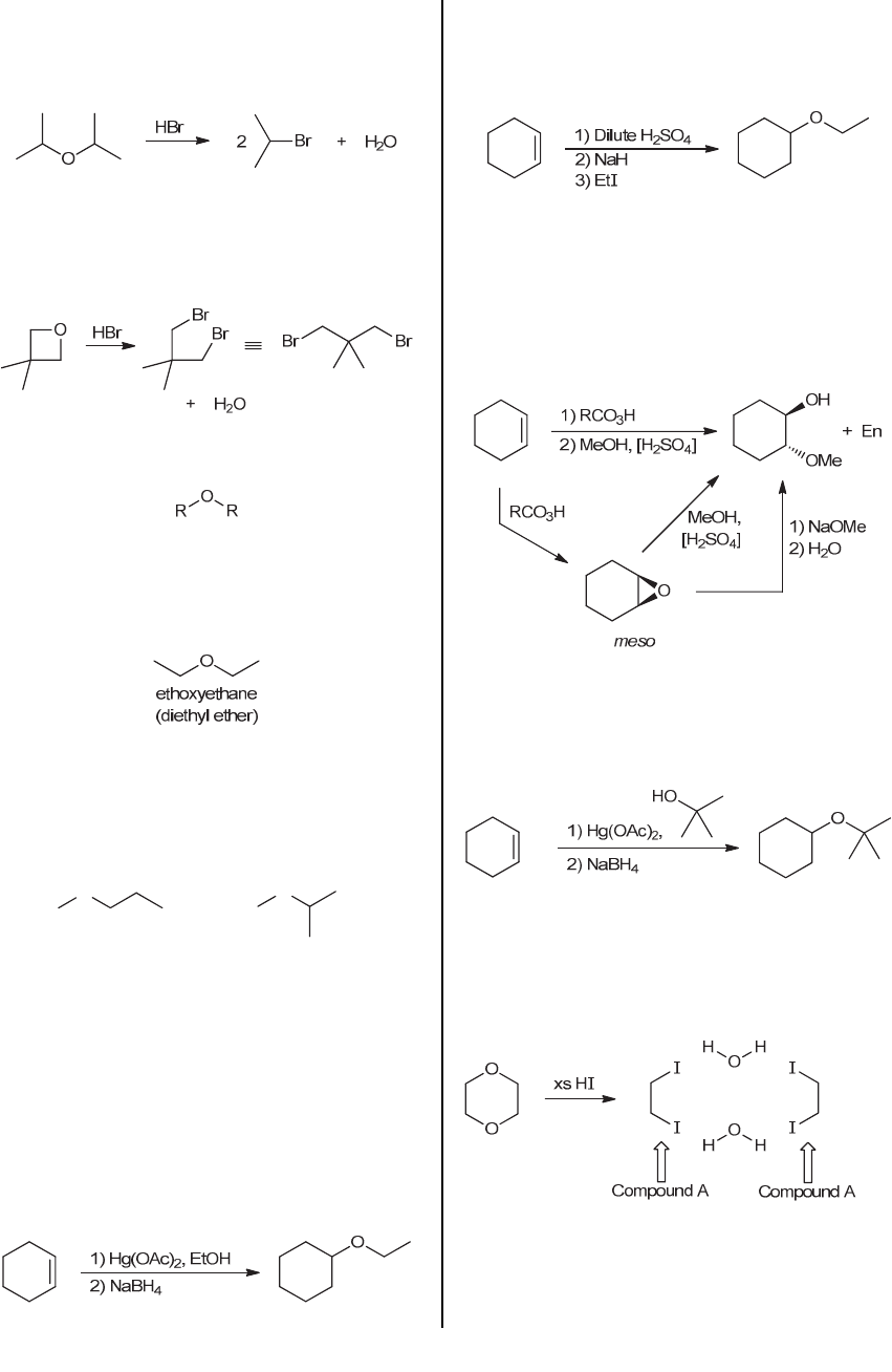 CHAPTER 13 463 (c) The oxygen atom is connected to two carbon atoms, each of which is sp3 hybridized. Therefore, each of the CO bonds is cleaved, giving two equivalents of 2- bromopropane. (d) The oxygen atom is connected to two carbon atoms, each of which is sp3 hybridized. Therefore, each of the CO bonds is cleaved. As a result, the ring is opened, giving a dibromide, as shown. 13.28. Ethers have the following structure: We are looking for ethers with the molecular formula C4H10O, which means that the four carbon atoms must be contained in the two R groups of the ether. One possibility is that each R group has two carbon atoms. Alternatively, one R group can have three carbon atoms and the other R group can have one carbon atom. The R group containing three carbon atoms can either be a propyl group or an isopropyl group, giving the following two additional isomers: O O 1-methoxypropane 2-methoxypropane(methyl propyl ether) (isopropyl methyl ether) In total, there are three constitutionally isomeric ethers with the molecular formula C4H10O. 13.29. (a) The desired transformation involves addition of H and OEt across a bond. This can be achieved via alkoxymercuration-demercuration, where EtOH is used as the alcohol during the alkoxymercuration step: Alternatively, cyclohexene can be treated with dilute sulfuric acid to give cyclohexanol, which can then be used in a Williamson ether synthesis, together with ethyl iodide, to give the desired product: (b) The desired transformation involves an anti addition of OH and OMe across a bond. This can be achieved by converting cyclohexene into an epoxide (upon treatment with a peroxy acid), followed by a ring opening reaction. The second step of this process (opening the ring) can be performed under either acidic conditions or basic conditions. (c) The desired transformation involves addition of H and OR across a bond. This can be achieved via alkoxymercuration-demercuration, where (CH3)3COH is used as the alcohol during the alkoxymercuration step. 13.30. (a) There are four CO bonds, and each of them is cleaved under acidic conditions and replaced with a CI bond, giving two moles of compound A and two moles of water. (b) As seen in the previous solution (14.34a), two moles of compound A are produced for every one mole of 1,4- dioxane. www.MyEbookNiche.eCrater.com