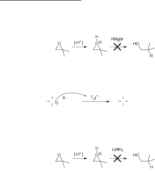 CHAPTER 13 445 Common Mistakes to Avoid We have seen that epoxides will react with a wide variety of nucleophiles (causing ring-opening reactions), either under acidic conditions or under basic conditions. If the attacking nucleophile is itself a strong base, such as a Grignard reagent, then acidic conditions cannot be used. That is, the following transformation is not possible to achieve, so avoid trying to do something like this: This doesn’t work because Grignard reagents are not only strong nucleophiles, but they are also strong bases. And strong bases are incompatible with acidic conditions. If a Grignard reagent is subjected to a source of acid (even a relatively weak acid, such as H2O), the Grignard reagent is irreversibly protonated to give an alkane, for example: (MeMgBr) H O H H C H H MgBr H C H H H + HOMgBr Methane In summary, never use a Grignard reagent in the presence of an acid. The same rule applies to the use of LiAlH4 (lithium aluminum hydride), which is both a strong nucleophile and a strong base. Therefore, much like a Grignard reagent, LiAlH4 also cannot be used to open an epoxide under acidic conditions: Once again, this doesn’t work because LiAlH4 is incompatible with acidic conditions. Avoid making this mistake. www.MyEbookNiche.eCrater.com
