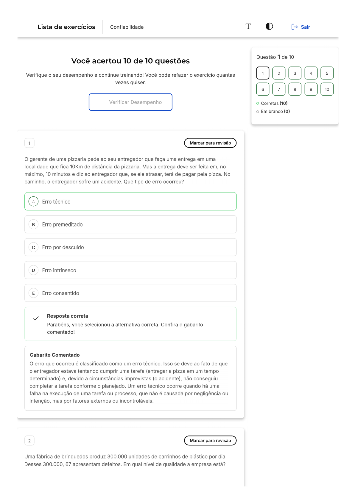 Lista de exercícios Confiabilidade T Sair Questão 1 de 10 Você acertou 10 de 10 questões Verifique o seu desempenho e continue treinando! Você pode refazer o exercício quantas 1 2 3 4 5 vezes quiser. 6 7 8 9 10 Verificar Desempenho Corretas (10) Em branco (0) 1 Marcar para revisão gerente de uma pizzaria pede ao seu entregador que faça uma entrega em uma localidade que fica 10Km de distância da pizzaria. Mas a entrega deve ser feita em, no máximo, 10 minutos e diz ao entregador que, se ele atrasar, terá de pagar pela pizza. No caminho, o entregador sofre um acidente. Que tipo de erro ocorreu? A Erro técnico Erro premeditado c Erro por descuido D Erro intrínseco E Erro consentido Resposta correta Parabéns, você selecionou a alternativa correta. Confira o gabarito comentado! Gabarito Comentado O erro que ocorreu é classificado como um erro técnico. Isso se deve ao fato de que o entregador estava tentando cumprir uma tarefa (entregar a pizza em um tempo determinado) e, devido a circunstâncias imprevistas (o acidente), não conseguiu completar a tarefa conforme o planejado. Um erro técnico ocorre quando há uma falha na execução de uma tarefa ou processo, que não é causada por negligência ou intenção, mas por fatores externos ou incontroláveis. 2 Marcar para revisão Uma fábrica de brinquedos produz 300.000 unidades de carrinhos de plástico por dia. Desses 300.000, 67 apresentam defeitos. Em qual nível de qualidade a empresa está?A 2σ c 4σ D 5σ E 6σ Resposta correta Parabéns, você selecionou a alternativa correta. Confira o gabarito comentado! Gabarito Comentado A questão se refere ao nível de qualidade de uma produção, medido em termos de desvios padrão (sigma, σ). No contexto de controle de qualidade, um nível de 5σ indica que a taxa de defeito é de 233 defeitos por milhão de oportunidades, ou seja, a empresa tem um alto nível de qualidade, com poucos produtos defeituosos. No caso apresentado, a fábrica produz 300.000 unidades por dia e apenas 67 apresentam defeitos, o que está dentro do nível de 5σ. Portanto, a alternativa correta é a letra D, que indica o nível de 5σ. 3 Marcar para revisão Com relação às ferramentas da qualidade, leia as assertivas e marque a alternativa correta: Seis Sigma busca eficácia organizacional nas dimensões: redução do desperdício, dos defeitos e envolvimento das pessoas; Brainstorming torna mais fácil a análise de um processo a identificar; das entradas e de seus fornecedores; das saídas e de seus clientes; de pontos críticos do processo; III Diagrama de Pareto torna visivelmente clara a relação ação/benefício, ou seja, prioriza a ação que trará melhor resultado; IV objetivo da Matriz GUT é ordenar a importância das ações pela sua Gravidade, pela sua Utilidade e pela sua Tendência de forma racional, permitindo escolher a tomada de ação menos prejudicial. A Todas as assertivas são corretas. Somente as assertivas e III são corretas. c Somente as assertivas e são corretas.D Somente as assertivas e IV são corretas. E Todas as assertivas são falsas. Resposta correta Parabéns, você selecionou a alternativa correta. Confira o gabarito comentado! Gabarito Comentado A alternativa correta é a C, que afirma que somente as assertivas e III são corretas. A assertiva está correta, pois o Seis Sigma é uma metodologia que busca a eficácia organizacional através da redução do desperdício, dos defeitos e do envolvimento das pessoas. A assertiva III também está correta, pois o Diagrama de Pareto é uma ferramenta que ajuda a visualizar claramente a relação ação/benefício, priorizando a ação que trará o melhor resultado. As assertivas e IV estão incorretas. O Brainstorming não é uma ferramenta para análise de processos, mas sim para geração de ideias. A Matriz GUT, por sua vez, é utilizada para priorizar problemas, e não ações. 4 Marcar para revisão Na terminologia da manutenção, os termos ou siglas "defeito", "falha" e "MTBF" estão relacionados, respectiva e resumidamente: Ao impedimento de funcionamento, à confiabilidade e à duração dos serviços de A manutenção. À indisponibilidade em curto ou longo prazo, à confiabilidade e à quebra. c À indisponibilidade em curto ou longo prazo, à quebra e à confiabilidade. D À confiabilidade, ao impedimento de funcionamento e à quebra. À indisponibilidade em curto ou longo prazo, à confiabilidade e à E manutenibilidade. Resposta correta Parabéns, você selecionou a alternativa correta. Confira o gabarito comentado! Gabarito ComentadoOs termos "defeito", "falha" e "MTBF" na terminologia da manutenção estão relacionados, respectivamente, à indisponibilidade em curto ou longo prazo, à quebra e à confiabilidade. O termo "defeito" refere-se à indisponibilidade de um sistema ou componente, seja em curto ou longo prazo. "Falha" é comumente usado para descrever uma quebra ou falha no sistema. Por fim, "MTBF" é a sigla para Mean Time Between Failures, que em português significa Tempo Médio Entre Falhas, um indicador de confiabilidade que mede o tempo médio entre as falhas de um sistema. 5 Marcar para revisão A aplicação da Confiabilidade traz benefícios nas seguintes esferas: Operacional Econômico-financeira III Legal IV Socioambiental É correto o que se afirma em: A le somente. le III somente. c I, e III somente. D I, II, III e IV. E III e IV. Resposta correta Parabéns, você selecionou a alternativa correta. Confira o gabarito comentado! Gabarito Comentado A aplicação da Confiabilidade traz benefícios em todas as esferas mencionadas no enunciado. Na esfera operacional, a confiabilidade garante a eficiência e eficácia dos processos. Na esfera econômico-financeira, a confiabilidade assegura a sustentabilidade financeira e a rentabilidade. Na esfera legal, a confiabilidade garante a conformidade com as leis e regulamentos. E na esfera socioambiental, a confiabilidade assegura a responsab
