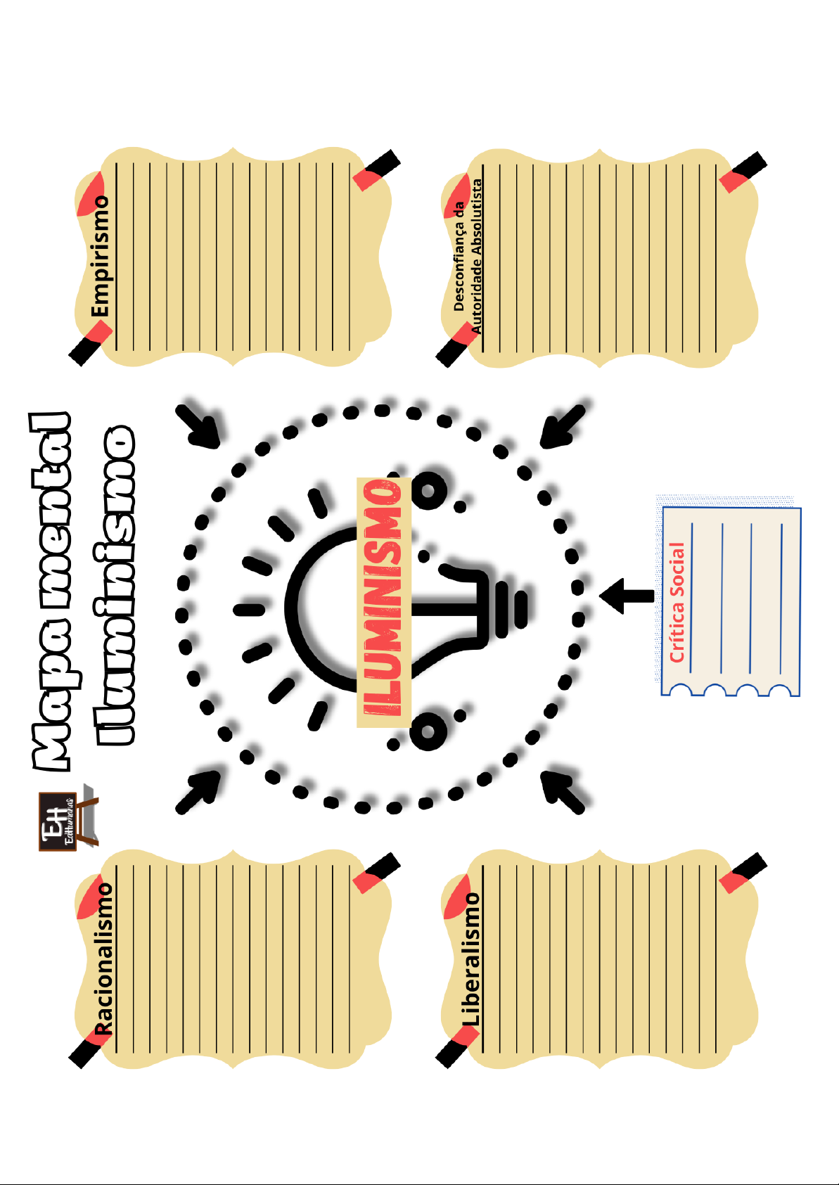 EH EdHumanas mental Racionalismo Iluminismo Empirismo Desconfiança da Liberalismo Autoridade Absolutista Crítica SocialPensadores Iluministas Complete com as principais características dos pensadores iluministas e monte um mapa mental no seu caderno: John Voltaire Locke Montesquieu Jean-Jacques Rousseau Adam Diderot SmithIluminismo foi um movimento intelectual que teve seu apogeu nos séculos XVII e XVIII, especialmente na Europa. Ele enfatizava a razão como uma ferramenta primordial para compreender e transformar 0 mundo, promovendo ideias como liberdade, igualdade, fraternidade, tolerância, progresso e a separação entre Estado e Igreja. Principais Características do Iluminismo: 1. Racionalismo: Os iluministas acreditavam no poder da razão humana em detrimento da fé como uma ferramenta para resolver problemas, entender a natureza e melhorar a sociedade. 2. Empirismo: Valorizavam a experiência e a observação como fontes legítimas de conhecimento, defendendo a ideia de que as conclusões deveriam ser baseadas em evidências concretas. 3. Crença no Progresso: Acreditavam que a aplicação da razão levaria ao progresso humano em todas as áreas, incluindo ciência, política, educação e sociedade. 4. Liberalismo: Defendiam a ideia de liberdade individual, igualdade perante a lei e direitos fundamentais. liberalismo iluminista influenciou as ideias políticas que levaram às revoluções democráticas. 5. Tolerância Religiosa: Muitos iluministas eram críticos das instituições religiosas tradicionais e defendiam a tolerância religiosa, propondo uma separação entre Estado e Igreja. 6. A disseminação do conhecimento foi promovida através de enciclopédias e outras obras que visavam educar as pessoas, tornando-as críticas e informadas. 7. Desconfiança da Autoridade Absolutista: Criticavam ferozmente absolutismo. Questionavam a autoridade absoluta dos monarcas e criticavam sistemas políticos baseados em privilégios hereditários. 8. Crítica Social: Abordavam questões sociais, como a desigualdade e a injustiça, buscando reformas para melhorar a condição humana. teve um impacto profundo na filosofia, na política, na ciência, na educação e em outros campos, contribuindo para moldar os ideais que fundamentaram as revoluções políticas, como a Revolução Americana e a Revolução Francesa. Suas ideias continuam a influenciar pensamento contemporâneo sobre democracia, direitos humanos e a relação entre indivíduo e sociedade. PENSADORES ILUMINISTAS Complete cruzadinha: Os pensadores iluministas compartilhavam a crença na razão, na 1 ciência, na tolerância religiosa e na crítica às estruturas 2 autoritárias. Alguns dos principais pensadores do incluem: John Locke (1632-1704): Contribuiu para a teoria política, defendendo a ideia de direitos naturais, governo limitado e a separação de poderes. Voltaire (1694-1778): Filósofo francês conhecido por suas obras satíricas e pela defesa da liberdade de expressão, tolerância religiosa e 3 separação entre Igreja e Estado. Montesquieu (1689-1755): 4 Sua obra "O Espírito das Leis" influenciou a teoria da separação dos poderes, defendendo a importância de um governo dividido 5 em legislativo, executivo e judiciário. Jean-Jacques Rousseau (1712-1778): 6 7 Autor de "O Contrato Social", argumentou pela soberania popular, influenciando pensamento democrático e as ideias de governo baseadas no consentimento dos governados. Denis Diderot (1713-1784): Editor da "Enciclopédia", uma compilação de conhecimento iluminista que abordava ciência, filosofia, política, religião e artes. 8 Immanuel Kant (1724-1804): Filósofo alemão cuja obra "Crítica da Razão Pura" explorou a 9 natureza da razão humana, a ética e a epistemologia. Adam Smith (1723-1790): Economista escocês conhecido por "A Riqueza das Nações", defendeu a ideia de uma economia de mercado baseada na livre concorrência e no interesse próprio. Horizontais Verticais 3. que iluministas buscavam ao promover a 1. Crença no poder da razão humana como uma religiosa ferramenta para resolver problemas, entender a 4. Qual era a ênfase principal do natureza e melhorar a sociedade. 6. Valorizavam a experiência e a observação como 2. Nome dado à defesa da ideia de liberdade individual, fontes legítimas de conhecimento. igualdade perante a lei e direitos fundamentais. 8. Área do conhecimento enfatizada pelo 5. Filósofo francês conhecido por suas obras satíricas e pela defesa da liberdade de expressão, tolerância 9. Economista escocês conhecido por "A Riqueza das religiosa e separação entre Igreja e Estado. Nações", defendeu a ideia de uma economia de mercado baseada na livre concorrência e no interesse 7. Autor de "O Contrato Social", argumentou pela próprio. soberania popular, influenciando pensamento democrático e as ideias de governo baseadas no consentimento dos governados.Despotismo esclarecido O Despotismo Esclarecido refere-se a uma forma de governo autocrático em que um monarca absolutista busca aplicar ideias e reformas associadas ao para modernizar e melhorar a eficiência do Estado. Esse termo é frequentemente utilizado para descrever governantes do século XVIII, em particular na Europa. Principais Características do Despotismo Esclarecido: 1. Reformas Iluministas: Os monarcas despotas esclarecidos adotavam ideias iluministas, como racionalidade, tolerância religiosa, educação e progresso científico. 2. Centralização do Poder: Embora mantivessem o poder centralizado nas mãos do monarca, esses governantes buscavam implementar mudanças que melhorassem a administração e a governança. 3. Melhoria na Economia: Algumas medidas eram tomadas para promover desenvolvimento econômico, como a modernização da agricultura, promoção do comércio e incentivo à manufatura. 4. Educação e Cultura: Muitos despotas esclarecidos investiram na educação e cultura, apoiando a criação de escolas, academias e promov