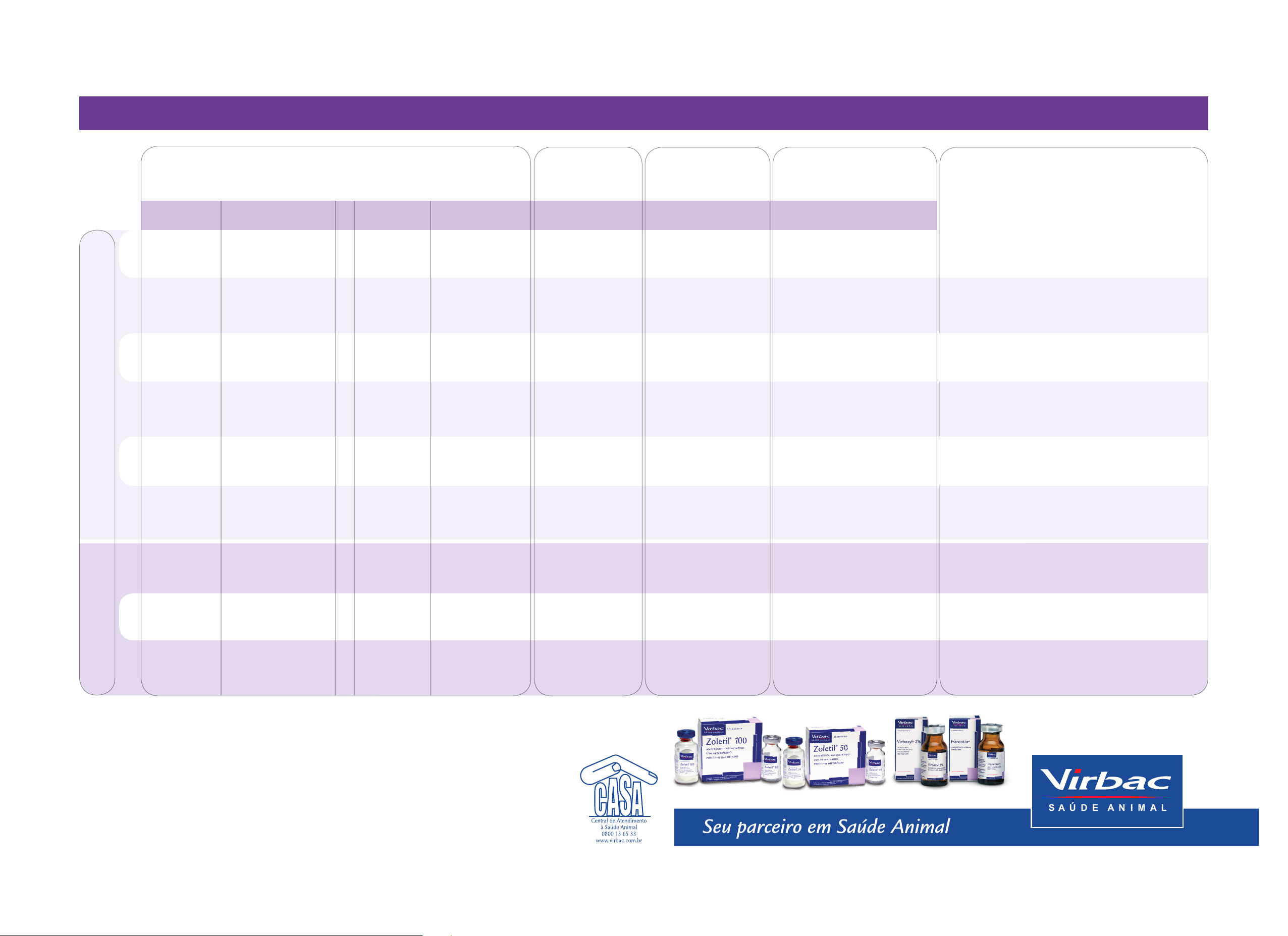 1 2 3 4 5 6 7 8 9 ASSOCIAÇÕES ANESTÉSICAS MPA = medicação pré-anestésica; SC = subcutâneo; IM = intramuscular; IV = intravenoso Os protocolos acima descritos são sugestões de associações de drogas para a anestesia injetável. Uma correta avaliação do paciente pelo Médico Veterinário deverá ser realizada antes de qualquer procedimento anestésico. LITERATURA CONSULTADA: HALL, L.W.; TAYLOR, P.M. Anesthesia in cat. Bailliere Tindall. W.B.Sauders. London, 362p, 1994. KOHN, D.F.; WIXSON, S.K.; WHITE, W.J.; BENSON, G.J. Anesthesia and analgesia in laboratory animals. Academic Press. San Diego, 426p, 1997. PADDLEFORD, R.R. Manual of small animal anesthesia. Saunders Company. Philadelphia, 372p, 1999. THURMON, J.C.; TRANQUILLI, W.J.; BENSON, G.J. Lumb & Jone´s veterinary anesthesia. Williams & Wilkins. Baltimore, 928p, 1996. VALADÃO, C.A.A. Anestésicos dissociativos. In FANTONI, D.T.; CORTOPASSI, S.R. Anestesia em cães e gatos. Editora Rocca. São Paulo, 165-173p, 2002. Associações 1, 2, 3, 4, 5, 7, 8 e 9 sugeridas pelo Prof. Dr. Carlos Augusto Araújo Valadão (FCAV - UNESP), com a colaboração de Juan Carlos Duque. Associação 6: retirada de VEADO, J.C.C. Associação tiletamina-zolazepam na anestesia dissociativa de cães. Protocolo original de utilização. Boa contenção, permite procedimentos curtos como suturas de pele, limpeza de feridas e troca de bandagens. Duração: 20 a 40 minutos. Melhor relaxamento muscular. Útil para cirurgias abdomi- nais, ajustando-se a dose de quetamina até 20 mg/Kg. Não se recomenda o uso de atropina. Duração: 20 a 40 minutos. Relaxamento muscular e analgesia adequados, com ótima recuperação anestésica. Duração: 20 a 40 minutos. Bom relaxamento muscular, com mínimos efeitos cardiorrespiratórios. Duração: 10 a 20 minutos. Bom miorrelaxamento, boa analgesia. Duração: cerca de 100 minutos. A injeção IM tem um efeito sedativo que permite a realização do pré-operatório e a IV visa o efeito anestésico. Duração: 25 a 55 minutos. Anestesia e analgesia para procedimentos curtos. Mínimos efeitos cardiorrespiratórios. Duração: 20 a 100 minutos. Anestesia adequada para castração. Duração: 10 a 30 minutos. Suave indução e recuperação, excelente miorrelaxamento e boa analgesia. Duração: 40 a 50 minutos. CÃES GATOS oãçudnIAPM OBSERVAÇÕES Fármaco 1 Atropina Acepromazina Atropina Butorfanol Atropina Diazepam Acepromazina dose (mg/Kg) 0,04 SC ou IM 0,1 IM (na mesma seringa) 0,02 a 0,04 SC 0,2 IM 0,04 SC 0,2 a 0,5 IV (na mesma seringa, injeção lenta) 0,1 IM Fármaco 2 Acepromazina Butorfanol Diazepam Zoletil® 50 ou 100 dose (mg/Kg) 0,1 IM ou IV 0,2 IM (na mesma seringa) 0,25 a 0,75 IV 8,0 IM + + + + + 0,5 a 1,0 mg/Kg = 0,025 a 0,05 mL/Kg/IM (na mesma seringa) 1,0 mg/Kg = 0,05 mL/ Kg/IM 0,4 a 0,6 mg/Kg = 0,02 a 0,03 mL/Kg/IM 5 a 10 mg/Kg ou 0,05 a 0,1 mL/Kg/IM ou IV (20 minutos depois) 5 a 15 mg/Kg = 0,05 a 0,15 mL/Kg/IM (na mesma seringa) 5 a 10 mg/Kg ou 0,05 a 0,1 mL/Kg/IV (20 minutos depois) 5,0 a 8,0 mg/Kg = 0,05 a 0,08 mL/Kg/IV 2,0 a 8,0 mg/Kg = 0,02 a 0,08 mL/Kg/IV (na mesma seringa, injeção lenta) 2,0 a 3,0 mg/Kg = 0,02 a 0,03 mL/Kg/IM 8,0 a 10 mg/Kg = 0,16 a 0,2 mL/Kg de Zoletil® 50 ou 0,08 a 0,1 mL/Kg de Zoletil® 100 IM 3,0 mg/Kg = 0,06 mL/Kg de Zoletil® 50 ou 0,03 mL/Kg de Zoletil® 100 IV (15 minutos depois) 2,0 a 5,0 mg/Kg = 0,04 a 0,1 mL/Kg de Zoletil® 50 ou 0,02 a 0,05 mL/ Kg de Zoletil® 100 IM ou IV 3,0 a 4,0 mg/Kg = 0,06 a 0,08 mL/Kg de Zoletil® 50 ou 0,03 a 0,04 mL/Kg de Zoletil® 100 IM Indução e anestesia Anestesia Virbaxyl® Francotar® Zoletil® 50 ou 100