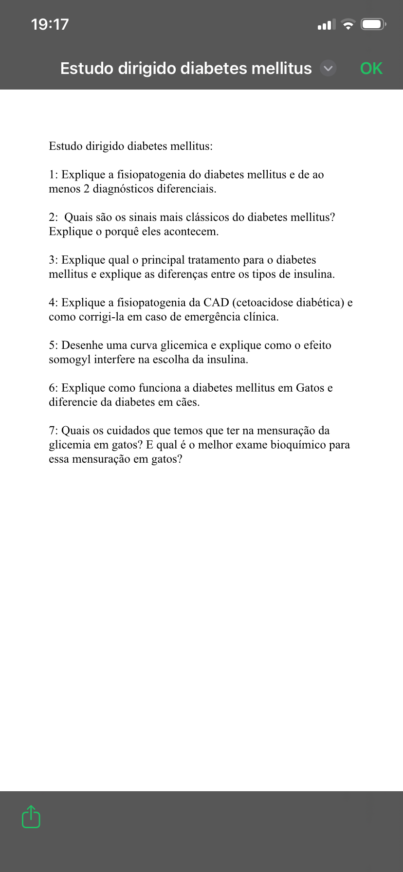 19:17 Estudo dirigido diabetes mellitus OK Estudo dirigido diabetes mellitus: 1: Explique a fisiopatogenia do diabetes mellitus e de ao menos 2 diagnósticos diferenciais. 2: Quais são os sinais mais clássicos do diabetes mellitus? Explique o porquê eles acontecem. 3: Explique qual o principal tratamento para o diabetes mellitus e explique as diferenças entre os tipos de insulina. 4: Explique a fisiopatogenia da CAD (cetoacidose diabética) e como corrigi-la em caso de emergência clínica. 5: Desenhe uma curva glicemica e explique como o efeito somogyl interfere na escolha da insulina. 6: Explique como funciona a diabetes mellitus em Gatos e diferencie da diabetes em cães. 7: Quais os cuidados que temos que ter na mensuração da glicemia em gatos? E qual é o melhor exame bioquímico para essa mensuração em gatos?