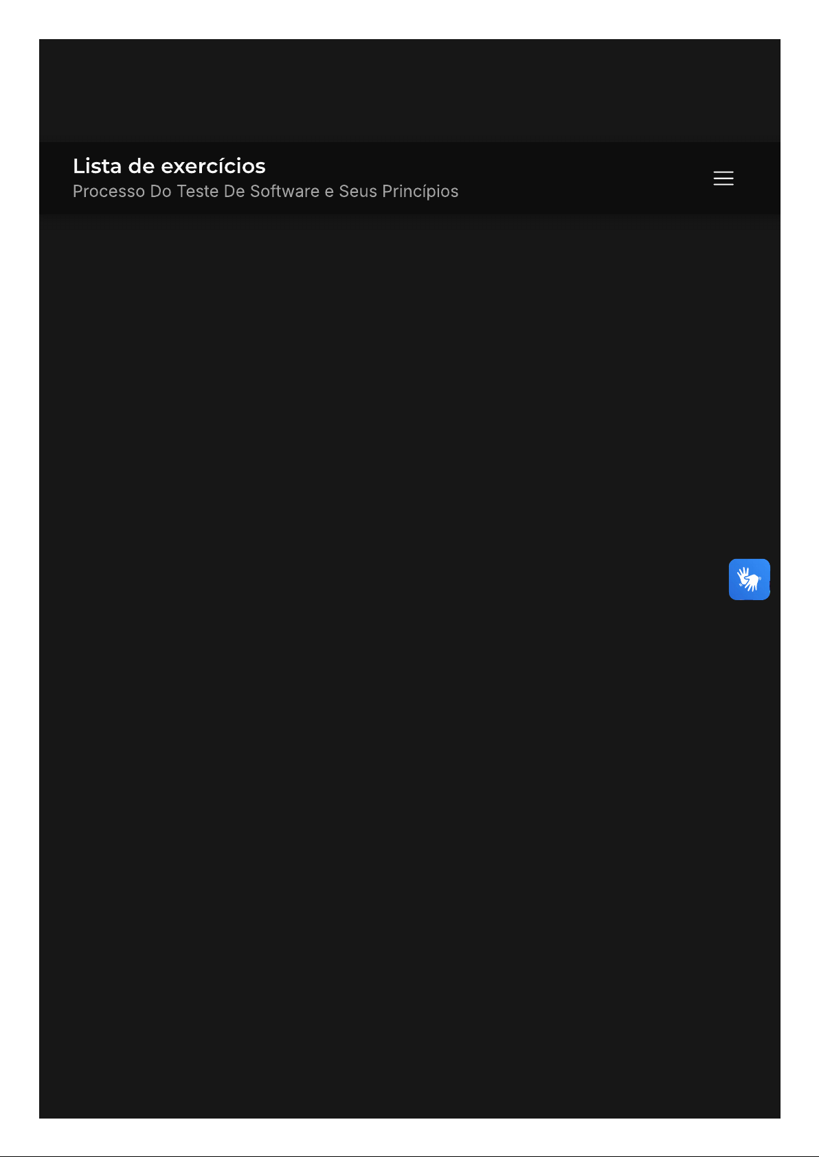 Lista de exercícios Processo Do Teste De Software e Seus PrincípiosVocê acertou 10 de 10 questões Verifique seu desempenho e continue treinando! Você pode refazer exercício quantas vezes quiser. Verificar Desempenho 1 Marcar para revisão A Engenharia de Software nos auxilia em muitas situações. Uma delas é a atividade de teste de software. Sobre este assunto, analise as asserções abaixo e, a seguir, assinale a alternativa correta: I. Existem dois tipos de teste de software: teste de baixo nível e teste de alto nível; II. teste de software é processo de executar software de uma maneira controlada, com objetivo de descobrir diferenças entre comportamento previsto e comportamento observado. III. Os testes de software podem ser usados para descobrir a ausência de erros no produto (software). A Somente as asserções e II estão corretas B Somente as asserções e III estão corretas c Somente as asserções e III estão corretas D Somente a asserção está correta E Somente a asserção III está corretaParabéns, você selecionou a alternativa correta. Confira gabarito comentado! Gabarito Comentado A Engenharia de Software nos auxilia em muitas situações. Uma delas é a atividade de teste, que é um passo do processo de que visa encontrar ou corrigir erros durante toda a construção do software. Devemos incorporar dois tipos de testes: 1-Teste de baixo nível: utilizado para veerificar um pequeno fragmento de código-fonte. Nesse caso, saberemos se ele foi implementado corretamente. 2 Teste de alto nível: tem a característica de validar as principais funções do sistema com base nos requisitos definidos pelo cliente. Os testes podem ser usados para descobrir a presença de erros nos softwares, mas infelizmente não mostram a sua ausência. Assim, conseguimos chegar à conclusão que teste de software é processo de executar software de uma maneira controlada, com objetivo de descobrir diferenças entre comportamento previsto e comportamento observado". 2 Marcar para revisão Modelo V é uma melhoria do Modelo Cascata do desenvolvimento de produto. Ele possui alguns objetivos, dentre os quais estão explicitados nas alternativas abaixo, EXCETO (ou seja, assinale a alternativa INCORRETA, isto é a que não representa um dos objetivos do Modelo V). A Um dos objetivos do Modelo V é mimizar os riscos do projeto. Um dos objetivos do Modelo V é melhorar e garantir a qualidade do B projeto. Um dos objetivos do Modelo V é reduzir os custos totais ao longo dociclo de vida do projeto Um dos objetivos do Modelo V é melhorar a comunicação entre as D partes interessadas. Um dos objetivos do Modelo V é maximizar os lucros da empresa E desenvolvedora. Resposta correta Parabéns, você selecionou a alternativa correta. Confira gabarito comentado! Gabarito Comentado O objetivo do Modelo V é melhorar e garantir a qualidade do projeto, reduzir os custos totais ao longo do ciclo de vida do projeto e melhorar a comunicação entre as partes interessadas. objetivo de maximizar os lucros da empresa desenvolvedora não é um objetivo do Modelo V. 3 Marcar para revisão Com relação ao tamanho e complexidade de software, assinale a opção correta, considerando tais características nos anos 60, 80 e 2000. A Em 1980 tamanho era pequeno e a complexidade alta. Em 1960 tamanho era mínimo e em 1980 a complexidade era relativa. c Em 1960 tamaho era minimo e em 2000 a complexidade era média. Em 1980 a complexidade era média e em 2000 a complexidade era D alta.E Em 1960 tamanho era mínimo e em 2000 tamanho é mesmo. Resposta correta Parabéns, você selecionou a alternativa correta. Confira gabarito comentado! Gabarito Comentado No Cenário Atual do desenvolvimento de conceito de teste ganha complexidade, pois os riscos dos softwares não funcionarem a contento, cresce de forma exponencial. Myers concluiu que zero-defeito é algo inatingível? Ou seja, pela complexidade envolvida e pelo número altíssimo de situações existentes, torna-se impossível imaginar um produto de software 'livre de erros'. Sempre existirão erros a serem descobertos. 4 Marcar para revisão A qualidade de software é um processo sistemático que focaliza todas as etapas e artefatos gerados com objetivo de garantir a conformidade e uniformidade de processos e produtos, prevenindo e eliminado defeitos. Vários fatores podem afetar a qualidade, como fatores externos e internos. São eles: I- Fatores externos são percebidos tanto pelas pessoas que desenvolvem software quanto pelos usuários. II- Fatores internos são percebidos apenas pelas pessoas que desenvolvem software. III- Fatores externos são percebidos apenas pelas pessoas que desenvolvem software. IV- Fatores internos são percebidos tanto pelas pessoas que desenvolvem software quanto pelos usuários. Assinale a assertiva correta. A Apenas o item está correto. B Apenas os itens III e IV estão corretos.c Apenas os itens e IV estão corretos. D Apenas os itens e III estão corretos. E Apenas os itens e estão corretos. Resposta correta Parabéns, você selecionou a alternativa correta. Confira gabarito comentado! Gabarito Comentado Se desejarmos desenvolver e produzir software com qualidade, é necessário investir em qualidade em todos os pontos do processo. Alguns fatores podem afetar a qualidade, como fatores externos e internos de 'Qualidade de Software¿. Vejamos alguns exemplos: Fatores externos são percebidos tanto pelas pessoas que desenvolvem software quanto pelos usuários. Por exemplo: confiabilidade, eficiência e facilidade de uso. Fatores internos são percebidos apenas pelas pessoas que desenvolvem software. Por exemplo: modularidade e legibilidade. A alternativa E está correta, pois os fatores externos são percebidos tanto pelas pessoas que desenvolvem software quanto pelos usuários. 5 Marcar para revisão Quanto às estratégias, existem muitas que podem ser utilizadas para testar um software. Uma das estratégias de teste é Teste