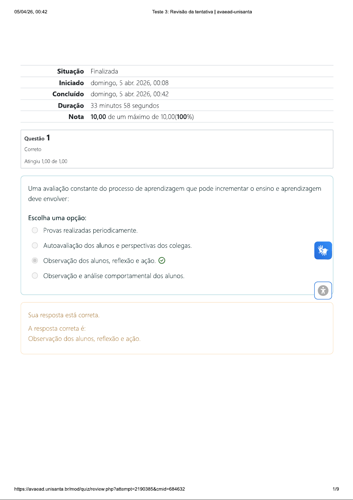 05/04/26, 00:42 Teste 3: Revisão da tentativa avaead-unisanta Situação Finalizada Iniciado domingo, 5 abr. 2026, 00:08 Concluído domingo, 5 abr. 2026, 00:42 Duração 33 minutos 58 segundos Nota 10,00 de um máximo de 10,00(100%) Questão 1 Correto Atingiu 1,00 de 1,00 Uma avaliação constante do processo de aprendizagem que pode incrementar ensino e aprendizagem deve envolver: Escolha uma opção: Provas realizadas periodicamente. Autoavaliação dos alunos e perspectivas dos colegas. Observação dos alunos, reflexão e ação. Observação e análise comportamental dos alunos. Sua resposta está correta. A resposta correta é: Observação dos alunos, reflexão e ação. 1/905/04/26, 00:42 Teste 3: Revisão da tentativa avaead-unisanta Questão 2 Correto Atingiu 1,00 de 1,00 Em relação as afirmações abaixo escolha a alternativa correta. I. Todo processo de aprendizagem envolve somente professor e aluno. II. A Didática é uma ação de melhoria constante no processo de aprendizagem. III. Não existe momento de interação dentro da escola que envolva mais de uma disciplina. A afirmação correta. Escolha uma opção: Todas estão incorretas. Somente a está correta. Somente a está correta. Somente a III está correta. Sua resposta está correta. A resposta correta é: Somente a está correta. 2/905/04/26, 00:42 Teste 3: Revisão da tentativa avaead-unisanta Questão 3 Correto Atingiu 1,00 de 1,00 Quais são os tipos de avaliação existentes? Escolha uma opção: integrativa, formativa, somativa e comparativa. Atividades, provas, exames e testes. Mental, social; interpretativa e diagnóstica. Formativa, diagnóstica, somativa e comparativa. Sua resposta está correta. A resposta correta é: Formativa, diagnóstica, somativa e comparativa. 3/905/04/26, 00:42 Teste 3: Revisão da tentativa avaead-unisanta Questão 4 Correto Atingiu 1,00 de 1,00 A que se refere artigo 12 da LDB? Escolha uma opção: Dispõe que os estabelecimentos de ensino devem prover meios para exames dos alunos de menor rendimento. Dispõe que os estabelecimentos de ensino não precisam prover meios para a recuperação dos alunos de menor rendimento. Dispõe que os estabelecimentos de ensino devem prover meios para a recuperação dos alunos de menor rendimento. Dispõe que os estabelecimentos de ensino devem instituir meios para a os exames dos alunos de menor rendimento. Sua resposta está correta. A resposta correta é: Dispõe que os estabelecimentos de ensino devem prover meios para a recuperação dos alunos de me rendimento. 4/905/04/26, 00:42 Teste 3: Revisão da tentativa avaead-unisanta Questão 5 Correto Atingiu 1,00 de 1,00 Assinale V(verdadeiro) ou F(falso) para as afirmações abaixo: uso da tecnologia da informação ajuda no desenvolvimento de pesquisas, análise de situações que aparecem ao longo dos estudos. Aplicativos são direcionamentos que são normalmente baixados pelo celular que dão suporte para escolhas de hotéis, comidas, passeios, pesquisas entre outros. a tecnologia está presente na educação, saúde, segurança e entre vários outros aspetos sociais relevantes. Escolha uma opção: V; V e V. Sua resposta está correta. A resposta correta é: 5/905/04/26, 00:42 Teste 3: Revisão da tentativa avaead-unisanta Questão 6 Correto Atingiu 1,00 de 1,00 Assinale V(verdadeiro) e F(falso) para as afirmações abaixo retiradas da internet: ato de ensinar, implica êxito, que nada mais é que a própria aprendizagem. No âmbito da educação escolar não se pode ensinar de qualquer maneira, de forma aleatória, precisa- se de orientações, subsídios, um guia do docente, e a didática é esse suporte que veio proporcionar eficácia e eficiência no trabalho do professor. Estar em contato com as ciências, é um processo que facilita a construção dos saberes, numa perspectiva dinâmica de atendimento às realizações humanas F; Sua resposta está correta. A resposta correta é: 6/905/04/26, 00:42 Teste 3: Revisão da tentativa avaead-unisanta Questão 7 Correto Atingiu 1,00 de 1,00 De acordo com aspectos avaliativos teremos tipos diferentes de avaliações, que são: Escolha uma opção: Quantitativa, qualitativa, contínua, estrutural e observação. Estruturas, holística, contínua e quantitativa. Informal, holísticas, qualitativa, contínua e quantitativa. Formal, concreta, qualitativa, numérica e quantitativa. Sua resposta está correta. A resposta correta é: Informal, holísticas, qualitativa, contínua e quantitativa. Questão 8 Correto Atingiu 1,00 de 1,00 Escolha a opção que complete os espaços em branco: "Os projetos escolares permitem abordar diferentes de forma integrada, ampliam a visão dos alunos em relação à compreensão da realidade, além de propiciarem desenvolvimento de e competências." Escolha uma opção: Conteúdos e ações. Práticas e habilidades. Conhecimentos e habilidades. Conhecimentos e práticas. Sua resposta está correta. As respostas corretas são: Conhecimentos e Práticas e habilidades. 7/905/04/26, 00:42 Teste 3: Revisão da tentativa avaead-unisanta Questão 9 Correto Atingiu 1,00 de 1,00 Dentro dos 9 passos para O critério de estruturação de um projeto para escola a definição: "Identificar fatores que realmente sejam relevantes para confecção do projeto", refere-se a que parte? Escolha uma opção: Desenvolvimento da solução final. Escolha da temática ou problema. Cronograma. Definição de critérios para seleção das ideias. Sua resposta está correta. A resposta correta é: Definição de critérios para seleção das ideias. Questão 10 Correto Atingiu 1,00 de 1,00 Um projeto didático é: Escolha uma opção: Uma proposta de prática para a mediação do desenvolvimento das habilidades e competências. Uma atividade imposta pelo professor aos alunos. Um planejamento que deve ser organizado pela diretora da escola. Uma forma de ensinar um conteúdo com maior velocidade. Sua resposta está correta. A resposta corret