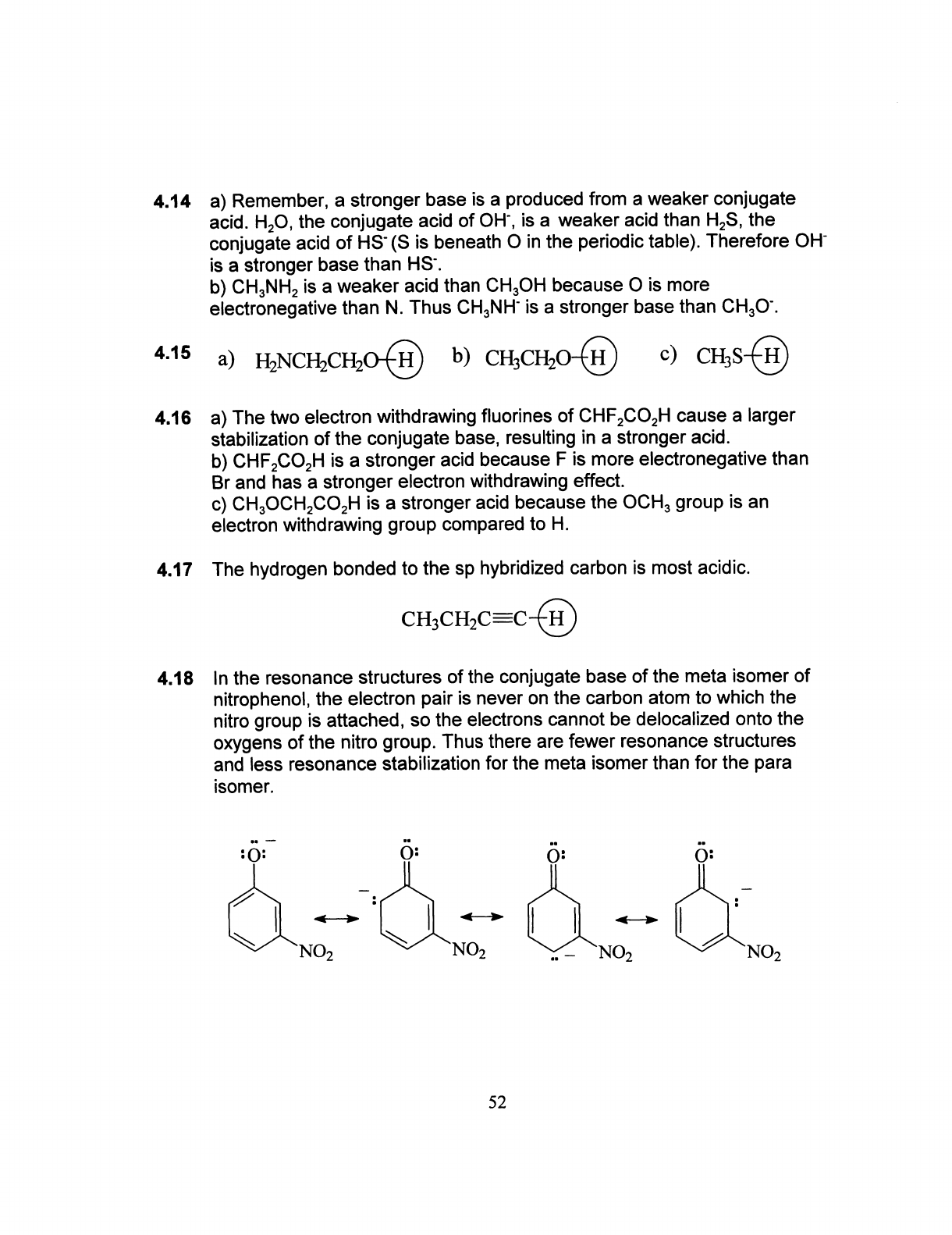 4.14 a) Remember, a stronger base is a produced from a weaker conjugate acid. the conjugate acid of is a weaker acid than H₂S, the conjugate acid of (S is beneath in the periodic table). Therefore is a stronger base than b) CH₃NH₂ is a weaker acid than because O is more electronegative than N. Thus CH₃NH⁻ is a stronger base than CH₃O⁻. 4.15 a) b) CH₃CH₂O H c) CH₃S H 4.16 a) The two electron withdrawing fluorines of CHF₂CO₂H cause a larger stabilization of the conjugate base, resulting in a stronger acid. b) CHF₂CO₂H is a stronger acid because F is more electronegative than Br and has a stronger electron withdrawing effect. c) is a stronger acid because the OCH₃ group is an electron withdrawing group compared to H. 4.17 The hydrogen bonded to the sp hybridized carbon is most acidic. CH₃CH₂C=C+H 4.18 In the resonance structures of the conjugate base of the meta isomer of nitrophenol, the electron pair is never on the carbon atom to which the nitro group is attached, so the electrons cannot be delocalized onto the oxygens of the nitro group. Thus there are fewer resonance structures and less resonance stabilization for the meta isomer than for the para isomer. :0: : : NO₂ NO₂ NO₂ NO₂ 52