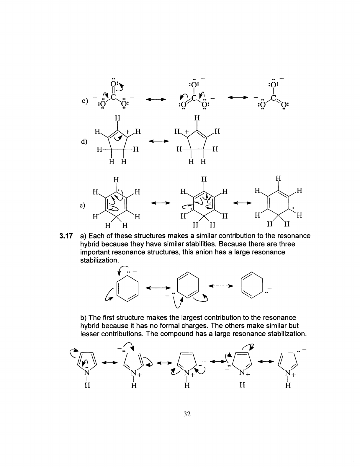 : O C c) C C H H H + H H + H d) H H H H H H H H H H H H H H H H H e) H H H H H H H H H H H H 3.17 a) Each of these structures makes a similar contribution to the resonance hybrid because they have similar stabilities. Because there are three important resonance structures, this anion has a large resonance stabilization. -- : b) The first structure makes the largest contribution to the resonance hybrid because it has no formal charges. The others make similar but lesser contributions. The compound has a large resonance stabilization. : N N+ N+ N + N+ H H H H H 32