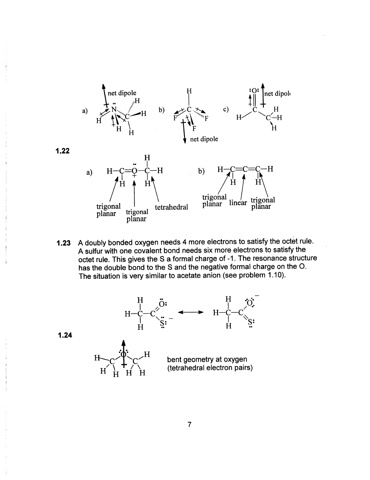 net dipole H O: net dipol H : + a) N H b) C C / c) C H H F F H + H F H H net dipole 1.22 H a) H C C H b) H-C=C=C-H + H H H H trigonal trigonal tetrahedral planar linear trigonal planar planar trigonal planar 1.23 A doubly bonded oxygen needs 4 more electrons to satisfy the octet rule. A sulfur with one covalent bond needs six more electrons to satisfy the octet rule. This gives the S a formal charge of -1. The resonance structure has the double bond to the S and the negative formal charge on the O. The situation is very similar to acetate anion (see problem 1.10). H H O: H-C C H-C-C S S: H H 1.24 H H C C bent geometry at oxygen H H (tetrahedral electron pairs) H H 7