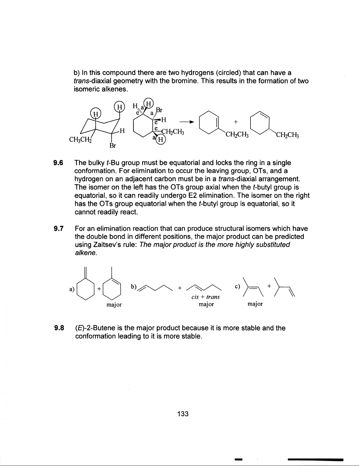 b) In this compound there are two hydrogens (circled) that can have a trans-diaxial geometry with the bromine. This results in the formation of two isomeric alkenes. H H H a Br H a H e + H e a CH₂CH₃ CH₂CH₃ CH₃CH₂ H Br 9.6 The bulky t-Bu group must be equatorial and locks the ring in a single conformation. For elimination to occur the leaving group, OTs, and a hydrogen on an adjacent carbon must be in a trans-diaxial arrangement. The isomer on the left has the OTs group axial when the t-butyl group is equatorial, so it can readily undergo E2 elimination. The isomer on the right has the OTs group equatorial when the t-butyl group is equatorial, so it cannot readily react. 9.7 For an elimination reaction that can produce structural isomers which have the double bond in different positions, the major product can be predicted using Zaitsev's rule: The major product is the more highly substituted alkene. a) + b) + c) + cis + trans major major major 9.8 (E)-2-Butene is the major product because it is more stable and the conformation leading to it is more stable. 133