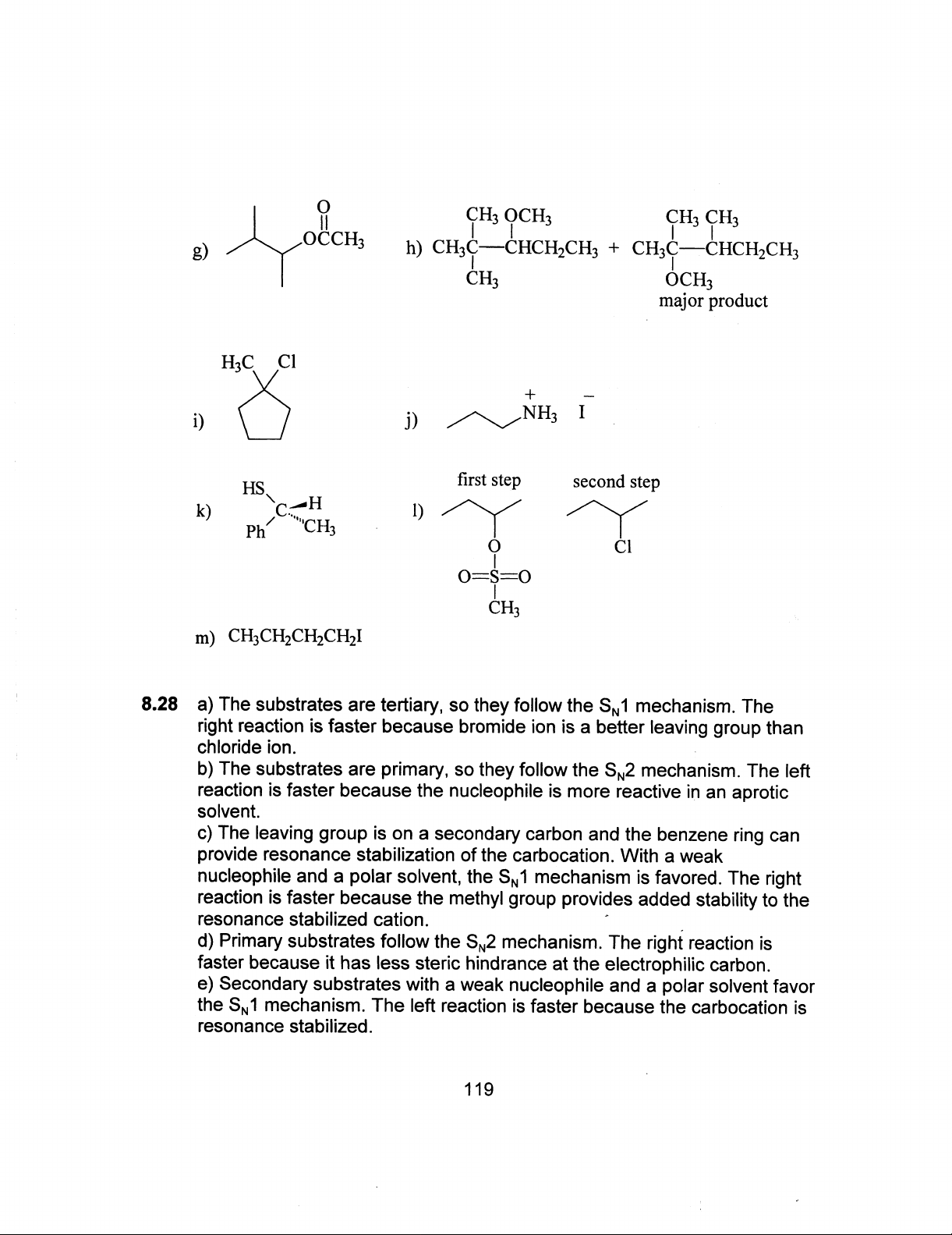 CH₃ OCH₃ CH₃ CH₃ OCCH₃ g) h) + CH₃ C CH₃ OCH₃ major product H₃C Cl + i) j) NH₃ I HS first step second step C H k) 1) Ph CH₃ O Cl CH₃ m) CH₃CH₂CH₂CH₂I 8.28 a) The substrates are tertiary, so they follow the SN1 mechanism. The right reaction is faster because bromide ion is a better leaving group than chloride ion. b) The substrates are primary, so they follow the SN2 mechanism. The left reaction is faster because the nucleophile is more reactive in an aprotic solvent. c) The leaving group is on a secondary carbon and the benzene ring can provide resonance stabilization of the carbocation. With a weak nucleophile and a polar solvent, the SN1 mechanism is favored. The right reaction is faster because the methyl group provides added stability to the resonance stabilized cation. d) Primary substrates follow the SN2 mechanism. The right reaction is faster because it has less steric hindrance at the electrophilic carbon. e) Secondary substrates with a weak nucleophile and a polar solvent favor the SN1 mechanism. The left reaction is faster because the carbocation is resonance stabilized. 119
