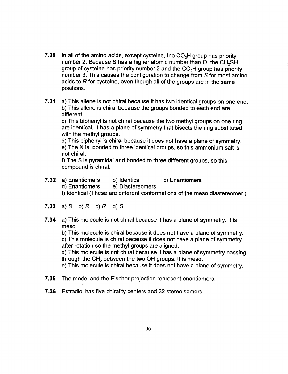 7.30 In all of the amino acids, except cysteine, the group has priority number 2. Because S has a higher atomic number than the CH₂SH group of cysteine has priority number 2 and the group has priority number 3. This causes the configuration to change from S for most amino acids to R for cysteine, even though all of the groups are in the same positions. 7.31 a) This allene is not chiral because it has two identical groups on one end. b) This allene is chiral because the groups bonded to each end are different. c) This biphenyl is not chiral because the two methyl groups on one ring are identical. It has a plane of symmetry that bisects the ring substituted with the methyl groups. d) This biphenyl is chiral because it does not have a plane of symmetry. e) The N is bonded to three identical groups, so this ammonium salt is not chiral. f) The S is pyramidal and bonded to three different groups, so this compound is chiral. 7.32 a) Enantiomers b) Identical c) Enantiomers d) Enantiomers e) Diastereomers f) Identical (These are different conformations of the meso diastereomer.) 7.33 a) S b) R c) R d) S 7.34 a) This molecule is not chiral because it has a plane of symmetry. It is meso. b) This molecule is chiral because it does not have a plane of symmetry. c) This molecule is chiral because it does not have a plane of symmetry after rotation so the methyl groups are aligned. d) This molecule is not chiral because it has a plane of symmetry passing through the CH₂ between the two OH groups. It is meso. e) This molecule is chiral because it does not have a plane of symmetry. 7.35 The model and the Fischer projection represent enantiomers. 7.36 Estradiol has five chirality centers and 32 stereoisomers. 106