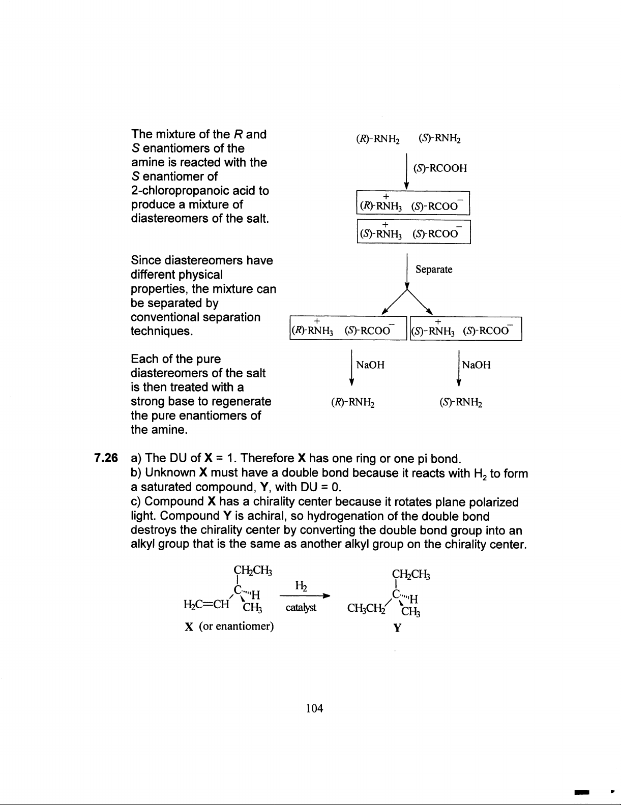 The mixture of the R and (R)-RNH₂ (S)-RNH₂ S enantiomers of the amine is reacted with the (S)-RCOOH S enantiomer of 2-chloropropanoic acid to + - produce a mixture of (R)-RNH₃ (S)-RCOO diastereomers of the salt. + (S)-RNH₃ (S)-RCOO Since diastereomers have different physical Separate properties, the mixture can be separated by conventional separation + + techniques. (R)-RNH₃ (S)-RCOO (S)-RNH₃ (S)-RCOO Each of the pure NaOH NaOH diastereomers of the salt is then treated with a strong base to regenerate (R)-RNH₂ (S)-RNH₂ the pure enantiomers of the amine. 7.26 a) The DU of X = 1. Therefore X has one ring or one pi bond. b) Unknown X must have a double bond because it reacts with H₂ to form a saturated compound, Y, with DU = 0. c) Compound X has a chirality center because it rotates plane polarized light. Compound Y is achiral, so hydrogenation of the double bond destroys the chirality center by converting the double bond group into an alkyl group that is the same as another alkyl group on the chirality center. CH₂CH₃ CH₂CH₃ C H₂ H C H CH₃ catalyst CH₃CH₂ CH₃ X (or enantiomer) Y 104