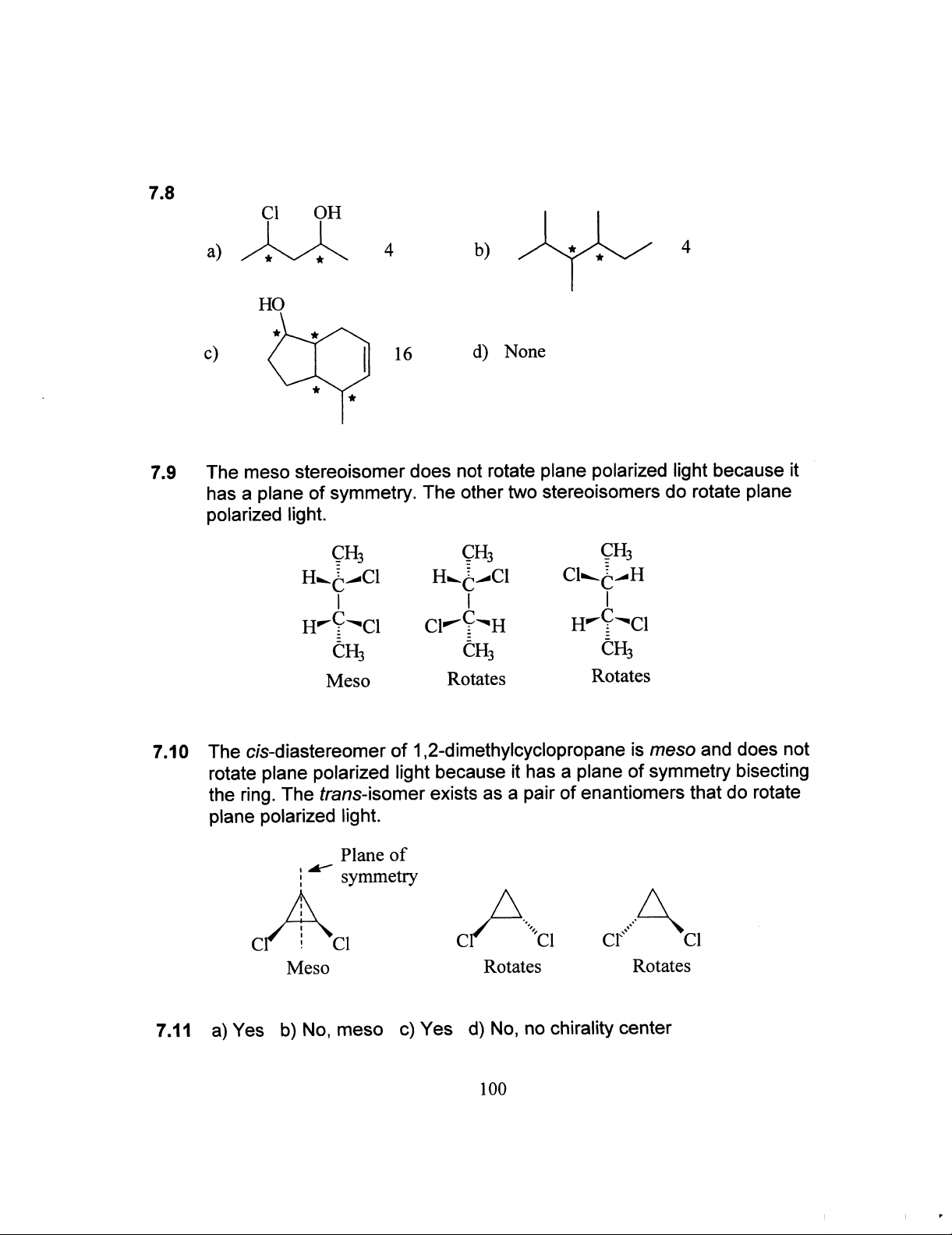 7.8 Cl OH a) 4 b) * 4 * * * * * c) 16 d) None * * 7.9 The meso stereoisomer does not rotate plane polarized light because it has a plane of symmetry. The other two stereoisomers do rotate plane polarized light. CH₃ CH₃ CH₃ H Cl H C Cl C H C C C C H Cl Cl H H CH₃ CH₃ CH₃ Meso Rotates Rotates 7.10 The cis-diastereomer of 1,2-dimethylcyclopropane is meso and does not rotate plane polarized light because it has a plane of symmetry bisecting the ring. The trans-isomer exists as a pair of enantiomers that do rotate plane polarized light. Plane of symmetry Cl Cl Cl Meso Rotates Rotates 7.11 a) Yes b) No, meso c) Yes d) No, no chirality center 100