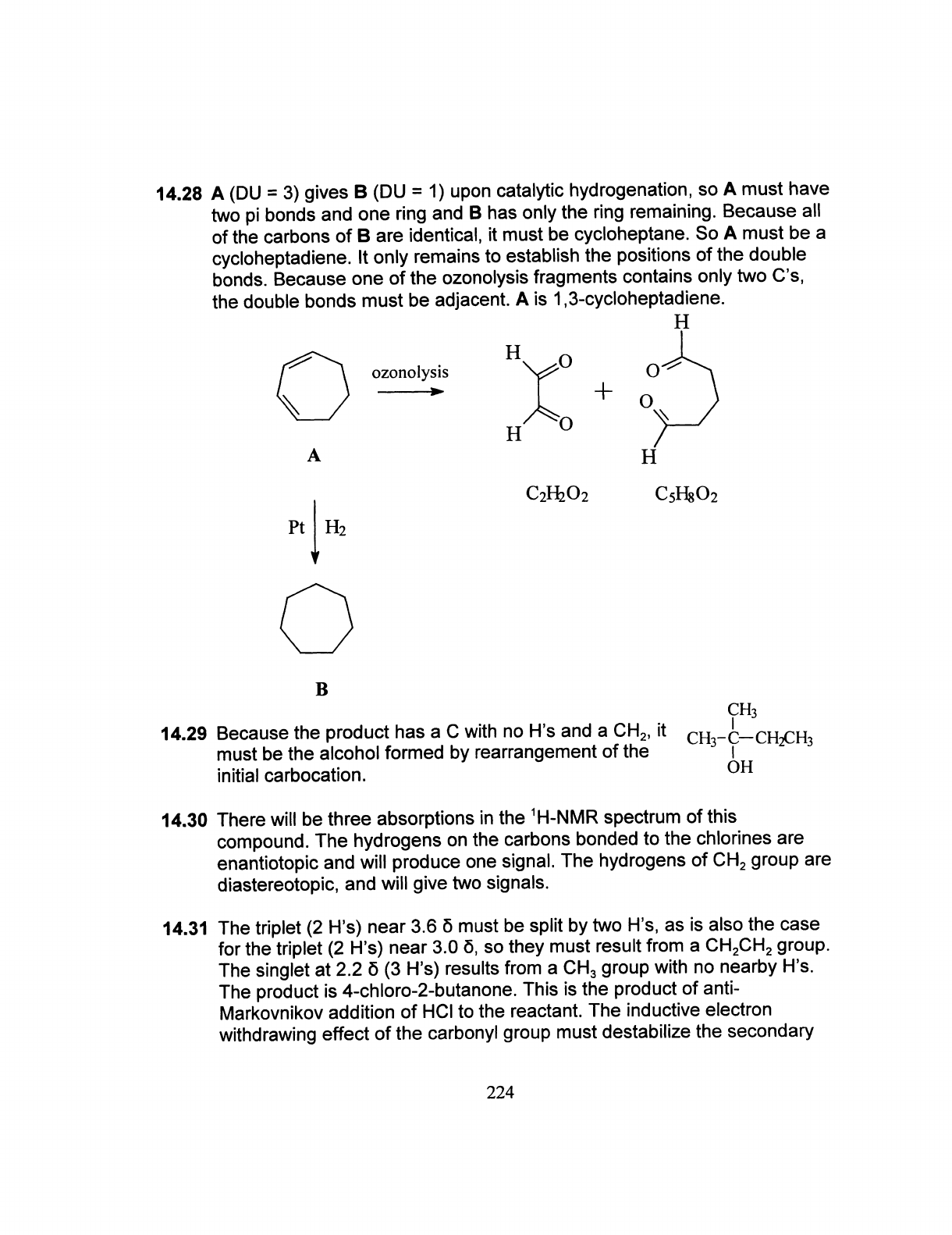 14.28 A (DU = 3) gives B (DU = 1) upon catalytic hydrogenation, so A must have two pi bonds and one ring and B has only the ring remaining. Because all of the carbons of B are identical, it must be cycloheptane. So A must be a cycloheptadiene. It only remains to establish the positions of the double bonds. Because one of the ozonolysis fragments contains only two C's, the double bonds must be adjacent. A is 1,3-cycloheptadiene. H H O ozonolysis O + O O H A H C₂H₂O₂ C₅H₈O₂ Pt H₂ B CH₃ 14.29 Because the product has a C with no H's and a it CH₃-C-CH₂CH₃ must be the alcohol formed by rearrangement of the initial carbocation. OH 14.30 There will be three absorptions in the spectrum of this compound. The hydrogens on the carbons bonded to the chlorines are enantiotopic and will produce one signal. The hydrogens of CH₂ group are diastereotopic, and will give two signals. 14.31 The triplet (2 H's) near 3.6 δ must be split by two H's, as is also the case for the triplet (2 H's) near 3.0 δ, so they must result from a group. The singlet at 2.2 δ (3 H's) results from a CH₃ group with no nearby H's. The product is This is the product of anti- Markovnikov addition of HCI to the reactant. The inductive electron withdrawing effect of the carbonyl group must destabilize the secondary 224