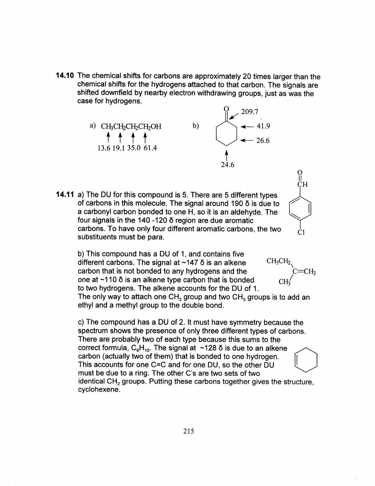14.10 The chemical shifts for carbons are approximately 20 times larger than the chemical shifts for the hydrogens attached to that carbon. The signals are shifted downfield by nearby electron withdrawing groups, just as was the case for hydrogens. O 209.7 a) CH₃CH₂CH₂CH₂OH b) 41.9 26.6 13.6 19.1 35.0 61.4 24.6 O CH 14.11 a) The DU for this compound is 5. There are 5 different types of carbons in this molecule. The signal around 190 δ is due to a carbonyl carbon bonded to one H, so it is an aldehyde. The four signals in the 140 -120 δ region are due aromatic carbons. To have only four different aromatic carbons, the two CI substituents must be para. b) This compound has a DU of 1, and contains five different carbons. The signal at ~147 δ is an alkene CH₃CH₂ carbon that is not bonded to any hydrogens and the C CH₂ one at ~110 δ is an alkene type carbon that is bonded CH₃ to two hydrogens. The alkene accounts for the DU of 1. The only way to attach one CH₂ group and two CH₃ groups is to add an ethyl and a methyl group to the double bond. c) The compound has a DU of 2. It must have symmetry because the spectrum shows the presence of only three different types of carbons. There are probably two of each type because this sums to the correct formula, C₆H₁₀. The signal at ~128 δ is due to an alkene carbon (actually two of them) that is bonded to one hydrogen. This accounts for one C=C and for one DU, so the other DU must be due to a ring. The other C's are two sets of two identical CH₂ groups. Putting these carbons together gives the structure, cyclohexene. 215
