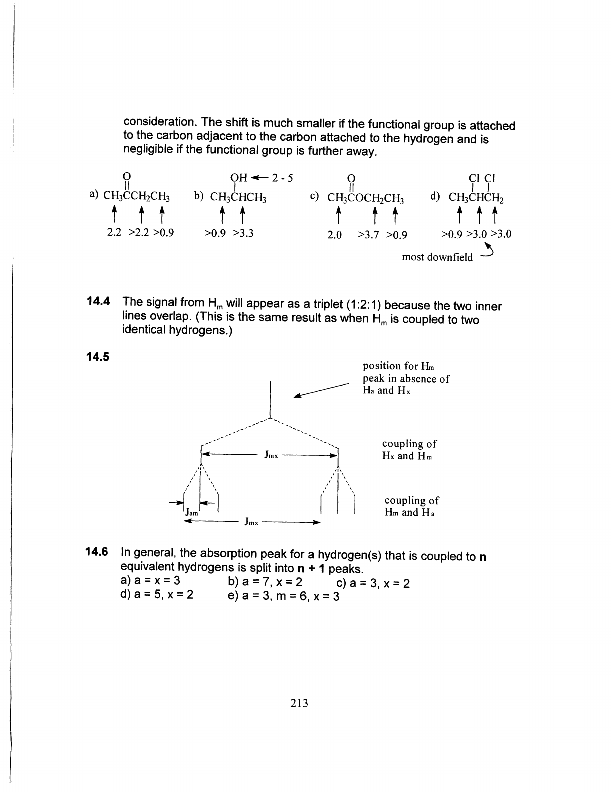 consideration. The shift is much smaller if the functional group is attached to the carbon adjacent to the carbon attached to the hydrogen and is negligible if the functional group is further away. O OH 5 0 CI CI a) CH₃CCH₂CH₃ b) CH₃CHCH₃ c) CH₃COCH₂CH₃ d) CH₃CHCH₂ 2.2 >2.2 >0.9 >0.9 >3.3 2.0 >3.7 >0.9 >0.9 >3.0 >3.0 most downfield 14.4 The signal from Hₘ will appear as a triplet (1:2:1) because the two inner lines overlap. (This is the same result as when Hₘ is coupled to two identical hydrogens.) 14.5 position for peak in absence of and Hx coupling of Jₘₓ Hx and coupling of Hₘ and Jₘₓ 14.6 In general, the absorption peak for a hydrogen(s) that is coupled to n equivalent hydrogens is split into n+1 peaks. a)a=x=3 c) a = 3, X = 2 d) a = 5, 213