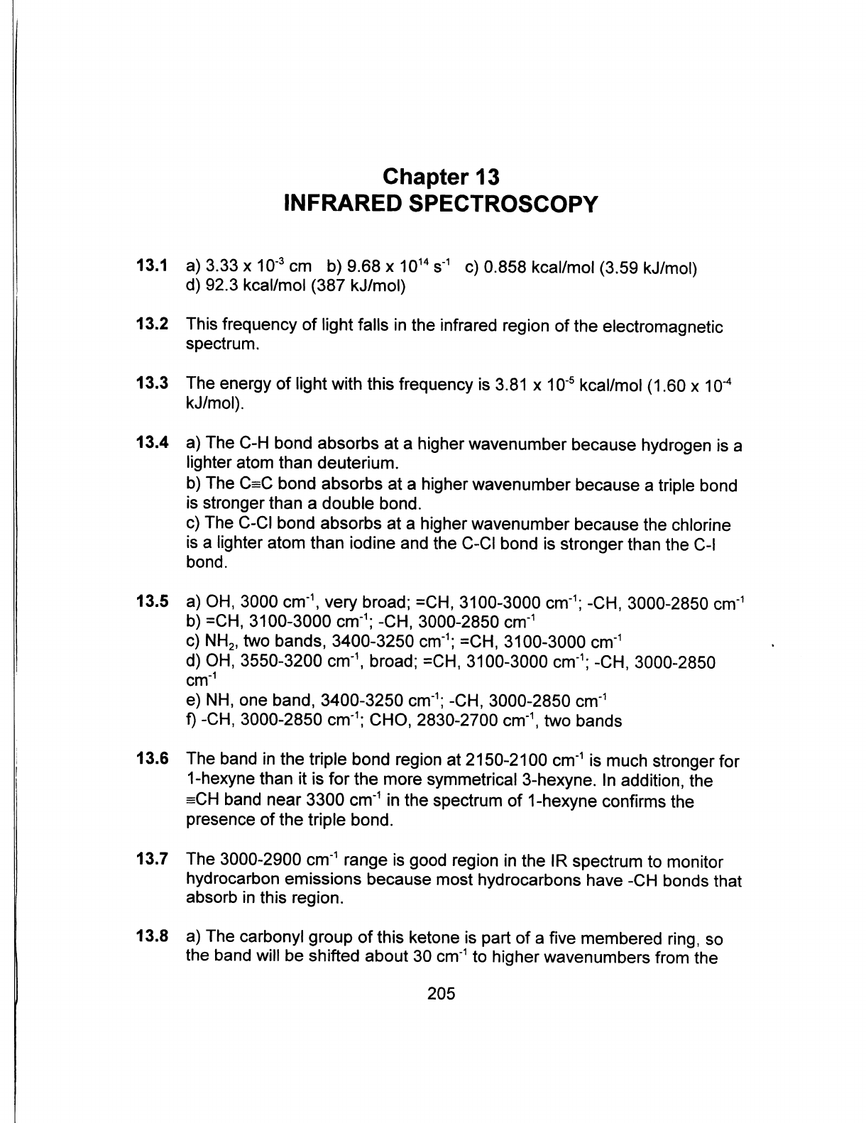 Chapter 13 INFRARED SPECTROSCOPY 13.1 a) 3.33 X 10⁻³ cm b) 9.68 X 10¹⁴ c) 0.858 kcal/mol (3.59 kJ/mol) d) 92.3 kcal/mol (387 kJ/mol) 13.2 This frequency of light falls in the infrared region of the electromagnetic spectrum. 13.3 The energy of light with this frequency is 3.81 X 10⁻⁵ kcal/mol (1.60 X 10⁻⁴ kJ/mol). 13.4 a) The C-H bond absorbs at a higher wavenumber because hydrogen is a lighter atom than deuterium. b) The C=C bond absorbs at a higher wavenumber because a triple bond is stronger than a double bond. c) The C-CI bond absorbs at a higher wavenumber because the chlorine is a lighter atom than iodine and the C-CI bond is stronger than the C-I bond. 13.5 a) OH, 3000 cm⁻¹, very broad; =CH, 3100-3000 cm⁻¹; -CH, 3000-2850 cm⁻¹ b) =CH, 3100-3000 cm⁻¹; -CH, 3000-2850 cm⁻¹ c) NH₂, two bands, 3400-3250 cm⁻¹; =CH, 3100-3000 cm⁻¹ d) OH, 3550-3200 cm⁻¹, broad; =CH, 3100-3000 cm⁻¹; -CH, 3000-2850 cm⁻¹ e) NH, one band, 3400-3250 cm⁻¹; -CH, 3000-2850 cm⁻¹ f) -CH, 3000-2850 cm⁻¹; CHO, 2830-2700 cm⁻¹, two bands 13.6 The band in the triple bond region at 2150-2100 cm⁻¹ is much stronger for 1-hexyne than it is for the more symmetrical 3-hexyne. In addition, the =CH band near 3300 cm⁻¹ in the spectrum of 1-hexyne confirms the presence of the triple bond. 13.7 The 3000-2900 cm⁻¹ range is good region in the IR spectrum to monitor hydrocarbon emissions because most hydrocarbons have -CH bonds that absorb in this region. 13.8 a) The carbonyl group of this ketone is part of a five membered ring, so the band will be shifted about 30 cm⁻¹ to higher wavenumbers from the 205