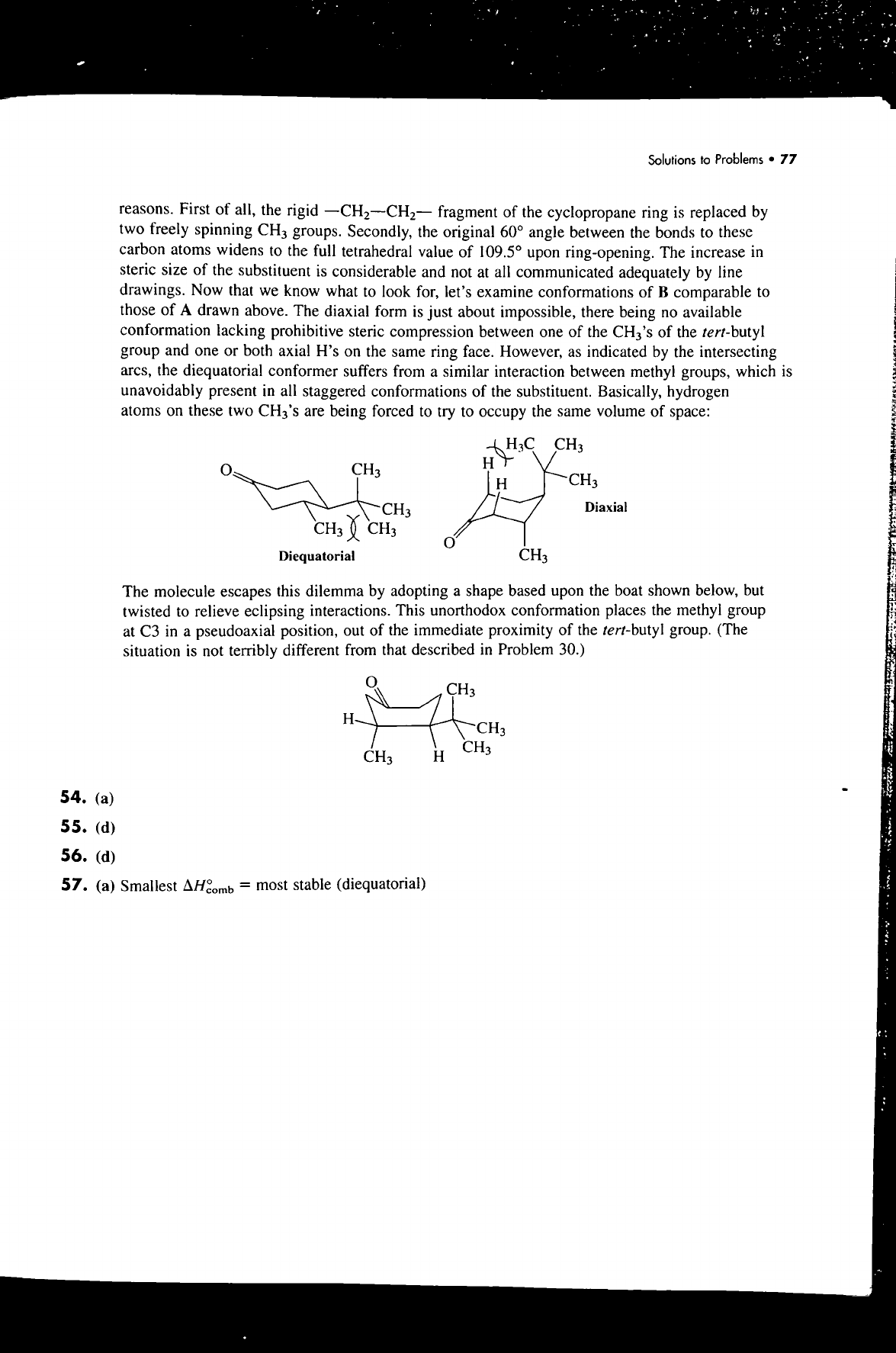 Solutions to Problems 77 reasons. First of all, the rigid fragment of the cyclopropane ring is replaced by two freely spinning CH₃ groups. Secondly, the original 60° angle between the bonds to these carbon atoms widens to the full tetrahedral value of 109.5° upon ring-opening. The increase in steric size of the substituent is considerable and not at all communicated adequately by line drawings. Now that we know what to look for, let's examine conformations of B comparable to those of A drawn above. The diaxial form is just about impossible, there being no available conformation lacking prohibitive steric compression between one of the CH₃'s of the tert-butyl group and one or both axial H's on the same ring face. However, as indicated by the intersecting arcs, the diequatorial conformer suffers from a similar interaction between methyl groups, which is unavoidably present in all staggered conformations of the substituent. Basically, hydrogen atoms on these two CH₃'s are being forced to try to occupy the same volume of space: CH₃ H O CH₃ H CH₃ CH₃ Diaxial CH₃ CH₃ O Diequatorial CH₃ The molecule escapes this dilemma by adopting a shape based upon the boat shown below, but twisted to relieve eclipsing interactions. This unorthodox conformation places the methyl group at C3 in a pseudoaxial position, out of the immediate proximity of the tert-butyl group. (The situation is not terribly different from that described in Problem 30.) CH₃ H CH₃ CH₃ CH₃ H 54. (a) 55. (d) 56. (d) 57. (a) Smallest = most stable (diequatorial)