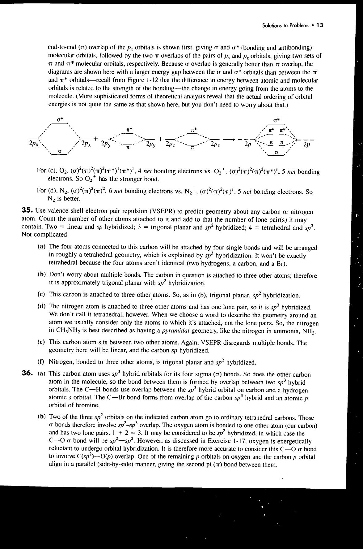 Solutions to Problems 13 end-to-end (o) overlap of the Px orbitals is shown first, giving σ and (bonding and antibonding) molecular orbitals, followed by the two overlaps of the pairs of and P₂ orbitals, giving two sets of and π* molecular orbitals, respectively. Because σ overlap is generally better than TT overlap, the diagrams are shown here with a larger energy gap between the σ and orbitals than between the and π* orbitals-recall from Figure that the difference in energy between atomic and molecular orbitals is related to the strength of the bonding-the change in energy going from the atoms to the molecule. (More sophisticated forms of theoretical analysis reveal that the actual ordering of orbital energies is not quite the same as that shown here, but you don't need to worry about that.) σ* π* π* π* π* + + 2px 2p₂ 2p 2p π π σ For (c), O₂, 4 net bonding electrons O₂⁺, 5 net bonding electrons. So O₂⁺ has the stronger bond. For (d), N₂, 6 net bonding electrons 5 net bonding electrons. So N₂ is better. 35. Use valence shell electron pair repulsion (VSEPR) to predict geometry about any carbon or nitrogen atom. Count the number of other atoms attached to it and add to that the number of lone pair(s) it may contain. Two = linear and sp hybridized; 3 = trigonal planar and sp² hybridized; 4 = tetrahedral and sp³. Not complicated. (a) The four atoms connected to this carbon will be attached by four single bonds and will be arranged in roughly a tetrahedral geometry, which is explained by sp³ hybridization. It won't be exactly tetrahedral because the four atoms aren't identical (two hydrogens, a carbon, and a Br). (b) Don't worry about multiple bonds. The carbon in question is attached to three other atoms; therefore it is approximately trigonal planar with sp² hybridization. (c) This carbon is attached to three other atoms. So, as in (b), trigonal planar, sp² hybridization. (d) The nitrogen atom is attached to three other atoms and has one lone pair, so it is sp³ hybridized. We don't call it tetrahedral, however. When we choose a word to describe the geometry around an atom we usually consider only the atoms to which it's attached, not the lone pairs. So, the nitrogen in CH₃NH₂ is best described as having a pyramidal geometry, like the nitrogen in ammonia, NH₃. (e) This carbon atom sits between two other atoms. Again. VSEPR disregards multiple bonds. The geometry here will be linear, and the carbon sp hybridized. (f) Nitrogen, bonded to three other atoms, is trigonal planar and sp² hybridized. 36. (a) This carbon atom uses sp³ hybrid orbitals for its four sigma (σ) bonds. So does the other carbon atom in the molecule, so the bond between them is formed by overlap between two sp³ hybrid orbitals. The C-H bonds use overlap between the sp³ hybrid orbital on carbon and a hydrogen atomic orbital. The C-Br bond forms from overlap of the carbon sp³ hybrid and an atomic p orbital of bromine. (b) Two of the three sp² orbitals on the indicated carbon atom go to ordinary tetrahedral carbons. Those σ bonds therefore involve sp²-sp³ overlap. The oxygen atom is bonded to one other atom (our carbon) and has two lone pairs. + 2 = 3. It may be considered to be sp² hybridized, in which case the σ bond will be However, as discussed in Exercise 1-17. oxygen is energetically reluctant to undergo orbital hybridization. It is therefore more accurate to consider this σ bond to involve overlap. One of the remaining p orbitals on oxygen and the carbon orbital align in a parallel (side-by-side) manner, giving the second pi (π) bond between them.