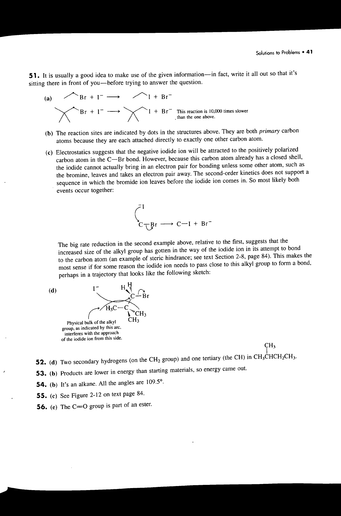 Solutions to Problems 41 51. It is usually a good idea to make use of the given information-in fact, write it all out so that it's sitting there in front of you-before trying to answer the question. (a) Br + I⁻ I + Br⁻ Br + I + Br⁻ This reaction is 10,000 times slower than the one above. (b) The reaction sites are indicated by dots in the structures above. They are both primary carbon atoms because they are each attached directly to exactly one other carbon atom. (c) Electrostatics suggests that the negative iodide ion will be attracted to the positively polarized carbon atom in the C-Br bond. However, because this carbon atom already has a closed shell, the iodide cannot actually bring in an electron pair for bonding unless some other atom, such as the bromine, leaves and takes an electron pair away. The second-order kinetics does not support a sequence in which the bromide ion leaves before the iodide ion comes in. So most likely both events occur together: I C Br The big rate reduction in the second example above, relative to the first, suggests that the increased size of the alkyl group has gotten in the way of the iodide ion in its attempt to bond to the carbon atom (an example of steric hindrance; see text Section 2-8, page 84). This makes the most sense if for some reason the iodide ion needs to pass close to this alkyl group to form a bond, perhaps in a trajectory that looks like the following sketch: H (d) H C Br CH₃ Physical bulk of the alkyl CH₃ group, as indicated by this arc, interferes with the approach of the iodide ion from this side. CH₃ 52. (d) Two secondary hydrogens (on the CH₂ group) and one tertiary (the CH) in 53. (b) Products are lower in energy than starting materials, so energy came out. 54. (b) It's an alkane. All the angles are 109.5°. 55. (c) See Figure 2-12 on text page 84. 56. (e) The C=0 group is part of an ester.