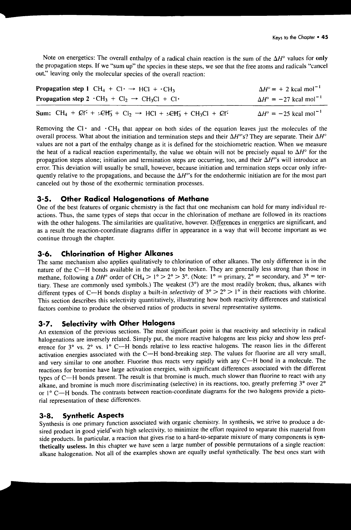 Keys to the Chapter 45 Note on energetics: The overall enthalpy of a radical chain reaction is the sum of the values for only the propagation steps. If we "sum up" the species in these steps, we see that the free atoms and radicals "cancel out," leaving only the molecular species of the overall reaction: Propagation step 1 CH₄ + HCI + CH₃ = + 2 kcal Propagation step 2 CH₃ + Cl₂ CH₃Cl + = 27 kcal Sum: CH₄ + + + Cl₂ HCI + + + = 25 kcal Removing the and CH₃ that appear on both sides of the equation leaves just the molecules of the overall process. What about the initiation and termination steps and their They are separate. Their values are not a part of the enthalpy change as it is defined for the stoichiometric reaction. When we measure the heat of a radical reaction experimentally, the value we obtain will not be precisely equal to for the propagation steps alone; initiation and termination steps are occurring, too, and their will introduce an error. This deviation will usually be small, however, because initiation and termination steps occur only infre- quently relative to the propagations, and because the for the endothermic initiation are for the most part canceled out by those of the exothermic termination processes. 3-5. Other Radical Halogenations of Methane One of the best features of organic chemistry is the fact that one mechanism can hold for many individual re- actions. Thus, the same types of steps that occur in the chlorination of methane are followed in its reactions with the other halogens. The similarities are qualitative, however. Differences in energetics are significant, and as a result the diagrams differ in appearance in a way that will become important as we continue through the chapter. 3-6. Chlorination of Higher Alkanes The same mechanism also applies qualitatively to chlorination of other alkanes. The only difference is in the nature of the C-H bonds available in the alkane to be broken. They are generally less strong than those in methane, following a DH° order of CH₄ > 1° > 2° > 3°. (Note: 1° = primary, 2° = secondary, and 3° = ter- tiary. These are commonly used symbols.) The weakest (3°) are the most readily broken; thus, alkanes with different types of C-H bonds display a built-in selectivity of 3° > 2° > 1° in their reactions with chlorine. This section describes this selectivity quantitatively, illustrating how both reactivity differences and statistical factors combine to produce the observed ratios of products in several representative systems. 3-7. Selectivity with Other Halogens An extension of the previous sections. The most significant point is that reactivity and selectivity in radical halogenations are inversely related. Simply put, the more reactive halogens are less picky and show less pref- erence for 3° 2° vs. 1° C-H bonds relative to less reactive halogens. The reason lies in the different activation energies associated with the C-H bond-breaking step. The values for fluorine are all very small, and very similar to one another. Fluorine thus reacts very rapidly with any C-H bond in a molecule. The reactions for bromine have large activation energies, with significant differences associated with the different types of C-H bonds present. The result is that bromine is much, much slower than fluorine to react with any alkane, and bromine is much more discriminating (selective) in its reactions, too, greatly preferring 3° over 2° or 1° C-H bonds. The contrasts between reaction-coordinate diagrams for the two halogens provide a picto- rial representation of these differences. 3-8. Synthetic Aspects Synthesis is one primary function associated with organic chemistry. In synthesis, we strive to produce a de- sired product in good yield with high selectivity, to minimize the effort required to separate this material from side products. In particular, a reaction that gives rise to a hard-to-separate mixture of many components is syn- thetically useless. In this chapter we have seen a large number of possible permutations of a single reaction: alkane halogenation. Not all of the examples shown are equally useful synthetically. The best ones start with