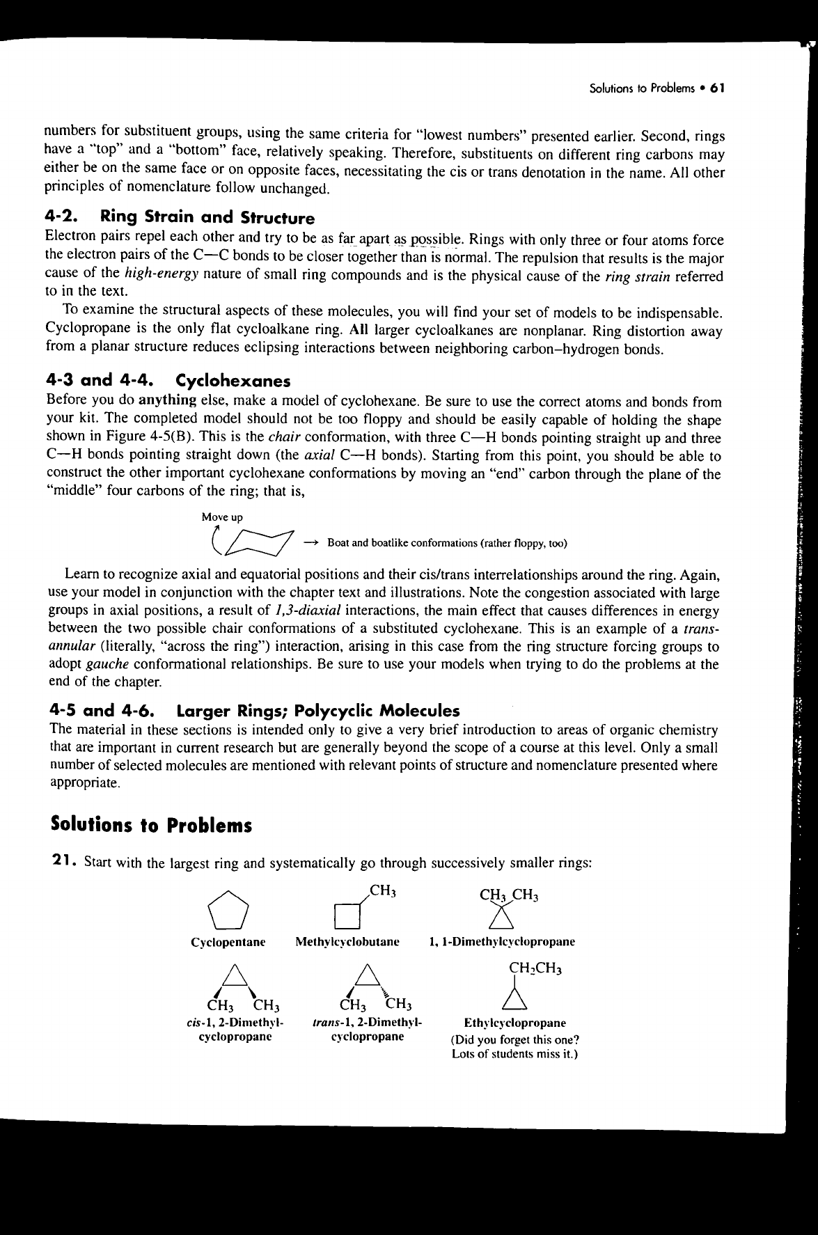 Solutions to Problems 61 numbers for substituent groups, using the same criteria for "lowest numbers" presented earlier. Second, rings have a "top" and a "bottom" face, relatively speaking. Therefore, substituents on different ring carbons may either be on the same face or on opposite faces, necessitating the cis or trans denotation in the name. All other principles of nomenclature follow unchanged. 4-2. Ring Strain and Structure Electron pairs repel each other and try to be as far apart as possible. Rings with only three or four atoms force the electron pairs of the bonds to be closer together than is normal. The repulsion that results is the major cause of the high-energy nature of small ring compounds and is the physical cause of the ring strain referred to in the text. To examine the structural aspects of these molecules, you will find your set of models to be indispensable. Cyclopropane is the only flat cycloalkane ring. All larger cycloalkanes are nonplanar. Ring distortion away from a planar structure reduces eclipsing interactions between neighboring carbon-hydrogen bonds. 4-3 and 4-4. Cyclohexanes Before you do anything else, make a model of cyclohexane. Be sure to use the correct atoms and bonds from your kit. The completed model should not be too floppy and should be easily capable of holding the shape shown in Figure 4-5(B). This is the chair conformation, with three C-H bonds pointing straight up and three C-H bonds pointing straight down (the axial C-H bonds). Starting from this point, you should be able to construct the other important cyclohexane conformations by moving an "end" carbon through the plane of the "middle" four carbons of the ring; that is, Move up Boat and boatlike conformations (rather floppy, too) Learn to recognize axial and equatorial positions and their cis/trans interrelationships around the ring. Again, use your model in conjunction with the chapter text and illustrations. Note the congestion associated with large groups in axial positions, a result of 1,3-diaxial interactions, the main effect that causes differences in energy between the two possible chair conformations of a substituted cyclohexane. This is an example of a trans- annular (literally, "across the ring") interaction, arising in this case from the ring structure forcing groups to adopt gauche conformational relationships. Be sure to use your models when trying to do the problems at the end of the chapter. 4-5 and 4-6. Larger Rings; Polycyclic Molecules The material in these sections is intended only to give a very brief introduction to areas of organic chemistry that are important in current research but are generally beyond the scope of a course at this level. Only a small number of selected molecules are mentioned with relevant points of structure and nomenclature presented where appropriate. Solutions to Problems 21. Start with the largest ring and systematically go through successively smaller rings: CH₃ CH₃ CH₃ Cyclopentane Methylcyclobutane 1, 1-Dimethylcyclopropane CH₂CH₃ CH₃ CH₃ CH₃ CH₃ cis-1, 2-Dimethyl- trans-1, 2-Dimethyl- Ethylcyclopropane cyclopropane cyclopropane (Did you forget this one? Lots of students miss it.)