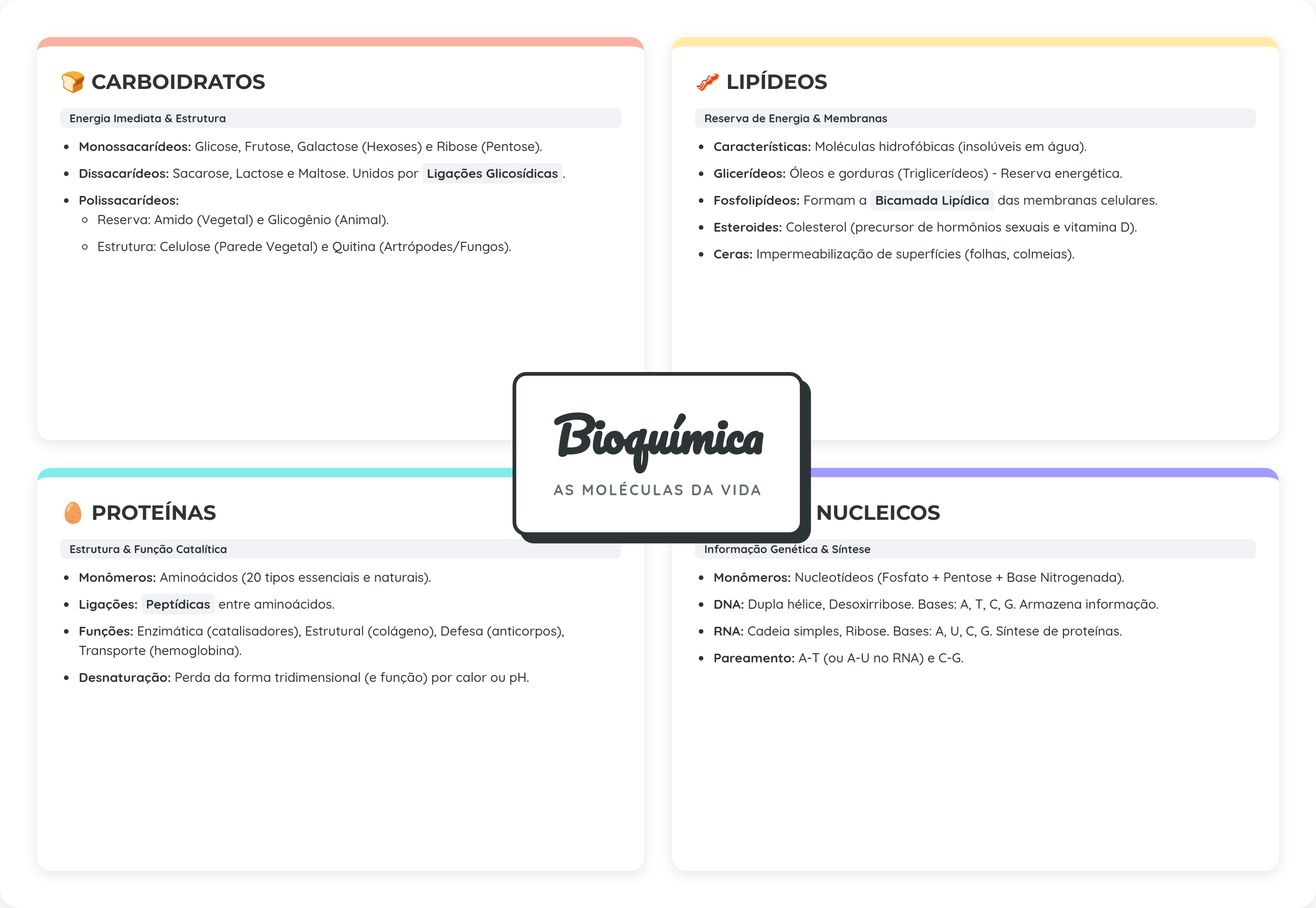CARBOIDRATOS LIPÍDEOS Energia Imediata & Estrutura Reserva de Energia & Membranas Monossacarídeos: Glicose, Frutose, Galactose (Hexoses) e Ribose (Pentose). Características: Moléculas hidrofóbicas (insolúveis em água). Dissacarídeos: Sacarose, Lactose e Maltose. Unidos por Ligações Glicosídicas Glicerídeos: Óleos e gorduras (Triglicerídeos) Reserva energética. Polissacarídeos: Fosfolipídeos: Formam a Bicamada Lipídica das membranas celulares. Reserva: Amido (Vegetal) e Glicogênio (Animal). Esteroides: Colesterol (precursor de hormônios sexuais e vitamina D). Estrutura: Celulose (Parede Vegetal) e Quitina (Artrópodes/Fungos). Ceras: Impermeabilização de superfícies (folhas, colmeias). Bioquímica AS MOLÉCULAS DA VIDA PROTEÍNAS NUCLEICOS Estrutura & Função Catalítica Informação Genética & Síntese Monômeros: Aminoácidos (20 tipos essenciais e naturais). Monômeros: Nucleotídeos (Fosfato + Pentose + Base Nitrogenada). Ligações: Peptídicas entre aminoácidos. DNA: Dupla hélice, Desoxirribose. Bases: T, C, G. Armazena informação. Funções: Enzimática (catalisadores), Estrutural (colágeno), Defesa (anticorpos), RNA: Cadeia simples, Ribose. Bases: A, U,C, G. Síntese de proteínas. Transporte (hemoglobina). Pareamento: A-T (ou A-U no RNA) e C-G. Desnaturação: Perda da forma tridimensional (e função) por calor ou pH.