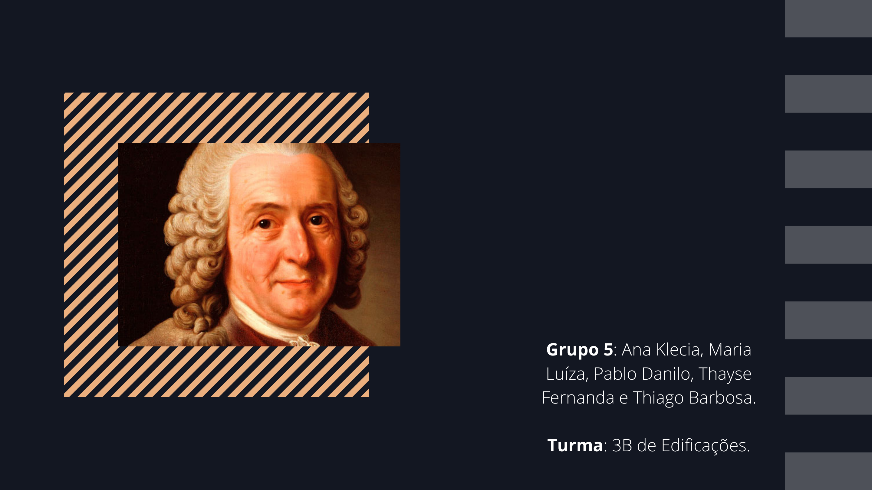 LINEU O Pai da Taxonomia Moderna Grupo 5: Ana Klecia, Maria Luíza, Pablo Danilo, Thayse Fernanda e Thiago Barbosa. Turma: 3B de Edificações. BIOGRAFIA - MARIA LUÍZA INFÂNCIA E JUVENTUDE - THIAGO BARBOSA A CARREIRA DE LINEU + NOMENCLATURA BINOMIAL - PABLO DANILO SUAS OBRAS + SEUS ÚLTIMOS ANOS - ANA KLECIA CONCLUSÃO + SLIDES - THAYSE FERNANDA TÓPICOS DA APRESENTAÇÃOTÓPICOS DA APRESENTAÇÃO Biografia NOME: CARLOS LINEU (CARL VON LINNÉ). NASCEU EM 23 DE MAIO DE 1707. FOI UM BOTÂNICO, ZOÓLOGO E MÉDICO SUECO. RESPONSÁVEL PELA CLASSIFICAÇÃO E NOMEAÇÃO DOS SERES VIVOS. FOI UM DOS FUNDADORES DA ACADEMIA REAL DAS CIÊNCIAS DA SUÉCIA. INFÂNCIA & JUVENTUDE AOS 8 ANOS, ERA CHAMADO DE "PEQUENO BOTÂNICO". COMEÇOU A ESTUDAR MEDICINA AOS 20 ANOS. DEU AULAS DE BOTÂNICA NA UNIVERSIDADE DE UPSALLA. EM 1732, VIAJOU PARA A LAPÔNIA. EM 1737, DIVULGOU PARA O SEU LIVRO "FLORA LAPPONICA", OS RESULTADOS DO SEU ESTUDO DAS PLANTAS. A CARREIRA DE LINEU EM 1732, CONSEGUIU O SEU DIPLOMA, E TORNOU-SE DIRETOR DE UM GRANDE JARDIM BOTÂNICO. OBRAS: SYSTEMA NATURAE E GENERA PLANTARUM. CRIAÇÃO DA NOMENCLATURA BINOMIAL. NOMENCLATURA BINOMIAL I - TODO SER VIVO DEVE POSSUIR, PELO MENOS, DOIS NOMES. gênero + epíteto específico REGRAS DA NOMENCLATURA: (Espécie ou Nome Científico) Exemplos: mosquito da dengue, cachorro e milho. Aedes aegypti Canis familiaris Zea mays NOMENCLATURA BINOMIAL II - DEVEM SER ESCRITOS EM LATIM OU LATINIZADOS. III - LETRA INICIAL DO GÊNERO EM MAIÚSCULA. IV - LETRA INICIAL DO EPÍTETO ESPECÍFICO EM MINÚSCULA. OBSERVAÇÃO: pODE SER ESCRITO COM A LETRA INICIAL MAIÚSCULA em HOMENAGEm a UMA PESSOA ILUSTRE. Exemplo: Trypanosoma Cruzi NOMENCLATURA BINOMIAL V - DEVE-SE DAR AO NOME CIENTÍFICO UM DESTAQUE (ESCRITO EM NEGRITO, ITÁLICO OU SUBLINHADO). Exemplo: gato Felis catus - negrito Felis catus - itálico Felis catus - sublinhado VI - SUBGÊNERO. ENTRE O GÊNERO E O EPÍTETO ESPECÍFICO LETRA INICIAL MAIÚSCULA ENTRE PARENTESES Exemplo: Anopheles (Nyssorhynchus) darlingi NOMENCLATURA BINOMIAL VII - SUBSPÉCIE. APÓS O NOME DA ESPÉCIE LETRA INICIAL MINÚSCULA NÃO POSSUI PARENTESES Exemplos: Crotalus durissus terrificus Homo sapiens sapiens SUAS OBRAS Systema naturae (1735) Fundamenta botanica (1736) Flora lapponica (1737) Genera plantarum (1735-1737) Hortus Cliffortianus (1737) Flora Suecica (1745) Fauna Suecica (1746) Philosophia botanica (1751) Species plantarum (1753) Clavis medicinae duplex (1766) Mundus invisibilis (1767) SEUS ÚLTIMOS ANOS CONTINUOU OS SEUS ESTUDOS BOTÂNICOS. SOFREU DE GOTA E DORES DE DENTES. TEVE DOIS ACIDENTES VASCULARES. FALECEU EM 10 DE JANEIRO DE 1778. EM 1784, SUA ESPOSA VENDEU SUAS COLEÇÕES DE SINLVADO AO SIR JAMES EDWARD SMITH. UMA FIGURA IMPORTANTE PARA A BIOLOGIA. PAI DA TAXONOMIA E PIONEIRO DA ECOLOGIA. ORGANIZOU, ORDENOU E INVENTARIOU OS SERES VIVOS. A NOMENCLATURA BINOMIAL FOI O SEU MAIOR LEGADO. CON CLU sÃO 1 - REINO 2 - FILO 3 - CLASSE 4 - ORDEM 5 - FAMÍLIA 6 - GÊNERO 7 - ESPÉCIE CONCON CLUCLU sÃOsÃO REFERÊNCIASREFERÊNCIAS OBRIGADO A TODOS PELA ATENÇÃO! HTTPS://ESCOLA.BRITANNICA.COM.BR/ARTIGO/CARLOS-LINEU/632188 HTTPS://MUNDOEDUCACAO.UOL.COM.BR/BIOLOGIA/NOMENCLATURA- BINOMIAL-LINEU.HTM HTTPS://WWW.BIOLOGIANET.COM/BIODIVERSIDADE/NOMENCLATURA- BINOMIAL-LINEU.HTM HTTPS://BIOLOGO.COM.BR/BIO/LINEU/ HTTPS://BIOMANIA.COM.BR/ARTIGO/LINEU LINEU O Pai da Taxonomia Moderna Biografia INFÂNCIA & JUVENTUDE A CARREIRA DE LINEU NOMENCLATURA BINOMIAL REGRAS DA NOMENCLATURA: I - TODO SER VIVO DEVE POSSUIR, PELO MENOS, DOIS NOMES. Aedes aegypti Canis familiaris Zea mays gênero + epíteto específico (Espécie ou Nome Científico) NOMENCLATURA BINOMIAL OBSERVAÇÃO: Exemplo: Trypanosoma Cruzi II - DEVEM SER ESCRITOS EM LATIM OU LATINIZADOS. III - LETRA INICIAL DO GÊNERO EM MAIÚSCULA. IV - LETRA INICIAL DO EPÍTETO ESPECÍFICO EM MINÚSCULA. NOMENCLATURA BINOMIAL VI - SUBGÊNERO. Exemplo: Anopheles (Nyssorhynchus) darlingi V - DEVE-SE DAR AO NOME CIENTÍFICO UM DESTAQUE (ESCRITO EM NEGRITO, ITÁLICO OU SUBLINHADO). Exemplo: gato Felis catus - negrito Felis catus - itálico Felis catus - sublinhado NOMENCLATURA BINOMIAL VII - SUBSPÉCIE. Exemplos: Crotalus durissus terrificus Homo sapiens sapiens SUAS OBRAS SEUS ÚLTIMOS ANOS CON CLU sÃO 1 - REINO 2 - FILO 3 - CLASSE 4 - ORDEM 5 - FAMÍLIA 6 - GÊNERO 7 - ESPÉCIE OBRIGADO A TODOS PELA ATENÇÃO!