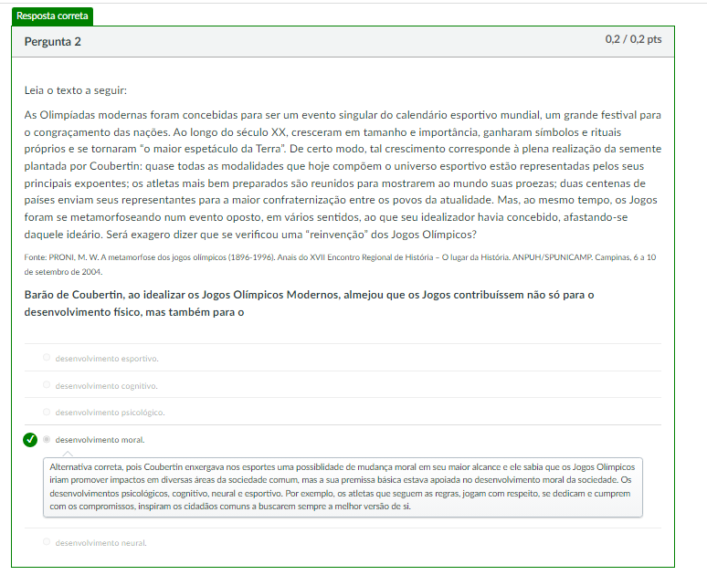 Resposta correta Pergunta 2 / pts Leia O texto a seguir: As modernas foram concebidas para ser um evento singular do calendário esportivo mundial, um grande festival para O congraçamento das nações. Ao longo do século XX, cresceram em tamanho e importância, ganharam e rituais próprios e se tornaram "o maior espetáculo da Terra". De certo modo, tal crescimento corresponde à plena realização da semente plantada por Coubertin: quase todas as modalidades que hoje compõem O universo esportivo estão representadas pelos seus principais os atletas mais bem preparados são reunidos para mostrarem ao mundo suas proezas; duas centenas de paises enviam seus representantes para a maior confraternização entre os povos da atualidade. ao mesmo tempo, os Jogos foram se metamorfoseando num evento oposto, em vários sentidos, ao que seu idealizador havia concebido, afastando-se daquele ideário. exagero dizer que se verificou uma "reinvenção" dos Jogos Olimpicos? Fonte: M. W. A metamorfose dos jogos olimpicos (1896-1996). Anais do XVII Encontro Regional de História lugar da ANPUH/SPUNICAMP Campinas, 6 10 de setembro de 2004. Barão de Coubertin, ao idealizar Jogos Olímpicos Modernos, almejou que os Jogos contribuissem não só para 0 desenvolvimento físico, mas também para 0 desenvolvimento esportivo. desenvolvimento cognitivo. desenvolvimento desenvolvimento Alternativa correta, pois Coubertin enxergava nos esportes uma possiblidade de mudança moral em seu maior alcance ele sabia que Jogos Olimpicos iriam promover impactos diversas da sociedade comum, mas a sua premissa básica estava apoiada no desenvolvimento moral da sociedade. Os desenvolvimentos cognitivo, neural e esportivo. Por exemplo, atletas que seguem as regras, jogam com respeito, se dedicam e cumprem com os inspiram os cidadãos comuns a buscarem sempre a melhor versão de si. desenvolvimento neural.
