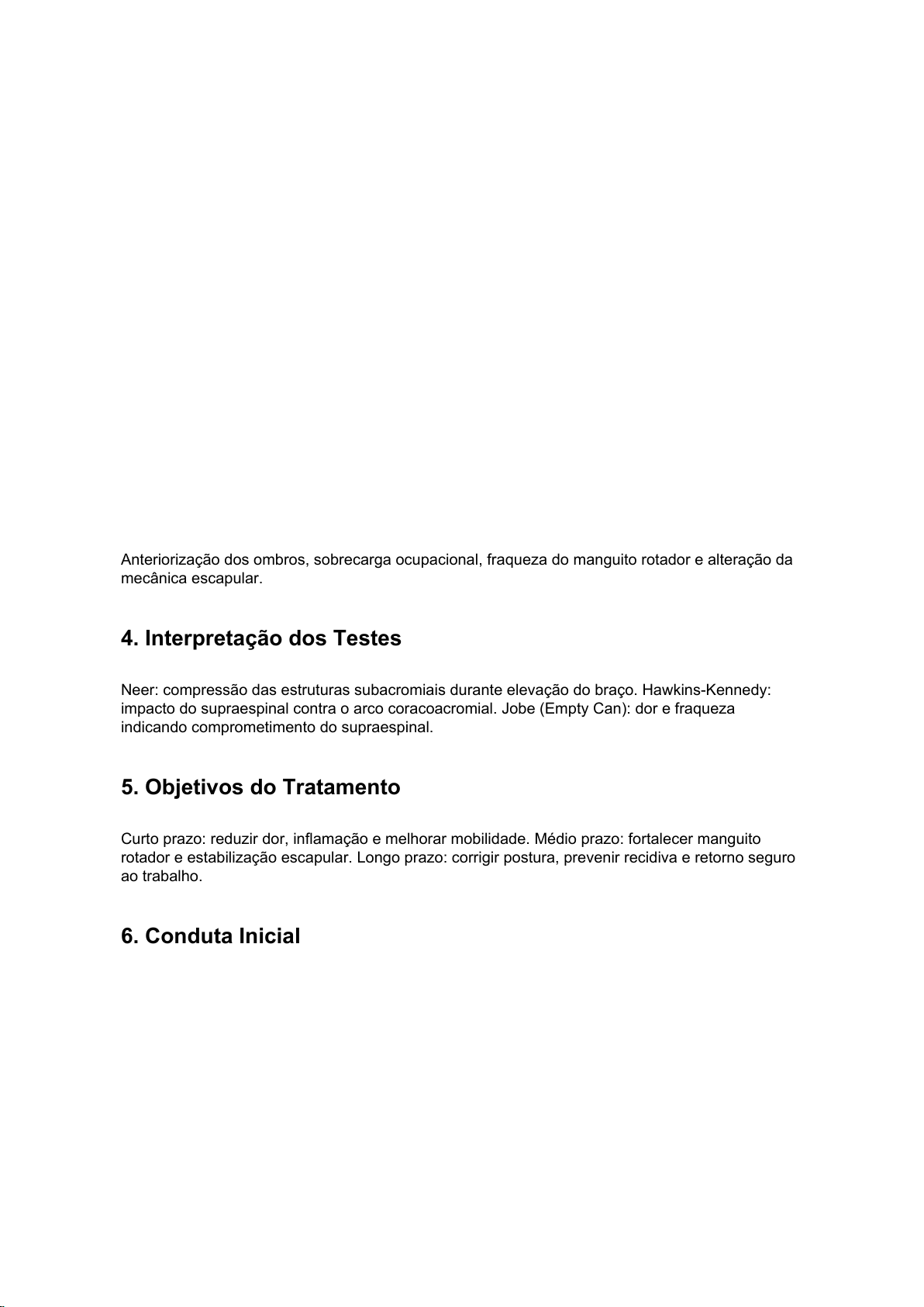 Resumo – Fisioterapia Ortopédica 1. Diagnóstico Fisioterapêutico Quadro compatível com síndrome do impacto subacromial associada à tendinopatia do supraespinal. Principais sinais: dor ao elevar o braço, dor à palpação do tendão, diminuição da amplitude de movimento e testes ortopédicos positivos (Neer, Hawkins-Kennedy e Jobe). 2. Estruturas Possivelmente Comprometidas Tendão do supraespinal, bursa subacromial, manguito rotador e espaço subacromial. Movimentos repetitivos acima da cabeça, como no trabalho de pintor, aumentam o risco de impacto. 3. Fatores Contribuintes Anteriorização dos ombros, sobrecarga ocupacional, fraqueza do manguito rotador e alteração da mecânica escapular. 4. Interpretação dos Testes Neer: compressão das estruturas subacromiais durante elevação do braço. Hawkins-Kennedy: impacto do supraespinal contra o arco coracoacromial. Jobe (Empty Can): dor e fraqueza indicando comprometimento do supraespinal. 5. Objetivos do Tratamento Curto prazo: reduzir dor, inflamação e melhorar mobilidade. Médio prazo: fortalecer manguito rotador e estabilização escapular. Longo prazo: corrigir postura, prevenir recidiva e retorno seguro ao trabalho. 6. Conduta Inicial Controle da dor com TENS e crioterapia. Mobilidade com exercícios pendulares (Codman) e mobilizações assistidas. Alongamentos de peitoral maior, deltoide anterior e cápsula posterior. 7. Dor Femoropatelar Envolve a articulação femoropatelar. O músculo mais importante para estabilização da patela é o vasto medial oblíquo (VMO). Fatores contribuintes incluem fraqueza do quadríceps e desalinhamento patelar. Mobile User 8. Exercícios Utilizados Fortalecimento do quadríceps (isometria, elevação da perna estendida, extensão de joelho). Cadeia cinética fechada (mini agachamento, leg press leve, step-up). Fortalecimento de quadril (abdução com elástico, ponte, clamshell). Alongamentos e treino de equilíbrio para melhorar controle neuromuscular.