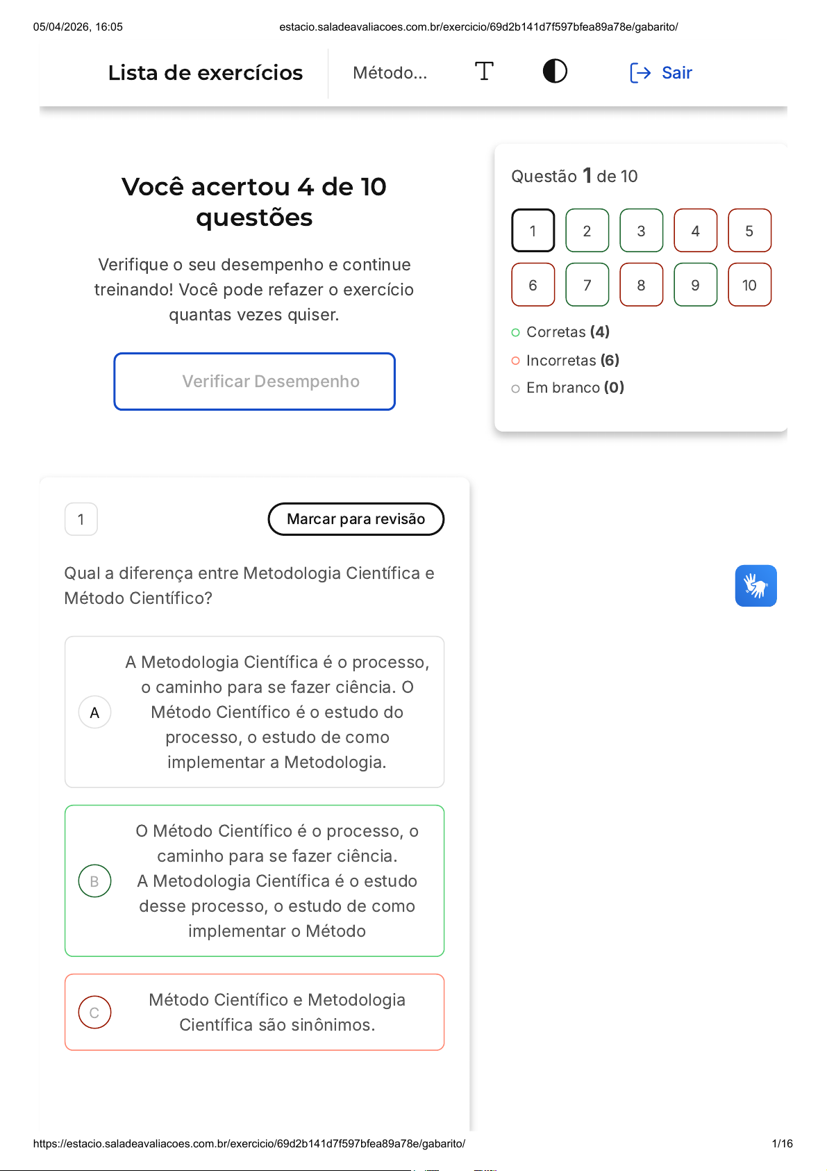 Você acertou 4 de 10 questões Verifique o seu desempenho e continue treinando! Você pode refazer o exercício quantas vezes quiser. Verificar Desempenho A B C 1 Marcar para revisão Qual a diferença entre Metodologia Científica e Método Científico? A Metodologia Científica é o processo, o caminho para se fazer ciência. O Método Científico é o estudo do processo, o estudo de como implementar a Metodologia. O Método Científico é o processo, o caminho para se fazer ciência. A Metodologia Científica é o estudo desse processo, o estudo de como implementar o Método Método Científico e Metodologia Científica são sinônimos. Questão 1 de 10 Corretas (4) Incorretas (6) Em branco (0) 1 2 3 4 5 6 7 8 9 10 Lista de exercícios Método… Sair 05/04/2026, 16:05 estacio.saladeavaliacoes.com.br/exercicio/69d2b141d7f597bfea89a78e/gabarito/ https://estacio.saladeavaliacoes.com.br/exercicio/69d2b141d7f597bfea89a78e/gabarito/ 1/16 D E Método Científico e Metodologia Científica têm significados opostos. O Método Científico é a experimentação. A Metodologia Científica é a execução, do Método. Resposta incorreta Opa! A alternativa correta é a letra B. Confira o gabarito comentado! Gabarito Comentado A resposta correta é: O Método Científico é o processo, o caminho para se fazer ciência. A Metodologia Científica é o estudo desse processo, o estudo de como implementar o Método. A Metodologia Científica é o estudo do processo adotado para alcançar os propósitos do método científico. O Método Científico é o processo, o caminho para se fazer ciência. 2 Marcar para revisão Dentre os filósofos gregos que deixaram um impacto duradouro na ciência, Arquimedes se destacou por suas contribuições fundamentais para a mecânica dos fluidos. Seu "Princípio do Empuxo" é uma das pedras angulares desse campo, explicando o fenômeno que ocorre quando um corpo é imerso em um fluido. Arquimedes foi o primeiro filósofo-cientista a seguir o que chamamos atualmente de 05/04/2026, 16:05 estacio.saladeavaliacoes.com.br/exercicio/69d2b141d7f597bfea89a78e/gabarito/ https://estacio.saladeavaliacoes.com.br/exercicio/69d2b141d7f597bfea89a78e/gabarito/ 2/16 A B C D E Teoria da Relatividade. Método Científico. Princípio da Incerteza. Lógica Dedutiva. Dialética Hegeliana. Resposta correta Parabéns, você selecionou a alternativa correta. Confira o gabarito comentado! Gabarito Comentado Arquimedes (287-212 a.C.), famoso pelo Princípio de Arquimedes e pelo Princípio do empuxo da mecânica dos fluidos, há mais de dois mil anos, foi o primeiro filósofo- cientista a seguir o que chamamos atualmente de Método Científico. 3 Marcar para revisão Francis Bacon é conhecido por suas contribuições que enfatizavam a observação, a indução e a experimentação como componentes essenciais para a descoberta de conhecimento. Bacon foi inovador ao inserir em 05/04/2026, 16:05 estacio.saladeavaliacoes.com.br/exercicio/69d2b141d7f597bfea89a78e/gabarito/ https://estacio.saladeavaliacoes.com.br/exercicio/69d2b141d7f597bfea89a78e/gabarito/ 3/16 A B C D E ciências com sua lógica de pensamento científico, a Filosofia: lógico-Empirista. do Realismo Científico. da Natureza. da Técnica Científica. do Conhecimento. Resposta correta Parabéns, você selecionou a alternativa correta. Confira o gabarito comentado! Gabarito Comentado A filosofia de Bacon coloca a experimentação ativa e prática em primeiro plano na ciência. Criticado por não considerar que a formulação teórico- hipotética pura poderia produzir relevantes saltos científicos, Bacon introduziu uma fundamental mudança no modo de pensar em ciências com sua lógica de pensamento científico, a filosofia da técnica científica. 4 Marcar para revisão 05/04/2026, 16:05 estacio.saladeavaliacoes.com.br/exercicio/69d2b141d7f597bfea89a78e/gabarito/ https://estacio.saladeavaliacoes.com.br/exercicio/69d2b141d7f597bfea89a78e/gabarito/ 4/16 A B C D E O Sistema Internacional de Unidades (SI) é a base das medições científicas e técnicas em todo o mundo. Ele fornece um conjunto padronizado de unidades de medida que são utilizadas para quantificar diversas grandezas físicas. Sobre o Sistema Internacional de Unidades (SI), analise as afirmativas abaixo. I. O metro (m) é a unidade fundamental de medida para o comprimento, utilizada para quantificar distâncias e extensões. II. O quilograma (kg) é a unidade fundamental de medida para a massa, utilizada para quantificar a quantidade de matéria em um objeto. III. A hora é a unidade fundamental de medida para o tempo adotada pelo Sistema Internacional de Unidades (SI) é utilizada para quantificar intervalos de duração. Assinale a alternativa que apresenta a(s) afirmativa(s) correta(s). Apenas a afirmativa I está correta. Apenas as afirmativas I e II estão corretas. Apenas as afirmativas II e III estão corretas. Apenas a afirmativa III está correta. As afirmativas I, II e III estão corretas. 05/04/2026, 16:05 estacio.saladeavaliacoes.com.br/exercicio/69d2b141d7f597bfea89a78e/gabarito/ https://estacio.saladeavaliacoes.com.br/exercicio/69d2b141d7f597bfea89a78e/gabarito/ 5/16 Resposta incorreta Opa! A alternativa correta é a letra B. Confira o gabarito comentado! Gabarito Comentado A afirmativa III está incorreta. O segundo (s) é, a unidade fundamental de medida para o tempo, sendo utilizada para quantificar intervalos de duração. Portanto, a justificativa para a afirmativa III está alinhada com o significado correto da unidade de medida segundo (s). 5 Marcar para revisão No Renascimento, Galileo Galilei emergiu como uma figura central na revolução científica ao transformar a maneira como a ciência era praticada. I - Galileo Galilei foi um proeminente teórico do empirismo, enfatizando a importância da experimentação física como base fundamental para a compreensão dos fenômenos da natureza. Porque, II - As observações de Galileu eram frequentemente