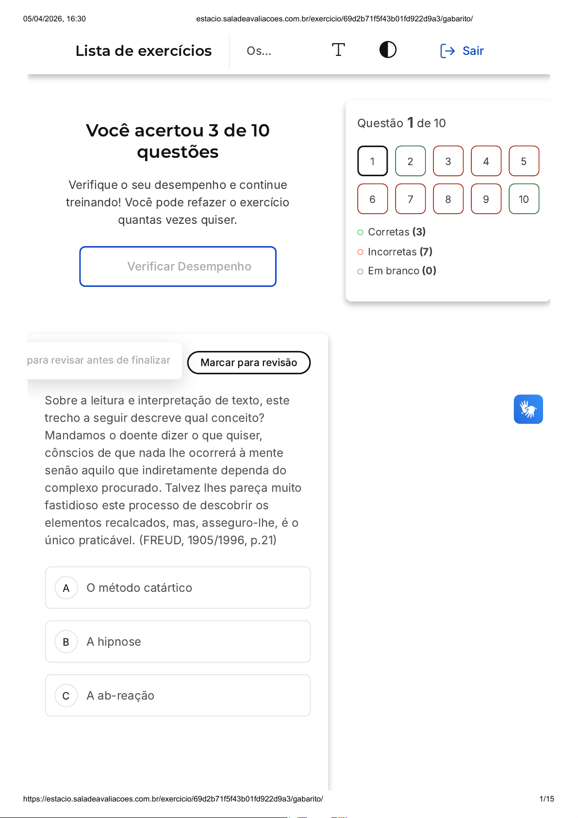 Você acertou 3 de 10 questões Verifique o seu desempenho e continue treinando! Você pode refazer o exercício quantas vezes quiser. Verificar Desempenho A B C 1 Marcar para revisãopara revisar antes de finalizar Sobre a leitura e interpretação de texto, este trecho a seguir descreve qual conceito? Mandamos o doente dizer o que quiser, cônscios de que nada lhe ocorrerá à mente senão aquilo que indiretamente dependa do complexo procurado. Talvez lhes pareça muito fastidioso este processo de descobrir os elementos recalcados, mas, asseguro-lhe, é o único praticável. (FREUD, 1905/1996, p.21) O método catártico A hipnose A ab-reação Questão 1 de 10 Corretas (3) Incorretas (7) Em branco (0) 1 2 3 4 5 6 7 8 9 10 Lista de exercícios Os… Sair 05/04/2026, 16:30 estacio.saladeavaliacoes.com.br/exercicio/69d2b71f5f43b01fd922d9a3/gabarito/ https://estacio.saladeavaliacoes.com.br/exercicio/69d2b71f5f43b01fd922d9a3/gabarito/ 1/15 D E O método anátomo-clínico O método da associação-livre Resposta correta Parabéns, você selecionou a alternativa correta. Confira o gabarito comentado! Gabarito Comentado Freud, em seu texto, está descrevendo o método da associação livre. Este método é caracterizado por permitir ao paciente expressar livremente seus pensamentos, sem censura ou direcionamento. O objetivo é que, através dessa liberdade de expressão, o paciente possa acessar e trazer à tona elementos recalcados em seu inconsciente. Freud argumenta que este é o único método praticável para descobrir tais elementos. Ele critica outros métodos, como a hipnose e o método catártico, por não permitirem que o paciente elabore a experiência traumática de forma adequada. Segundo Freud, o conteúdo traumático não está simplesmente fora da consciência, mas sim localizado no inconsciente, onde exerce efeitos sobre o ego e, consequentemente, sobre o corpo. 2 Marcar para revisão Narcisismo é um conceito que define o indivíduo que admira exageradamente a sua própria imagem e, desse modo, nutre uma 05/04/2026, 16:30 estacio.saladeavaliacoes.com.br/exercicio/69d2b71f5f43b01fd922d9a3/gabarito/ https://estacio.saladeavaliacoes.com.br/exercicio/69d2b71f5f43b01fd922d9a3/gabarito/ 2/15 A B C D E paixão excessiva por si mesmo. Sob o viés psicanalítico, o narcisismo é importante: Para a sublimação Para a psicose Para o retorno do recalcado Para a formação do sintoma Para a construção do ego e das relações sociais Resposta correta Parabéns, você selecionou a alternativa correta. Confira o gabarito comentado! Gabarito Comentado Na psicanálise, o narcisismo é visto como uma etapa crucial no desenvolvimento do ego. Inicialmente, o ego em formação é o primeiro objeto de investimento libidinal, o que é conhecido como narcisismo primário e é essencial para a formação do ego. No entanto, após a experiência do conflito edípico, parte dessa libido que estava direcionada ao ego passa a ser direcionada a objetos externos. Isso permite que o ego estabeleça relações com outros indivíduos e com a sociedade como um todo. Portanto, o narcisismo é fundamental para a construção do ego e das relações 05/04/2026, 16:30 estacio.saladeavaliacoes.com.br/exercicio/69d2b71f5f43b01fd922d9a3/gabarito/ https://estacio.saladeavaliacoes.com.br/exercicio/69d2b71f5f43b01fd922d9a3/gabarito/ 3/15 A B C D E sociais, o que justifica a alternativa E como a correta. 3 Marcar para revisão O método catártico foi utilizado por Freud especialmente na fase em que atuou com Josef Breuer. Consiste em submeter os pacientes a um procedimento terapêutico pelo qual consegue liberar, trazendo à sessão, os sentimentos e emoções reprimidos que até então estavam em algum lugar do cérebro. Ao submeter um maior número de pacientes ao método catártico, Freud constata: A eficácia do método A facilidade de se hipnotizar os enfermos A inaptidão para eliminar a causa do sintoma histérico A ausência de exigências feitas ao médico A ausência de exigências feitas aos pacientes Resposta incorreta Opa! A alternativa correta é a letra C. Confira o gabarito comentado! 05/04/2026, 16:30 estacio.saladeavaliacoes.com.br/exercicio/69d2b71f5f43b01fd922d9a3/gabarito/ https://estacio.saladeavaliacoes.com.br/exercicio/69d2b71f5f43b01fd922d9a3/gabarito/ 4/15 A B Gabarito Comentado Freud, ao aplicar o método catártico em um maior número de pacientes, percebeu que, apesar de promover a liberação de sentimentos e emoções reprimidos, o método não era eficaz para eliminar a causa do sintoma histérico. Isso ocorre porque, embora o método catártico possa proporcionar uma descarga dos afetos ligados à lembrança patogênica (uma ab- reação), ele não consegue eliminar a própria lembrança patogênica, o que permite a criação de outros sintomas. Além disso, Freud observou que nem todos os pacientes podem ser hipnotizados e que o método exige muito tanto do médico, que precisa estar altamente engajado, quanto do paciente, que precisa ter um certo nível intelectual. Portanto, a alternativa correta é a C: "A inaptidão para eliminar a causa do sintoma histérico". 4 Marcar para revisão Freud afirma que, na segunda tópica ... vemos este mesmo ego como uma pobre criatura que deve serviços a três senhores (FREUD, 1923/1996, p.30). Marque a alternativa que indica os conceitos aos quais o autor se refere. Mundo externo, libido do id e severidade do superego Consciente, pré-consciente e inconsciente 05/04/2026, 16:30 estacio.saladeavaliacoes.com.br/exercicio/69d2b71f5f43b01fd922d9a3/gabarito/ https://estacio.saladeavaliacoes.com.br/exercicio/69d2b71f5f43b01fd922d9a3/gabarito/ 5/15 C D E Neurose, psicose e perversão Regressão, recalque e sublimação Superego, id e aparelho psíquico Resposta incorreta Opa! A alternativa correta é a letra D. Confira o gabarito comentado! Gabarito Comentado Na segunda tópica, que abrange as publicações de Freud entre os anos de 1920 e 1939, o auto