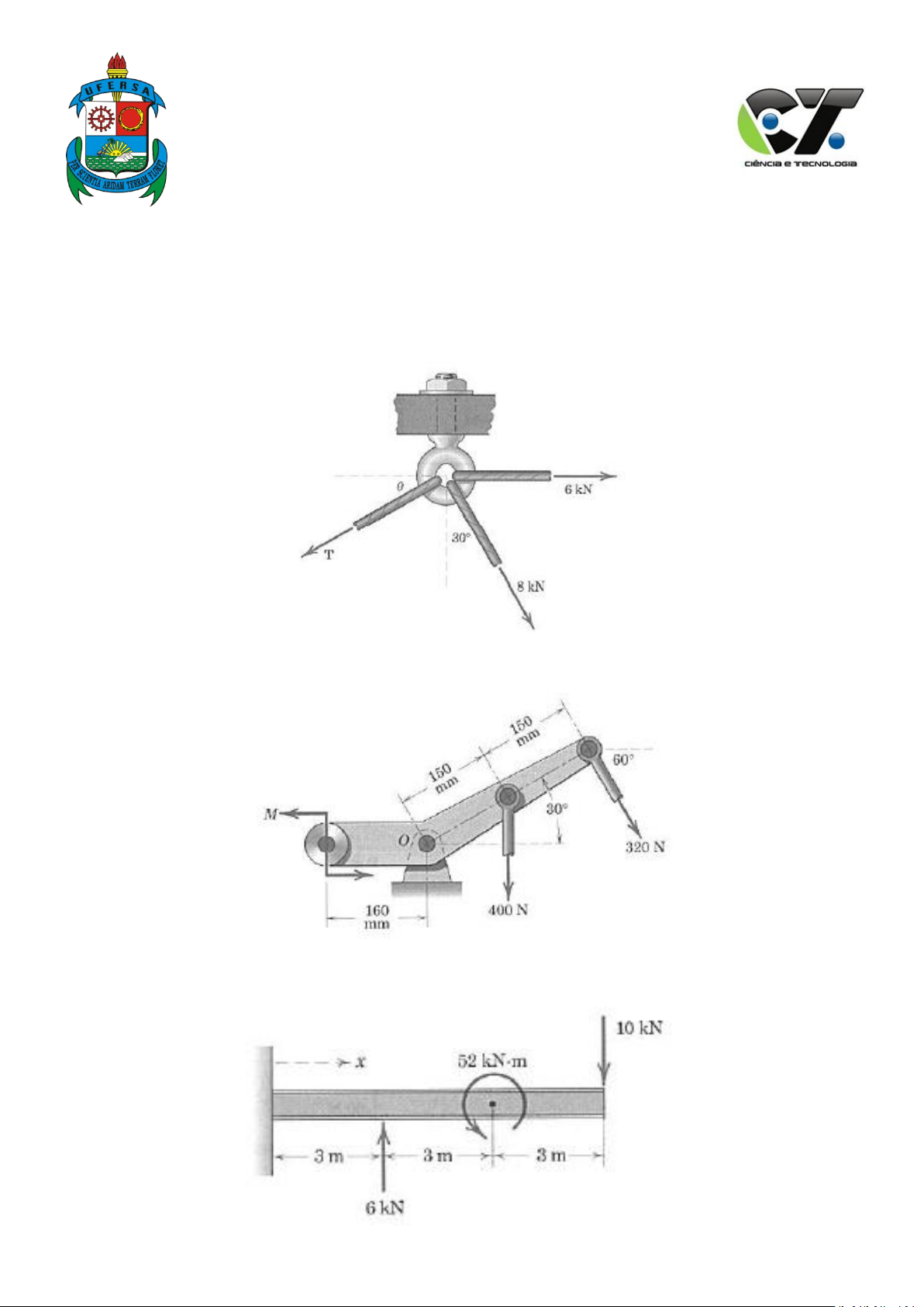 UNIVERSIDADE FEDERAL RURAL DO SEMI-ÁRIDO - UFERSA CENTROMULTIDISCPLINAR – CAMPUS ANGICOS DEPARTAMENTO DE ENGENHARIAS – DENGE INTERDISCIPLINAR EM CIÊNCIA E TECNOLOGIA – C&T ANGICOS DISCIPLINA: MECÂNICA GERAL 1 GRUPO: ________________________________________________________________________________________ 1 - Calcule o módulo da força trativa T e o ângulo Ɵ de forma que o olhal tenha uma força resultante de 15 kN direcionada para baixo. 2 - Determine M se a resultante das duas forças e do momento M passa pelo ponto O. 3 - Determine e localize a resultante R das duas forças e do momento atuando na viga em I. UNIVERSIDADE FEDERAL RURAL DO SEMI-ÁRIDO - UFERSA CENTROMULTIDISCPLINAR – CAMPUS ANGICOS DEPARTAMENTO DE ENGENHARIAS – DENGE INTERDISCIPLINAR EM CIÊNCIA E TECNOLOGIA – C&T ANGICOS DISCIPLINA: MECÂNICA GERAL 1 GRUPO: ________________________________________________________________________________________ 4 - A viga uniforme tem massa de 50 kg por metro de comprimento. Calcule as reações no apoio O. As cargas mostradas estão em um plano vertical. 5 - O dispositivo mostrado é projetado para aplicar pressão dos dois lados de uma bancada, durante a colagem do laminado próximo a borda. Se uma força de 120N é aplicada à barra, determine a força que cada rolete exerce sobre a sua superfície correspondente. 6 - Para testar a deflexão da viga uniforme de 100kg, o garoto de 50kg da um puxão de 150N na corda, como mostrado. Calcule a força suportada pelo pino na dobradiça O. UNIVERSIDADE FEDERAL RURAL DO SEMI-ÁRIDO - UFERSA CENTROMULTIDISCPLINAR – CAMPUS ANGICOS DEPARTAMENTO DE ENGENHARIAS – DENGE INTERDISCIPLINAR EM CIÊNCIA E TECNOLOGIA – C&T ANGICOS DISCIPLINA: MECÂNICA GERAL 1 GRUPO: ________________________________________________________________________________________ 7 - Determine as reações externas em A e F para a treliça de um telhado carregada como mostrado. As cargas verticais representam o efeito de sustentação dos materiais do telhado, enquanto a força de 400N representa uma carga devida ao vento. 8 - O carro completo, com seu motorista, tem uma massa de 815kg e, sem os dois aerofolios, tem uma distribuição de peso igual (50% - 50%) entre a dianteira e a traseira em uma dada velocidade na qual o carro não sofre empuxo para cima. Estima-se que nessa velocidade cada um dos aerofólios, A1 e A2 vai gerar 2kN de força direcionada para baixo, L, e 250N de força de arraste D sobre o carro. Especifique, nessa velocidade, as reações verticais N1 e N2 sob os dois pares de rodas quando os aerofólios forem colocados. Considere que a colocação dos aerofólios não afeta as condições de arraste e de empuxo para cima no carro e que o motor tem potência suficiente para manter o equilíbrio nessa velocidade. O peso do aerofólio pode ser desprezado. 9 - Um torque de 24 N.m é necessário para girar o parafuso em torno de seu eixo. Determine P e as forças entre as paredes endurecidas e lisas da chave e os vertices A e b da cabeça hexagonal do parafuso. Considere que a chave se ajusta facilmente no parafuso, de modo que o contato é feito apenas nos vértices A e B. UNIVERSIDADE FEDERAL RURAL DO SEMI-ÁRIDO - UFERSA CENTROMULTIDISCPLINAR – CAMPUS ANGICOS DEPARTAMENTO DE ENGENHARIAS – DENGE INTERDISCIPLINAR EM CIÊNCIA E TECNOLOGIA – C&T ANGICOS DISCIPLINA: MECÂNICA GERAL 1 GRUPO: ________________________________________________________________________________________ 10 - É desejavel que uma pessoa seja capaz de iniciar o fechamento da porta do bagageiro de uma van, desde a posição aberta mostrada, com uma força vertical P de 40N. Como um exercício de projeto, determine a força necessária em cada um dos amortecedores hidráulicos AB. O centro de massa da porta de 40kg está a 37,5 mm diretamente abaixo do pono A. Trate o problema como bidimensional.
