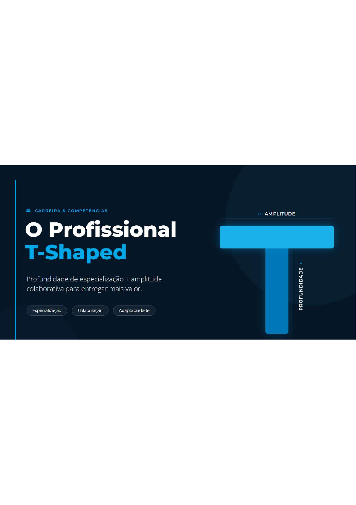 CARREIRA & COMPETÊNCIAS AMPLITUDE Profissional T-Shaped Profundidade de especialização + amplitude colaborativa para entregar mais valor. PROFUNDIDADE Especialização Colaboração AdaptabilidadeCONCEITO FUNDAMENTAL A metáfora do T: profundidade + amplitude AMPLITUDE COLABORATIVA Barra Horizontal (Amplitude) Empatia Linguagem Comum Curiosidade Capacidade de colaborar entre diferentes disciplinas com empatia. É "cimento" que une time e permite entender contexto de outras áreas. Design Dados Barra Vertical (Profundidade) PROFUNDIDADE DE ESPECIALIZAÇÃO Engenharia Expertise técnica sólida e hard skills em uma disciplina específica. É que permite ao profissional entregar trabalho de alta Produto qualidade e execução. "O valor real está na combinação: contribuir com excelência individual enquanto se colabora ativamente, eliminando a formação de silos."IMPACTO & VALOR Por que importa para "Quem combina profundidade com colaboração gera mais valor sistêmico." pessoas e empresas Menos silos 01 Mais agilidade 02 Mais integração entre áreas e decisões melhores. Reduz handoffs e cobre tarefas adjacentes. Equipes conhecimento flui livremente, evitando gargalos conseguem se auto-organizar e responder mais de informação. rápido a mudanças. Mais inovação 03 Mais carreira 04 Combina perspectivas diversas para resolver Aumenta empregabilidade, mobilidade e impacto problemas complexos. A interseção de saberes é end-to-end. Profissionais adaptáveis são mais onde novo acontece. valorizados.AÇÃO & Como desenvolver seu 1 Mapear sua especialidade Identifique sua profundidade atual e lacunas de amplitude. Boas Práticas 2 Aprender áreas adjacentes Cross-training nos pontos de handoff Estude básico das disciplinas com quem você mais colabora. Aprendizado sob demanda (just-in-time) 3 Entrar em projetos interfuncionais Busque experiências práticas fora do seu silo habitual. Dar visibilidade aos "spikes" de expertise 4 Treinar soft skills Empatia, escuta ativa e comunicação para traduzir complexidade. FONTES & REFERÊNCIAS 5 Revisar progresso " Tim Brown / IDEO CEO Use feedback 360° e mentoria para calibrar seu crescimento. " Forbes - Lisa Bodell (2020) " McKinsey - Ops 4.0: The Human Factor (2021)