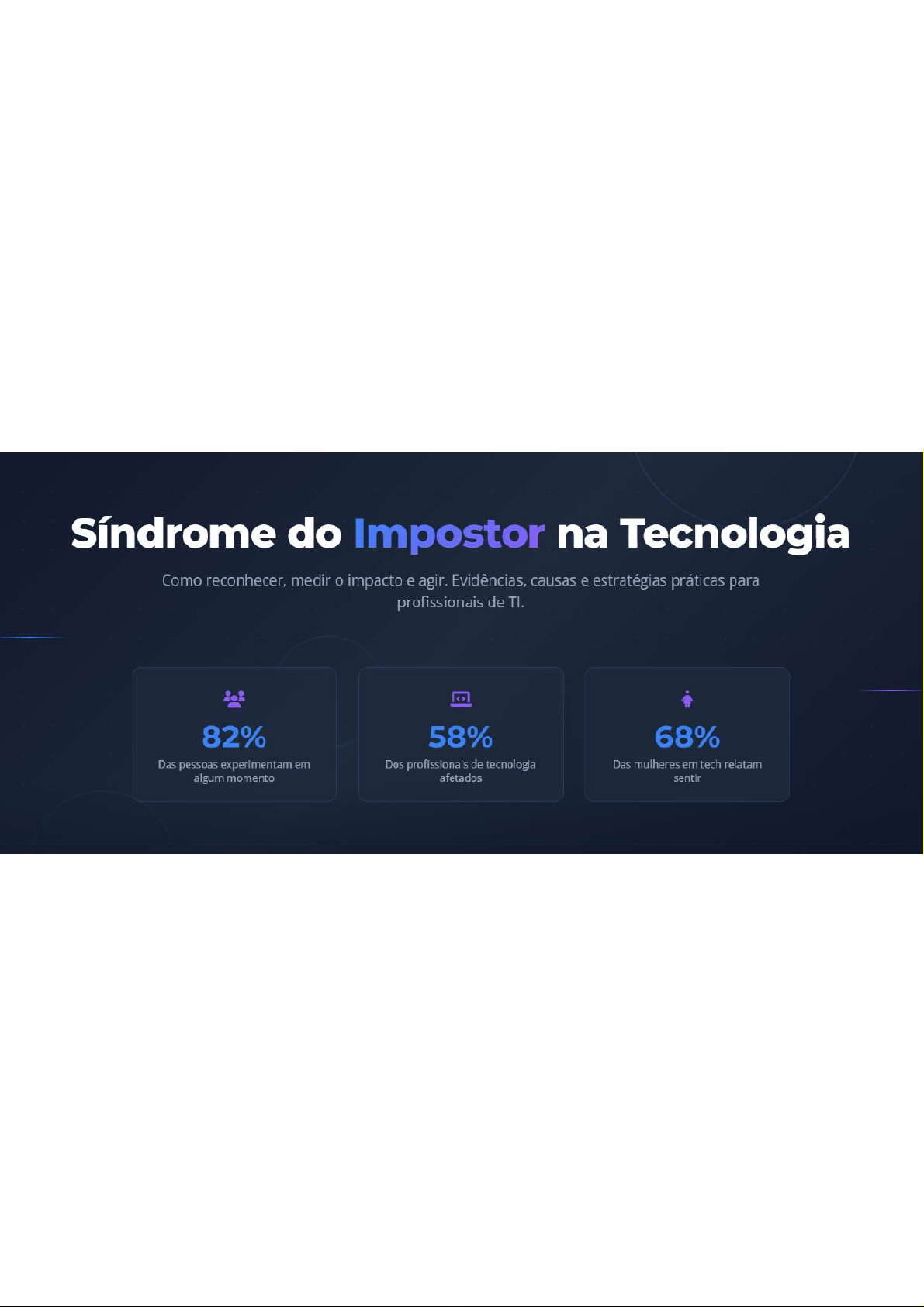 Síndrome do Impostor na Tecnologia Como reconhecer, medir impacto e agir. Evidências, causas e estratégias práticas para profissionais de 82% 58% 68% Das pessoas experimentam em Dos profissionais de tecnologia Das mulheres em tech relatam algum momento afetados sentirTechMind Que é e Quão Comum é ? que é Síndrome do Impostor? Prevalência por Gênero em Tech É um fenômeno psicológico em que duvidam de suas Mulheres Homens realizações e têm medo interno de serem expostos como fraudes 68% 61% Apesar das evidências externas de competência, quem experimenta essa 80 síndrome acredita que não merece seu sucesso. 70 60 Características principais: Autossubestimação, atribuição de sucessos 50 à sorte, medo de falha, dificuldade em aceitar elogios. 40 30 20 10 0 Mulheres Homens 82% 58% 75% Das pessoas Dos profissionais de Das executivas afetadas experimentam em tech afetados algum momentoTechMind Por Que é Tão Comum em Tecnologia setor de tecnologia apresenta características únicas que amplificam a síndrome do impostor A combinação de mudanças rápidas, alta visibilidade dos erros e cultura de comparação cria um ambiente propício para a autossubestimação. Mudança Tecnológica Perfeccionismo Sub-representação Comparação Social Cultura de Revisão Atualização constante e Erros são visiveis e públicos, Mulheres e minorias sentem Redes sociais mostram apenas PRs e code reviews amplificam a necessidade de aprender novas criando pressão por excelência pressão extra para provar valor sucessos, criando distorção autocobrança ferramentas rapidamente 82% 68% 45% 38% Sentem pressão por mudanças Evitam compartilhar código ansiedade crônica Experienciam burnoutTechMind Impactos na Carreira e Saúde Mental Comportamentos Evitativos Consequências na Saúde Evitar candidaturas Ansiedade Burnout Não se candidatar a vagas ou promoções por medo de não ser qualificado Aumerito de 45% em casos de ansledade 38% dos experienciam crônica burnout Esconder erros 45% 38% Tentar corrigir problemas sozinho sem pedir ajuda Procrastinação Depressão Insônia Adiar tarefas importantes por medo de falhar 32% relatam sintomas depressivos 28% têm problemas de sono Overworking 32% 28% Trabalhar excessivamente para "provar valor"TechMind Como Superar Síndrome do Impostor Estratégias para Indivíduos Ações Organizacionais Ações que você pode tomar pessoalmente Mudanças que empresas podem implementar Busque mentoria Modelos diversos Conversas abertas Conecte-se com mentores que já navegaram desafios similares Promova profissionais diversos como Normalize discussões sobre a sindrome referência Documente conquistas Mantenha registro de realizações e feedbacks positivos Feedback claro Celebração Aprendizado contínuo objetivos de avaliação Rituais de celebração de marcos Adote mentalidade de crescimento e metas SMART Cuidado mental Procure apolo terapêutico se necessário