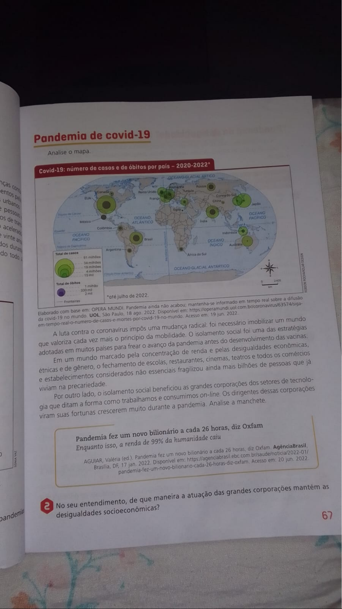 Pandemia de covid-19 Analise mapa. Covid-19: número de casos e de óbitos por país 2020-2022* Canada Unido Turquia EUA França do China Egito Japão México OCEANO OCEANO ATLÁNTICO India PACIFICO OCEANO PACIFICO Brasil OCEANO Total de casos Argentina INDICO 91 milhões do Sul 34 milhões 19 milhões 4 milhões OCEANO GLACIAL 15 mil Total de óbitos 1 milhão 330 mil 0 2405 2 mil ROBSON ROCHA/K2LAB DESIGN km Fronteiras julho de 2022. Elaborado com base em: OPERA MUNDI. Pandemia ainda não acabou; mantenha-se informado em tempo real sobre a difusão da covid-19 no mundo. UOL, São Paulo, 18 2022. Disponível em: em-tempo-real-o-numero-de-casos-e-mortes-por-covid-19-no-mundo. Acesso em: 19 jun. A luta contra coronavírus impôs uma mudança radical: foi necessário imobilizar um mundo que valoriza cada vez mais princípio da mobilidade. isolamento social foi uma das estratégias adotadas em muitos países para frear o avanço da pandemia antes do desenvolvimento das vacinas. Em um mundo marcado pela concentração de renda e pelas desigualdades econômicas, étnicas e de gênero, fechamento de escolas, restaurantes, cinemas, teatros e todos comércios e estabelecimentos considerados não essenciais fragilizou ainda mais bilhões de pessoas que já viviam na precariedade. Por outro lado, o isolamento social beneficiou as grandes corporações dos setores de tecnolo- gia que ditam a forma como trabalhamos e consumimos on-line. Os dirigentes dessas corporações viram suas fortunas crescerem muito durante a pandemia. Analise a manchete. Pandemia fez um novo bilionário a cada 26 horas, diz Oxfam Enquanto isso, a renda de 99% da humanidade caiu AGUIAR, Valéria (ed.). Pandemia fez um novo bilionário a cada 26 horas, diz Oxfam. AgênciaBrasil, DF, 17 jan. 2022. Disponível em: em: 20 jun. 2022. 2 No seu entendimento, de que maneira a atuação das grandes corporações mantém as desigualdades socioeconômicas? 67A intensa disseminação da cultura dos países centrais não extinguiu as culturas locais nem uniformizou totalmente hábitos e valores. Muitos povos continuam mantendo e transmitindo suas tradições e seus valores de geração em geração. Por isso, pode-se dizer que existem formas de resistência à homogeneização cultural e que é fundamental valorizar e respeitar culturas tradicionais. Em alguns países europeus há importante empenho em fortalecer a identidade cultural de diferentes povos, por exemplo, por meio do ensino de idiomas e culturas regionais. Na França, há uma lei que garante que as escolas podem ensinar, além do francês, linguas como bretão e basco. É muito comum, em toda a Europa, encontrar placas de sinalização bilingues no idioma oficial do país e no idioma regional. Analise a imagem. Préfecture Kuzul Conseil Général Le Port Ar Porzh P Sinalização em francês e bretão, idioma falado no região de Franço, 2022. 4 Associe as placas ao posicionamento dos países em relação às minorias cultu- rais presentes em seu território. A cultura de um povo é permeada de valores, morais, éticos e religiosos, hábitos e regras. A troca e a integração de elementos entre culturas distintas são um processo dinâmico e gradual. No mundo globalizado, essa integração resulta em uma diversificação cultural. No entanto, algumas culturas são mais "preservadas" do que outras por variados motivos: isolamento geográfico, como ocorre com certos povos tradicionais; pouca abertura e tolerância em relação às culturas diferentes; exclusão digital, pois, apesar do aumento do número de usuários da internet, bilhões de pessoas seguem impossibilitadas de acessar tecnologias que permitem contato com outras culturas. 57NÃO ESCREVA GLOBALIZAÇÃO NO 2 LINGUA A inte E CULTURA tradições e Por iss é Em Converse com os colegas e professor sobre as questões a seguir. diferentes uma lei que 1 A imagem a seguir é uma "nuvem de palavras", com termos em inglês. Você compre basco. É ende significado delas? Explique. oficial do p HOTDOG DRIVETHRU VIDEOGAME DELIVERY LIGHT HAMBURGER BACKUP FAKENEWS FITNESS DIET MIX KETCHUP EMAIL SELFIE 2 Você usa ou já usou alguma dessas palavras em seu dia a dia? Você saberia indica outras palavras e frases em estrangeiras que foram incorporadas no cotidiano dos brasileiros? 3 Além de palavras em outros idiomas, identifique em seus hábitos outras influências culturais estrangeiras. A globalização permite maior interação entre diferentes culturas, facilitada pela evolução dos meios de comunicação e de transporte. Por outro lado, também dissemina valores, Assoc hábitos, impondo padrões de consumo e comportamento, influenciando a forma como rais p nos alimentamos, nos vestimos, nos divertimos etc. A cult Um exemplo é amplo uso da língua inglesa, que ocorre à medida que diferentes culturas e regras. A passam a incorporar palavras dessa língua. Outro exemplo é consumo de produções culturas e gradual. de diversos países, como filmes, séries e músicas, por meio de redes entanto, al sociais e de plataformas digitais por streaming. Streaming: tecnologia isolame É possível dizer também que boa parte dos hábitos alimentares e que permite a transmissão de vestuário é bastante semelhante em diversos países. Esse fenômeno instantânea de dados pouca pode ser explicado, entre outros fatores, pela instalação de empresas de áudio e sem exclusã multinacionais de entretenimento, de moda e de alimentação ou pela precisar fazer download pessoas dos conteúdos ampliação do comércio internacional desses produtos. culturas on-line. 563 GLOBALIZAÇÃO: CONTRADIÇÕES E DESIGUALDADES Dist Ar geral, a Analise a charge. De acordo com a OXFAM, 62 pessoas possuem 50% da riqueza mundial. Mund CHAMPANHE Trópico PARA A METADE DO MUNDO! Equador BADO Responda às questões em seu caderno. 1 Que título você daria à charge? 2 No seu entendimento, a globalização apresenta mais aspectos positivos ou negativ Elaborad 