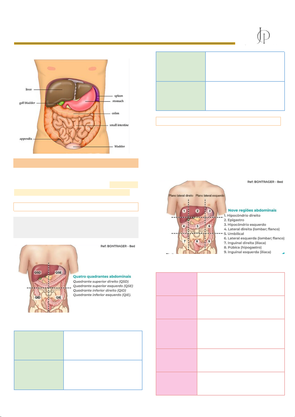 Júlia Pacheco-Medicina Anatomia do Abdome Topografia do abdome É fundamental para localização de órgãos e correlação com sinais e sintomas clínicos, podendo ser dividida em quadrantes ou em regiões anatômicas. Quadrantes do abdome A divisão em quadrantes é baseada em duas linhas principais, sendo uma linha transumbilical horizontal e uma linha mediana vertical, formando quatro quadrantes: Quadrante superior direito Contém principalmente fígado, vesícula biliar e duodeno Quadrante superior esquerdo Contém estômago, baço e pâncreas Quadrante inferior direito Se localizam o ceco e o apêndice Quadrante inferior esquerdo Se encontra o cólon sigmoide Divisão em regiões A divisão em nove regiões utiliza: ➔ 2 linhas Médio-claviculares verticais ➔ 2 linhas horizontais (subcostal e intertubercular) Hipocôndrio direito Fígado e vesícula Epigástrio Estômago e Pâncreas Hipocôndrio esquerdo Baço e Estômago Flanco direito Rim direito e Cólon ascendente Região umbilical Intestino delgado e Grandes vasos Flanco esquerdo Rim esquerdo e Cólon descendente Fossa ilíaca direita Ceco e Apêndice Hipogástrio Bexiga e Útero Fossa ilíaca esquerda Cólon sigmoide Esses marcos anatômicos são fundamentais na prática clínica, especialmente durante inspeção, palpação, percussão e ausculta, permitindo correlacionar dor abdominal com possíveis órgãos acometidos. Parede Abdominal ➔ Proteção das vísceras ➔ Estabilização postural ➔ Respiração Sendo dividida em parede anterolateral e posterior. Parede anterolateral Limite superior cartilagens das VII a X costelas e o processo xifoide do esterno; Limite inferior ligamento inguinal + margens superiores das faces anterolaterais do cíngulo do membro inferior (cristas ilíacas, cristas púbicas e sínfise púbica) O limite entre a parede anterior e lateral não são bem definidos e por isso se chama parede anterolateral. Camadas ➔ Pele (epiderme e derme); ➔ Tecido celular subcutâneo (tela subcutânea) ◆ Composto pela fáscia de Camper- Panículo adiposo (superficial , com gordura vascularizada e de difícil visualização) ◆ Também composto pela fáscia de Scarpa (mais espessa, facilmente identificável sobre a superfície do m. oblíquo externo) Os músculos da parede anterolateral Músculo oblíquo externo do abdome Origem costela 5-12 Inserção linha alba, tubérculo púbico e crista ilíaca Inervação Nervos toracoabdominais (nervos espinais T7– T11) e nervo subcostal Função Comprime e sustenta as vísceras abdominais; flexiona e roda o tronco Músculo oblíquo interno Origem fáscia toracolombar, crista ilíaca Inserção costelas 10-12, linha alba, linha pectínea Inervação Nn. toracoabdominais (ramos anteriores dos nervos espinais T6 – T12) e primeiros nervos lombares Função Esse músculo funciona como a borda superior do canal inguinal Músculo transverso do abdome Origem 7-12 cartilagens costais, aponeurose toracolombar, crista ilíaca Inserção linha alba, aponeurose do oblíquo interno, linha pectínea Inervação Nn. toracoabdominais (ramos anteriores dos nervos espinais T6 – T12) e primeiros nervos lombares Função Compressão visceral e estabilização da coluna, sendo extremamente importante na formação da bainha do reto abdominal e em processos de hérnias Músculo reto do abdome Origem sínfise e crista púbica Inserção processo xifoide, 5 -7 cartilagens costais Inervação Nn. toracoabdominais (ramos anteriores dos nervos espinais T6 – T12) Função Responsável pela flexão do tronco e estabilização pélvica, estando associado clinicamente à diástase abdominal e às incisões cirúrgicas Músculo piramidal: pequeno e triangular, nem sempre presente, cuja função é tensionar a linha alba. Linha alba: ➔ Confluência das fáscias dos músculos oblíquos abdominais na linha média, aponeurose que se estende do apêndice xifoide ao púbis. Dá passagem a pequenos vasos e nervos para a pele Bainha do músculo reto do abdome: É um compartimento fibroso que contém as artérias + veias epigástricas superior es e inferiores + partes distais dos nervos toracolombar Parede posterior Formação: ➔ Vértebra da lombares ➔ Músculos ➔ Diafragma ➔ Fáscia ➔ Plexo lombar ➔ Gordura ➔ nervos ➔ linfonodos ➔ vasos. Os músculos da parede posterior Quadrado do lombo Conecta a última costela à pelve e atua na estabilização da pelve e flexão lateral da coluna. Psoas maior Origem vértebras lombares Inserção trocânter menor do fêmur Função Flexão do quadril e estabilização postural, além de estar envolvido no sinal do psoas positivo em casos de apendicite retrocecal. Psoas menor ➔ Pode estar ausente em algumas pessoas ➔ Quando presente, auxilia na flexão lombar. Músculo ilíaco ➔ Localiza-se na fossa ilíaca e, junto com o psoas maior, forma o músculo iliopsoas, principal flexor do quadril. Peritônio O peritônio é uma membrana serosa que reveste a cavidade abdominal e as vísceras. Sendo dividido em: peritônio parietal e visceral. As funções do peritônio incluem: ➔ Proteção ➔ Sustentação das vísceras ➔ Condução de vasos e nervos ➔ Participação em processos imunológicos e inflamatórios. Cavidade peritoneal É o espaço potencial entre as camadas parietal e visceral, contendo pequena quantidade de líquido seroso que reduz o atrito entre as vísceras. Diferenças anatômicas entre os sexos Homens Cavidade peritoneal completamente fechada Mulheres Cavidade peritoneal comunicante com o meio externo nas mulheres através das tubas uterinas Nas mulheres existem implicações clínicas importantes como a disseminação de infecções. Relação entre o peritônio e as vísceras A relação entre o peritônio e as vísceras permite classificá-las em intraperitoneais, retroperitoneais e subperitoneais. Vísceras intraperitoneais ➔ São completamente revestidas por peritônio ➔ Possuem mesentério ◆ O que l