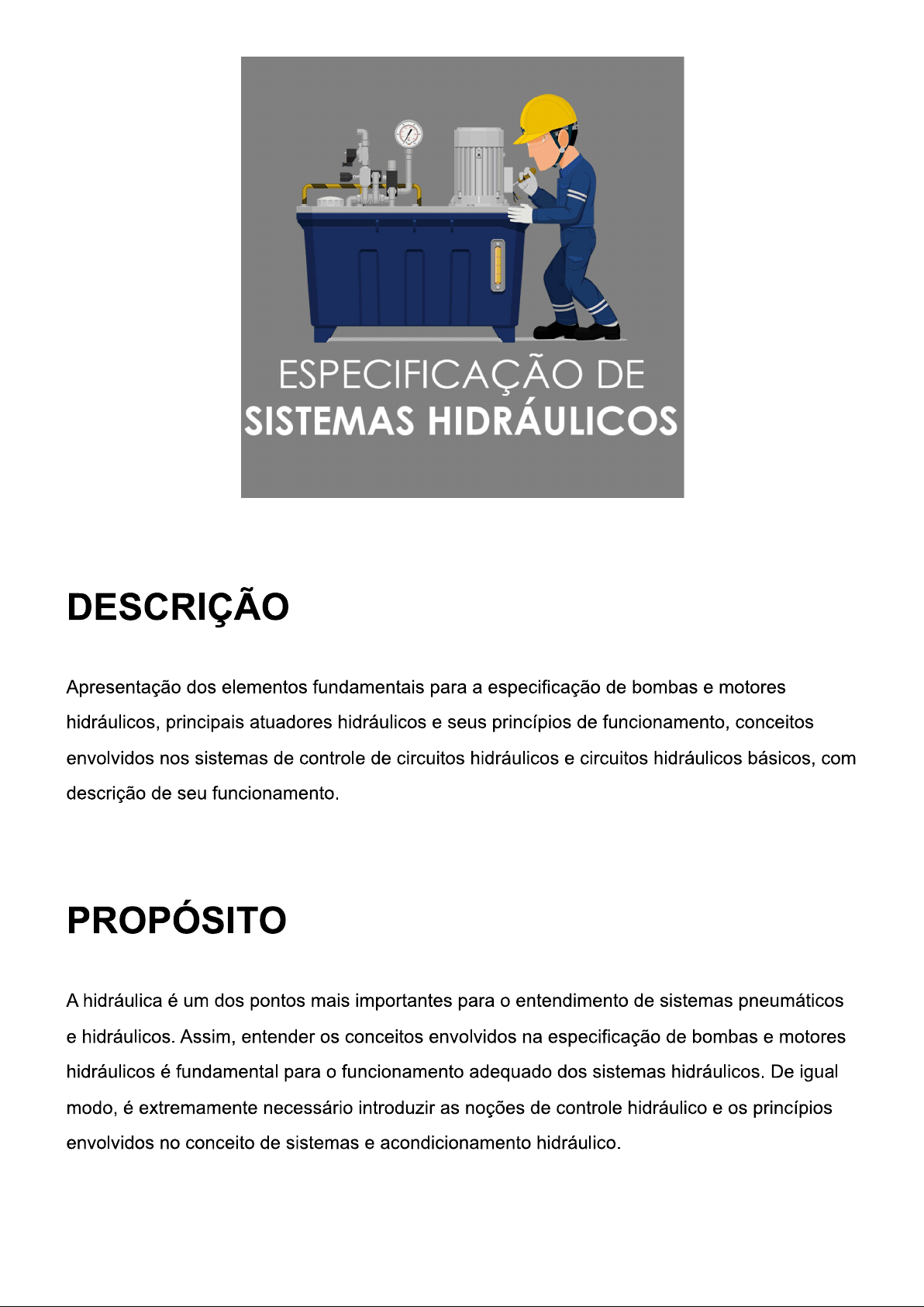 ESPECIFICAÇÃO DE SISTEMAS HIDRÁULICOS DESCRIÇÃO Apresentação dos elementos fundamentais para a especificação de bombas e motores hidráulicos, principais atuadores hidráulicos e seus princípios de funcionamento, conceitos envolvidos nos sistemas de controle de circuitos hidráulicos e circuitos hidráulicos básicos, com descrição de seu funcionamento. PROPÓSITO A hidráulica é um dos pontos mais importantes para entendimento de sistemas pneumáticos e hidráulicos. Assim, entender os conceitos envolvidos na especificação de bombas e motores hidráulicos é fundamental para funcionamento adequado dos sistemas hidráulicos. De igual modo, é extremamente necessário introduzir as noções de controle hidráulico e os princípios envolvidos no conceito de sistemas e acondicionamento hidráulico.PREPARAÇÃO Antes de iniciar o estudo deste conteúdo, tenha em mãos papel, caneta e uma calculadora ou use a calculadora de seu smartphone ou computador. OBJETIVOS MÓDULO 1 Descrever as principais características necessárias à especificação de bombas e motores hidráulicos MÓDULO 2 Identificar os principais atuadores hidráulicos e suas características MÓDULO 3 Descrever os principais elementos utilizados no controle e no acionamento de sistemas hidráulicos MÓDULO 4 Identificar a estrutura básica de um circuito hidráulico e seu princípio de funcionamentoINTRODUÇÃO II ESPECIFICAÇÃO DOS SISTEMAS HIDRÁULICOS Para assistir a um vídeo sobre assunto, acesse a versão online deste conteúdo. AVISO: orientações sobre unidades de medida.AVISO Em nosso material, unidades de medida e números são escritos juntos (ex.: 25km) por questões de tecnologia e didáticas. No entanto, o Inmetro estabelece que deve existir um espaço entre número e a unidade (ex.: 25 km). Logo, os relatórios técnicos e demais materiais escritos por você devem seguir o padrão internacional de separação dos números e das unidades. MÓDULO 1 Descrever as principais características necessárias à especificação de bombas e motores hidráulicosA IMPORTÂNCIA DAS BOMBAS PARA SISTEMAS HIDRÁULICOS Para assistir a um vídeo sobre assunto, acesse a versão online deste conteúdo. IMPORTÂNCIA DAS BOMBAS HIDRÁULICAS As bombas são elementos fundamentais para os circuitos hidráulicos e são, provavelmente, os componentes mais importantes dos sistemas. Elas são responsáveis pela conversão da energia mecânica em energia hidráulica. Como isso acontece?RESPOSTA Isso é possível por meio do bombeamento do óleo armazenado em um tanque ou reservatório para o interior do circuito hidráulico. Existem diversos tipos de bombas. Cada uma possui suas particularidades e especificações, variando quanto ao tamanho, à capacidade, ao formato e ao princípio de funcionamento. As bombas podem ser manuais ou mecânicas, com tipos distintos de mecanismos de bombeamento e tipos específicos para aplicações distintas. PRINCÍPIO DE FUNCIONAMENTO princípio de funcionamento simplificado das bombas consiste na produção de vácuo na entrada da bomba a partir de uma ação mecânica. Esse vácuo faz com que a pressão na entrada da bomba se torne menor do que a pressão do ar atmosférico. Dessa maneira, a pressão do ar empurra o óleo para dentro da bomba, produzindo um movimento chamado de linha de sucção. Depois que óleo entra na bomba, ele é forçado a sair através dos componentes mecânicos da bomba, produzindo um fluxo hidráulico da entrada em direção à saída. fluido é transportado através da carcaça 2 em câmaras formadas entre os dentes e a superfície lateral da carcaça vácuo é criado quando os dentes se desengrenam 1 gerando sucção SUCÇÃO RECALQUE 3 fluido é forçado para a abertura de saída Imagem: Wortecbombas. Funcionamento de uma bomba. As bombas podem ser classificadas, essencialmente, em duas categorias: hidrodinâmicas e hidrostáticas. Veja a seguir mais informações.BOMBAS HIDRODINÂMICAS Esse tipo de bomba é também chamado de bomba de deslocamento dinâmico. Em seu funcionamento, utiliza um rotor com uma hélice acoplada capaz de produzir uma força centrífuga no fluido. Dessa maneira, ao entrar na bomba, fluido é expelido por esse rotor para a saída, em alta velocidade. Por esse motivo, esse rotor também é chamado de impulsor. Um problema associado a esse tipo de bomba é a falta de vedação ideal entre a entrada e a saída, o que permite a entrada de ar e, consequentemente, aumento da resistência ao fluxo e redução da vazão. Por não haver uma vedação adequada, a pressão também depende da rotação. Pelos motivos apresentados anteriormente, as bombas hidrodinâmicas são empregadas apenas em transferências de fluidos entre reservatórios ou tanques, ou seja, de um local para outro, de modo que as resistências ao fluxo são atribuídas ao próprio peso do fluido e ao atrito. Entrada Saída Lâminas do impulsor (a) (b) Imagem: Raphael de Souza dos Santos. Símbolo diagramático das bombas hidrodinâmicas (a) e ilustração de uma bomba hidrodinâmica (b). BOMBAS HIDROSTÁTICAS Diferentemente das bombas hidrodinâmicas, as bombas hidrostáticas apresentam uma boa vedação entre a entrada e a saída, que garante uma capacidade de bombeamento (volume de fluido bombeado) constante para cada rotação ou ciclo de bombeamento. Por esse motivo, também são chamadas de bombas de deslocamento positivo.A vedação adequada faz com que bombeamento seja constante, independentemente da resistência do fluido. Isso também faz com que essas bombas suportem pressões superiores às que as bombas hidrodinâmicas conseguem suportar, tornando-as adequadas para a transmissão de força. Essa capacidade de transmissão de força torna as bombas hidrostáticas mais adequadas para sistemas hidráulicos industriais do que as bombas hidrodinâmicas. DETERMINAÇÃO DA VAZÃO DE UMA BOMBA deslocamento (Geralmente, o deslocamento de uma bomba é fornecido pelo fabric