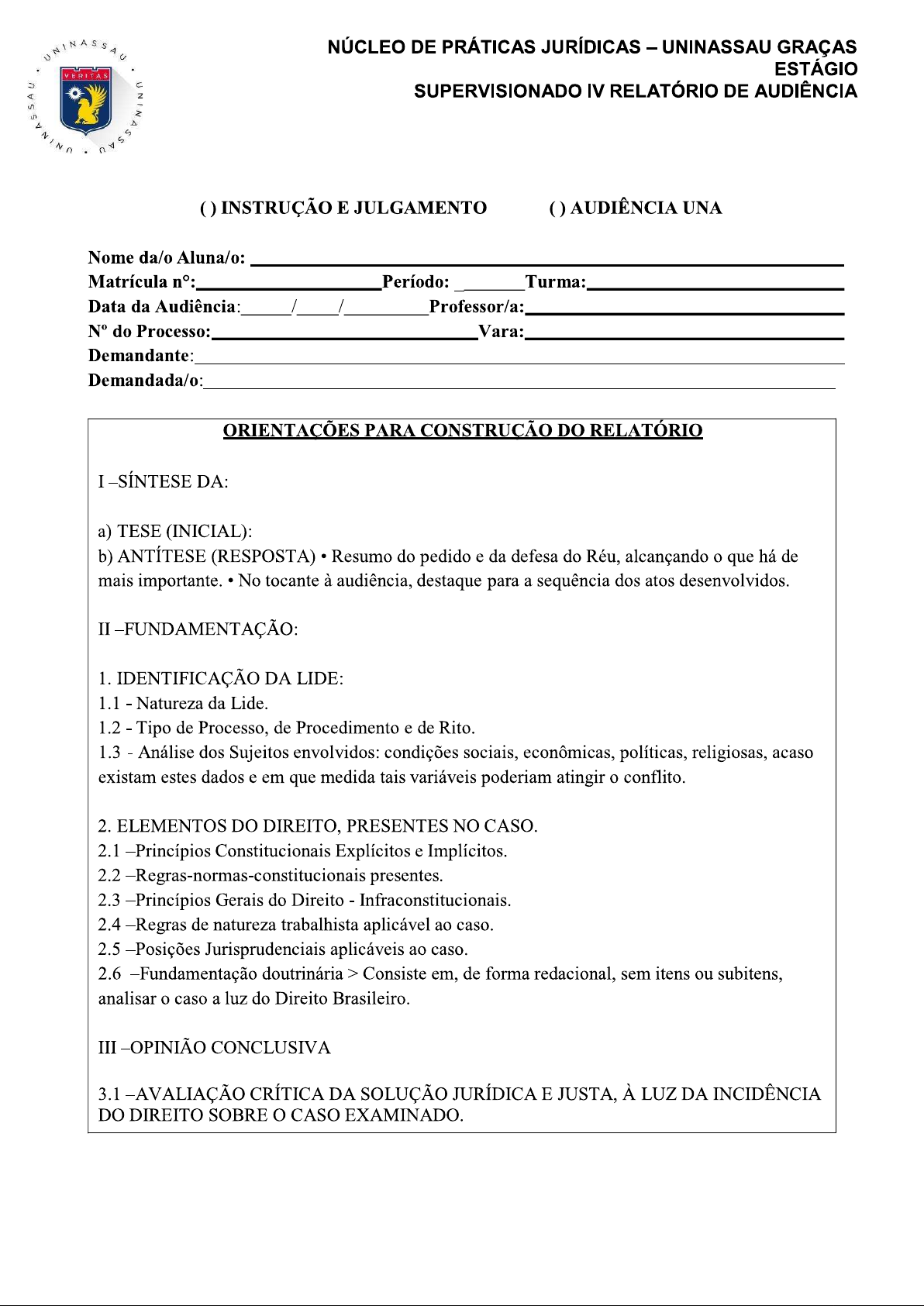 UNINASSAU NÚCLEO DE PRÁTICAS JURÍDICAS - UNINASSAU GRAÇAS ESTÁGIO VERITAS SUPERVISIONADO IV RELATÓRIO DE AUDIÊNCIA INSTRUÇÃO E JULGAMENTO AUDIÊNCIA UNA Nome da/o Aluna/o: Matrícula n°: Período: Turma: Data da Audiência: / / Professor/a: do Processo: Vara: Demandante: Demandada/o: ORIENTAÇÕES PARA CONSTRUÇÃO DO RELATÓRIO I -SÍNTESE DA: a) TESE (INICIAL): b) ANTÍTESE (RESPOSTA) Resumo do pedido e da defesa do Réu, alcançando o que há de mais importante. No tocante à audiência, destaque para a sequência dos atos desenvolvidos. II -FUNDAMENTAÇÃO: 1. IDENTIFICAÇÃO DA LIDE: 1.1 Natureza da Lide. 1.2 Tipo de Processo, de Procedimento e de Rito. 1.3 Análise dos Sujeitos envolvidos: condições sociais, econômicas, políticas, religiosas, acaso existam estes dados e em que medida tais variáveis poderiam atingir o conflito. 2. ELEMENTOS DO DIREITO, PRESENTES NO CASO. 2.1 -Princípios Constitucionais Explícitos e Implícitos. 2.2 -Regras-normas-constitucionais presentes. 2.3 -Princípios Gerais do Direito 2.4 -Regras de natureza trabalhista aplicável ao caso. 2.5 -Posições Jurisprudenciais aplicáveis ao caso. 2.6 -Fundamentação doutrinária > Consiste em, de forma redacional, sem itens ou subitens, analisar o caso a luz do Direito Brasileiro. III -OPINIÃO CONCLUSIVA 3.1 -AVALIAÇÃO CRÍTICA DA SOLUÇÃO JURÍDICA E JUSTA, À LUZ DA INCIDÊNCIA DO DIREITO SOBRE O CASO EXAMINADO.UNINASSAU NÚCLEO DE PRÁTICAS JURÍDICAS - UNINASSAU GRAÇAS VERITAS ESTÁGIO SUPERVISIONADO IV RELATÓRIO DE AUDIÊNCIA SÍNTESE DA INICIAL ANTÍTESE FUNDAMENTAÇÃO ELEMENTOS DO DIREITOUNINASSAU VERITAS NÚCLEO DE PRÁTICAS JURÍDICAS - - UNINASSAU GRAÇAS UNINA ESTÁGIO SUPERVISIONADO IV RELATÓRIO DE AUDIÊNCIA OPINIÃO CONCLUSIVA